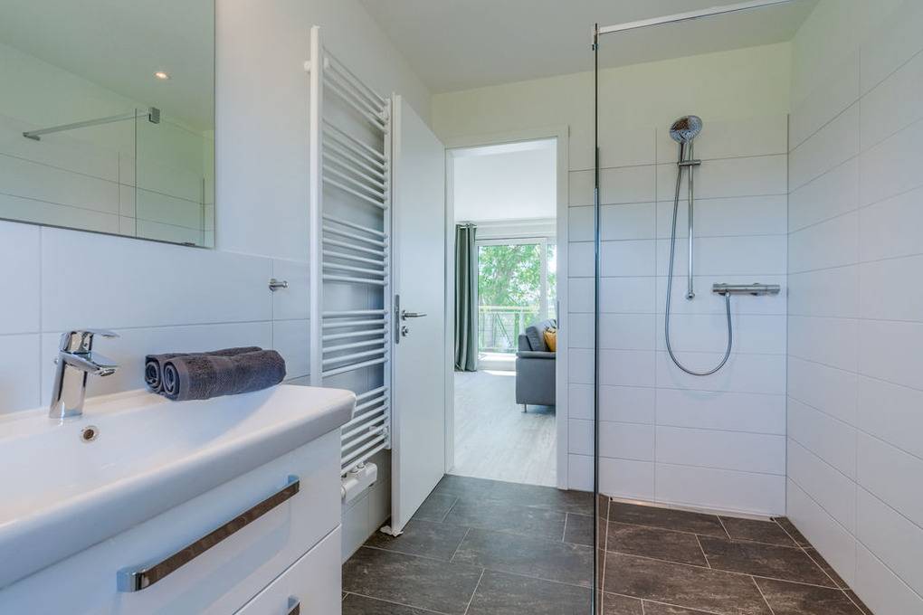 Dieses Erlebnis können Sie aber auch naturnah auf dem Balkon genießen, dessen Geräumigkeit durch die windschützende Glasumrandung unterstrichen wird. Hier warten ein Tisch und bequeme Gartenstühle auf Ihre Auszeit.