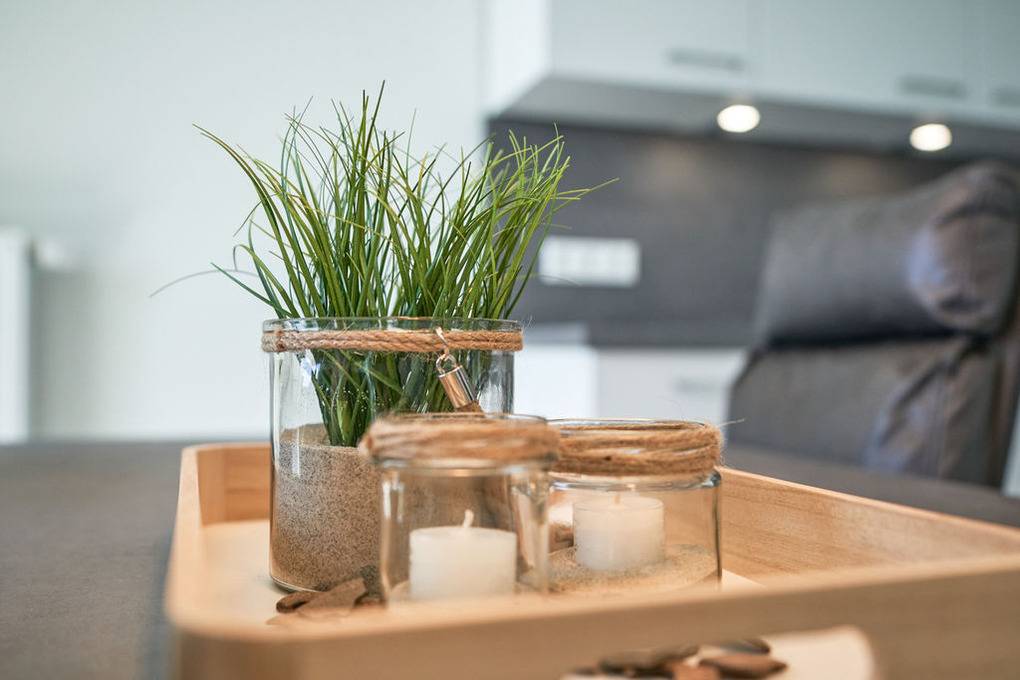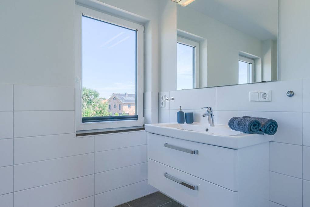 In der modernen Küchenecke bringt das Zubereiten der Speisen in der Gruppe Freude. Eine eingebaute Geschirrspülmaschine übernimmt anschließend den Abwasch, während Sie bei einem Wein auf dem Balkon den Tag Revue passieren lassen. Die Glasumrundung des Balkons schützt vor frischen Winden und lässt den Blick frei auf die wunderschöne Eider.