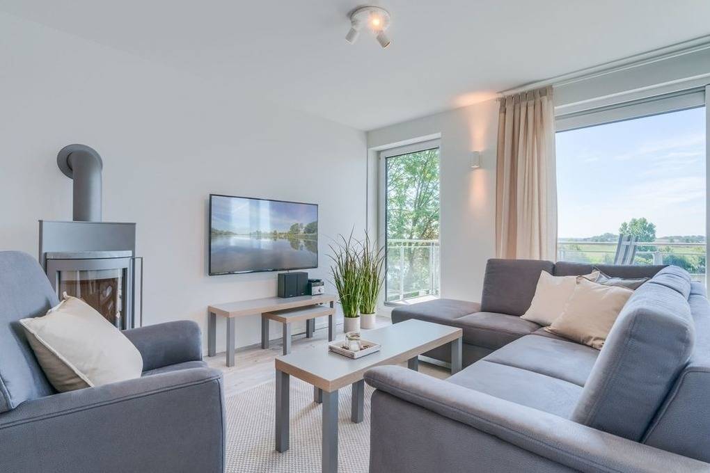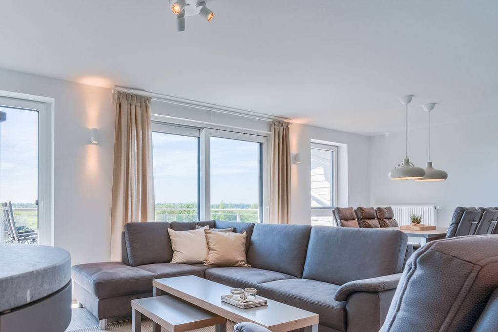 Nach Betreten des Eingangsflurs öffnet sich die nach Süden ausgerichtete Wohnung zu einem großzügigen Tagesraum, der mit seiner bequemen Sitzgarnitur vor dem Kaminofen und dem Flat-TV zum Wohlfühlen einlädt. Der lichtdurchflutete Wohn-/ Essbereich erlaubt durch die bodentiefen Fenster einen herrlichen Blick auf den nahen Sandstrand, die Eider und über das angrenzende, kaum bebaute Weideland bis in die weite Ferne.
