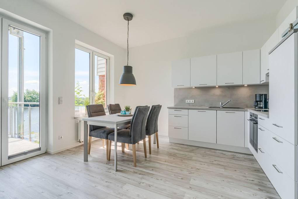 Durch einen hellen Vorflur gelangen Sie in den Wohnraum. Es erwartet Sie ein großzügig gestaltetes Wohnkonzept in hellen freundlichen Tönen und einer modernen Einbauküche. Hier wurde bei der Farb- und Möbelwahl konsequent auf eine dezent-schlichte Linie geachtet, so dass das Augenmerk ungestört auf die wunderschöne Natur der Eider gerichtet werden kann. Die vier großen Südfenster, die viel Licht und angenehme Wärme in die Wohnung lassen, bieten Ihnen hierfür einen wunderschönen Ausblick.