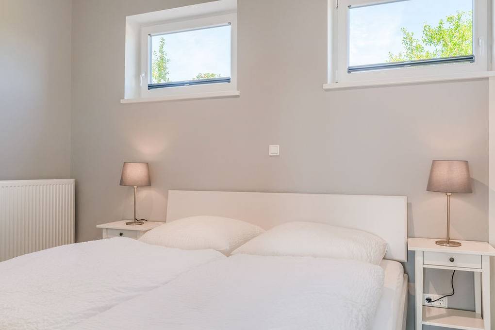 Im Schlafzimmer erwartet Sie ein frisch bezogenes Doppelkomfortbett. Das ruhige Grau der rückwärtigen Wände beruhigt die Sinne und lässt Sie entspannt in den Schlaf kommen.