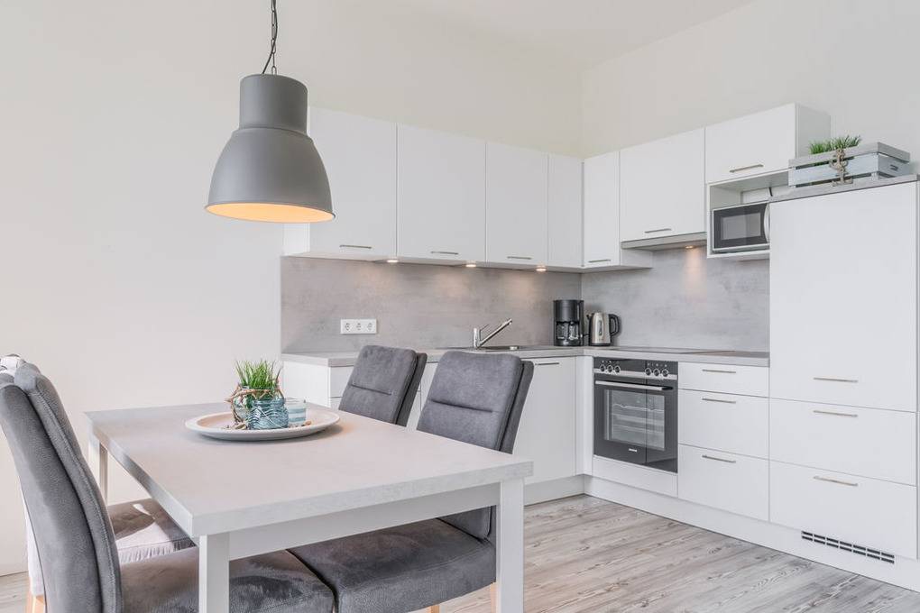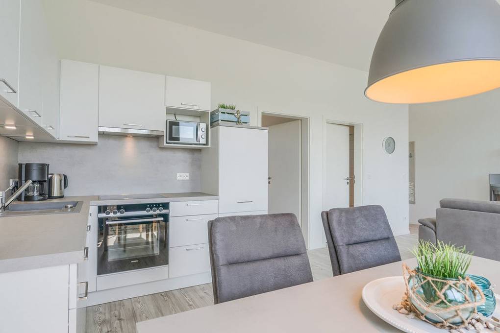 Eine hochwertige Einbauküche, die in den Wohnraum integriert ist, macht das Kochen zum Vergnügen. Die Eckküche ist so konzipiert, dass alle benötigten Utensilien mit wenigen Schritten erreicht werden können und selbstverständlich übernimmt die eingebaute Geschirrspülmaschine Ihren Abwasch.