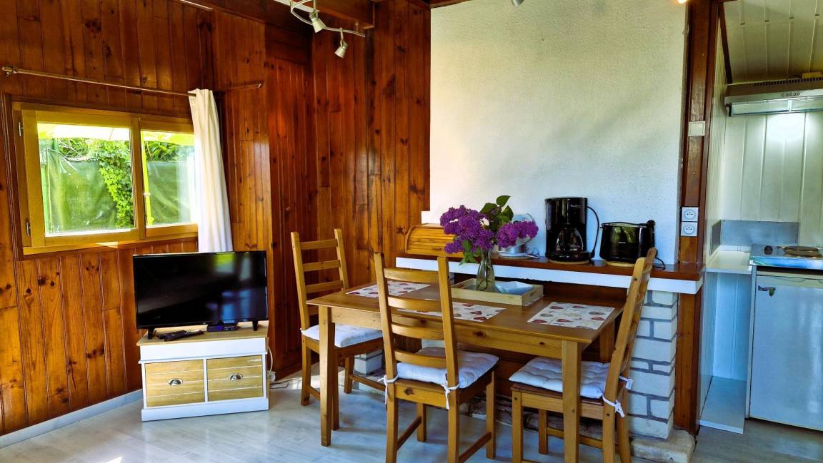 Das Ferienhaus verfügt über ein Hauptschlafzimmer mit Doppelbett, einer Kommode mit vier großen Schubladen und einem großen Kleiderschrank, ein Esszimmer mit Doppelschlafsofa (TV, Internetzugang), eine Küche (große Kühl-Gefrierkombination, kleiner Kühlschrank, Waschmaschine, Zwei-Flammen-Herd, Dunstabzugshaube, Minibackofen), ein Badezimmer (Duschkabine, Waschbecken, großer Waschtisch, elektrischer Handtuchtrockner) und ein separates WC, das vom Schlafzimmer aus zugänglich ist.