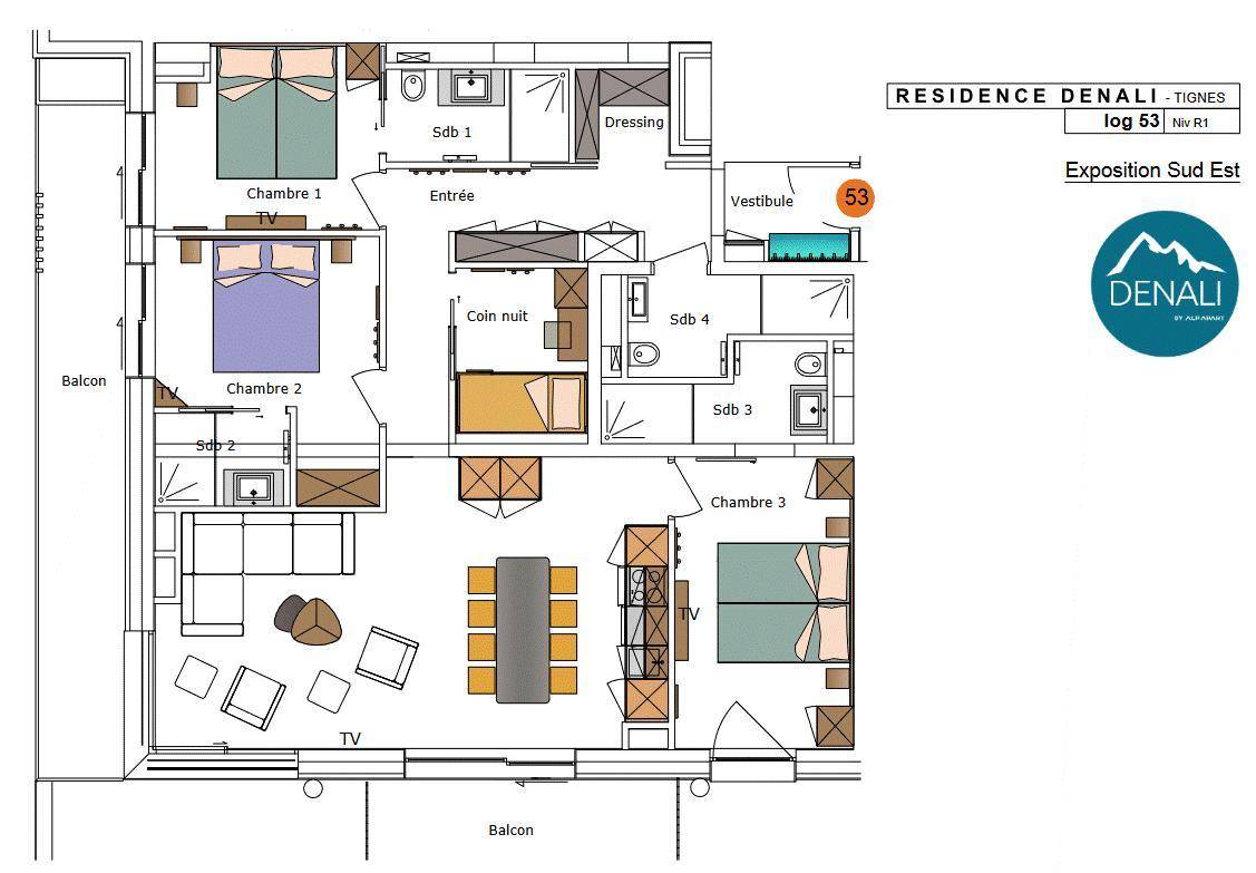 Die Besonderheit des Denali zeigt sich in seinem Wasserbereich mit Schwimmbecken, Planschbecken, Sauna, Hammam und Whirlpool, in dem Sie den Tag entspannt und fit ausklingen lassen können. Fläche von ungefähr 97 m². Orientierung : Süd-Ost. Wohnzimmer mit . 2 Schlafzimmer mit 2 zwei Einzelbetten (90*200), , WC. Schlafzimmer mit Doppelbett (160*200), . Schlafbereich mit 2 Stockbetten (80*190). Dressing. Küche mit Kaffeemaschine (filtre et Nespresso), , Backofen, Geschirrspülmaschine, Mikrowellenherd, 2 Glaskeramikkochfelder, Kühl-Gefrier-Kombination. Badezimmer mit Haartrockner, WC. 2 Balkone. Die oberen Betten sind nicht für Kinder unter 6 Jahren geeignet.