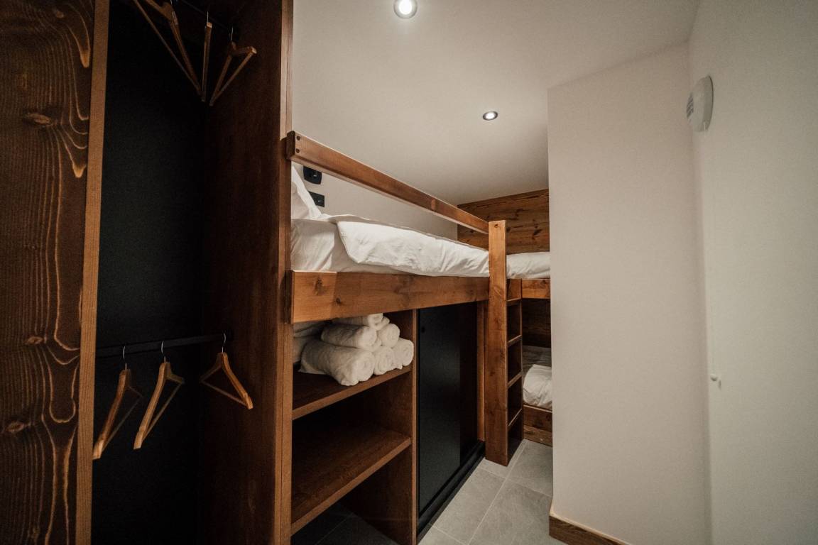 Apartment im 3. Stock ohne Aufzug in einer Residenz mit 13 Apartments, bestehend aus einem Eingang mit Schränken, einem Wohnzimmer-Küchen-Loungebereich (Chromcast-TV, Bluetooth-Lautsprecher, Weinkeller) mit Zugang zu einem Balkon, 2 Schlafzimmern mit Chromcast-TV ( 2 Einzelbetten 90x200 cm, die zu 1 Doppelbett 180x200 cm / 1 Doppelbett 160x200 cm zusammengestellt werden können), ein Schlafzimmer (3 Einzelbetten 90x200 cm davon 2 Etagenbetten), ein Badezimmer (Doppeldusche, Doppelwaschbecken und WC), a Badezimmer (Dusche), 2 separate WCs. Das Parken im Freien ist während der Wintersaison kostenpflichtig (überdachter kostenpflichtiger Parkplatz in 100 m Entfernung); im Sommer kostenlose Außenparkplätze im gesamten Resort.