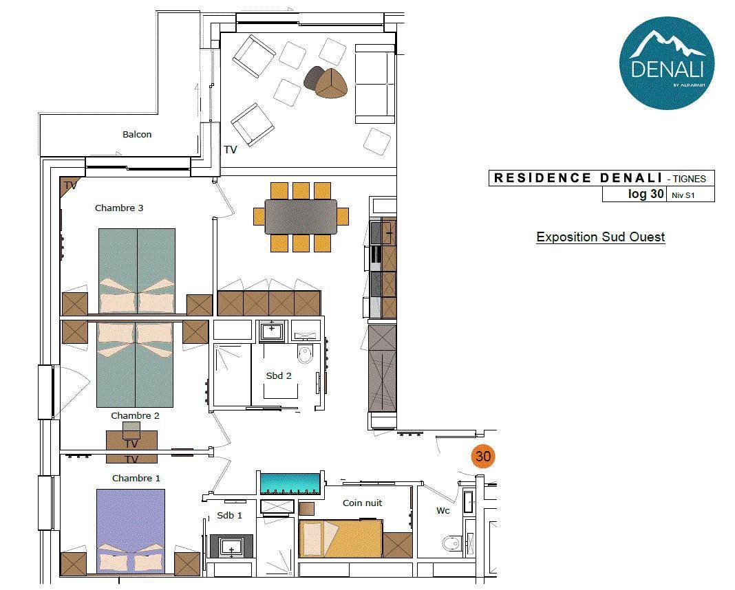 Die Besonderheit des Denali zeigt sich in seinem Wasserbereich mit Schwimmbecken, Planschbecken, Sauna, Hammam und Whirlpool, in dem Sie den Tag entspannt und fit ausklingen lassen können. Fläche von ungefähr 87 m². Orientierung : Süd-West. Wohnzimmer mit . Schlafzimmer mit Dusche, 2 zwei Einzelbetten (90*200), WC. Schlafzimmer mit 2 zwei Einzelbetten (90*200). Schlafzimmer mit Doppelbett (160*200). Schlafbereich mit 2 Stockbetten (80*190). Küche mit Kaffeemaschine (filtre et Nespresso), , Backofen, Geschirrspülmaschine, Mikrowellenherd, 2 Glaskeramikkochfelder, Kühl-Gefrier-Kombination. Badezimmer mit Haartrockner, WC. separates WC. Balkon. Die oberen Betten sind nicht für Kinder unter 6 Jahren geeignet.