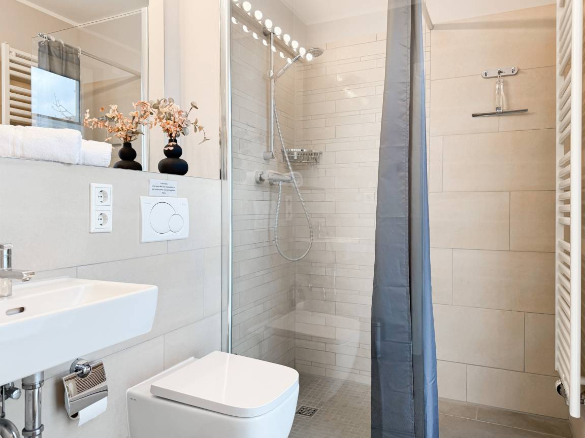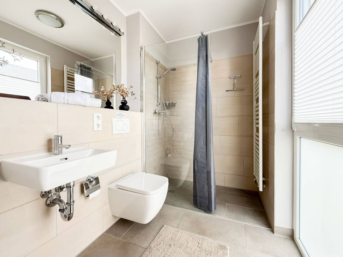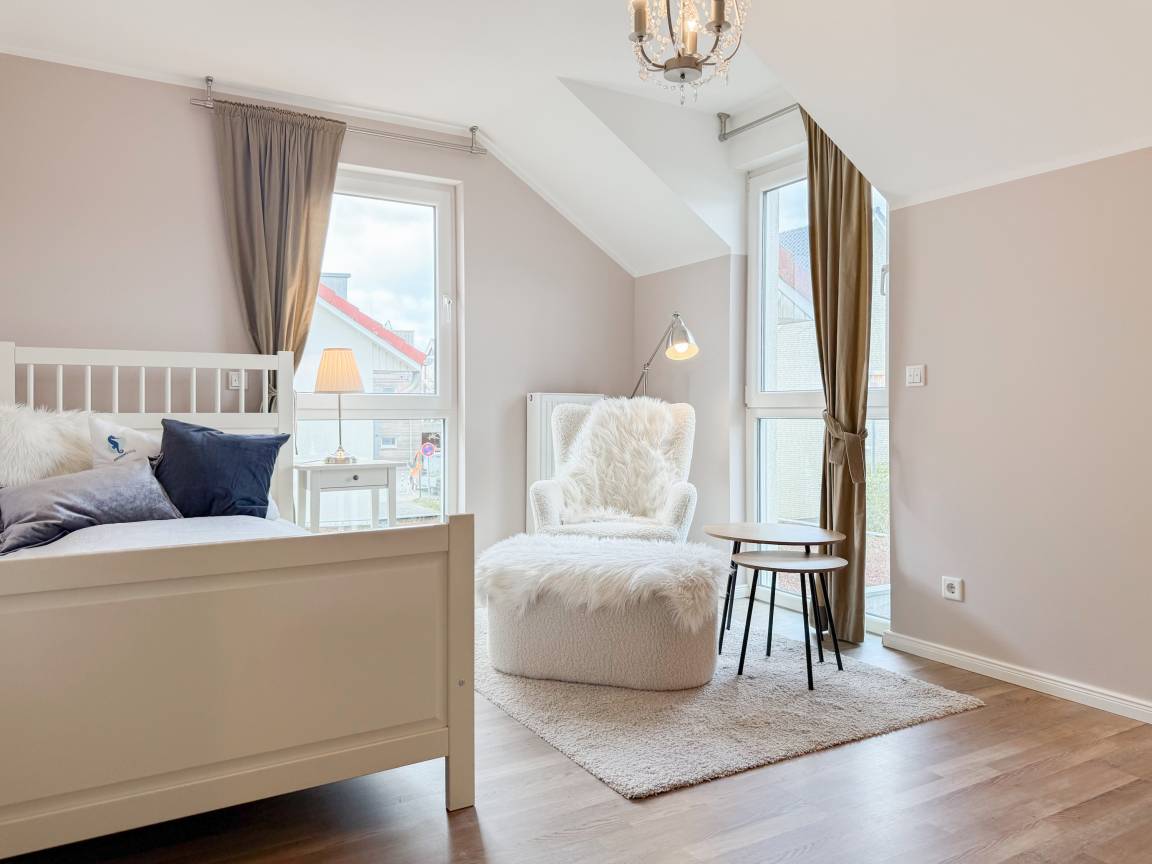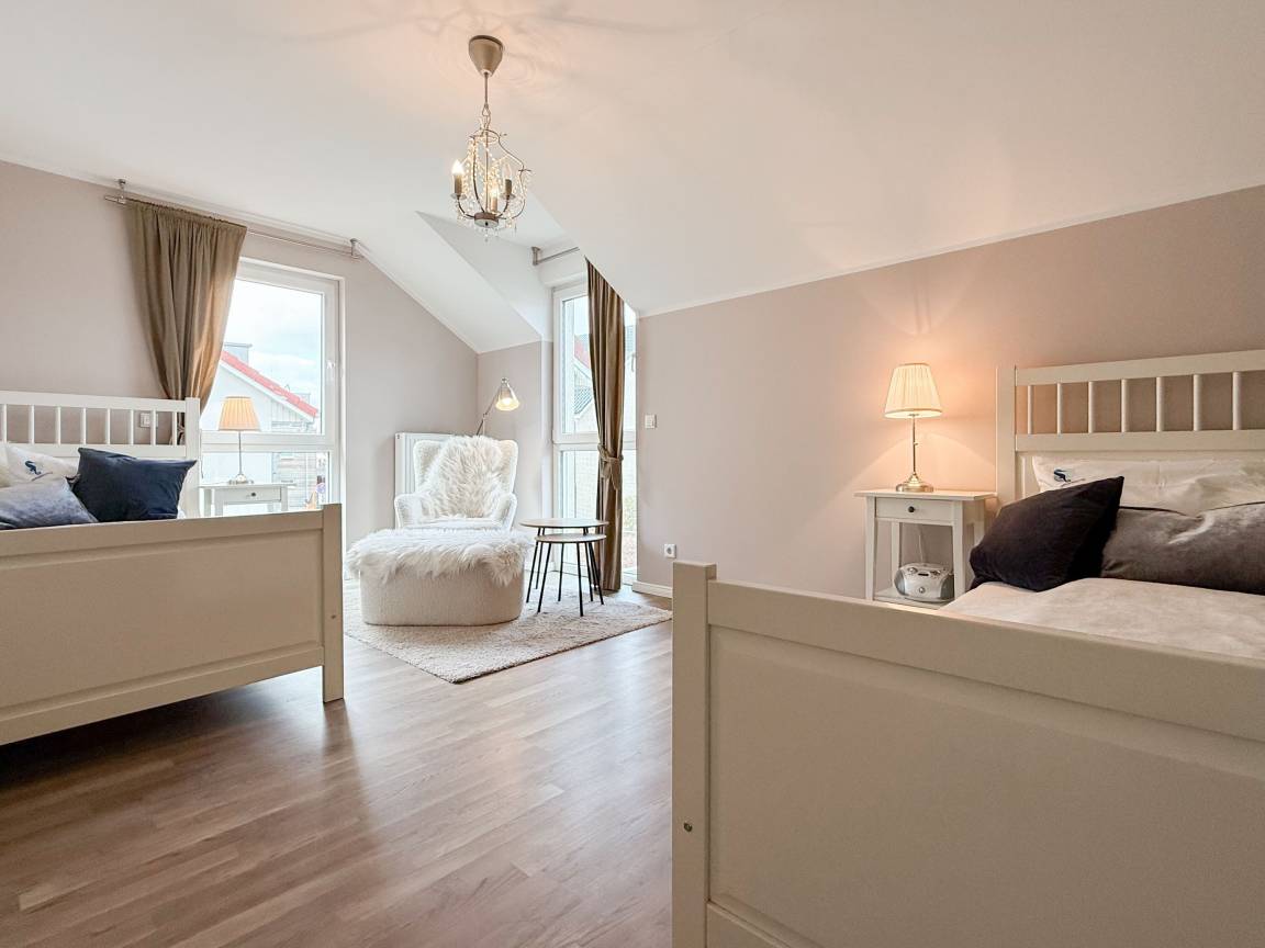 Es erwartet Sie ein tolles Doppelhaus mit 3 separaten Schlafzimmern und 2 Duschbädern. Sonnige Räumlichkeiten auf über 100 qm Wohnfläche und die geschmackvolle Einrichtung mit liebevollen Details schaffen ein behagliches Ambiente für 6 Personen. Im Erdgeschoss erwartet Sie ein großzügiger Wohnbereich, der mit einem gemütlichen Ecksofa und TV eingerichtet ist. Die vorgelagerte Sonnenterrasse in Südausrichtung garantiert erholsame Urlaubszeit. Die großzügige Einbauküche ist bestens ausgestattet und lädt zum gemeinsamen Kochen ein. Der anschließende Essbereich, mit großem Esstisch und gemütlichen Sesseln, bietet ausreichend Platz für gemeinsame Mahlzeiten und geselliges Beisammensein. Im Eingangsbereich befindet sich eine Garderobe und ein neuwertiges Tageslichtbad mit Dusche, Waschbecken und WC. Eine Waschmaschine ist im separaten Abstellraum untergebracht, ebenfalls im Erdgeschoss. Im Obergeschoss befindet sich ein weiteres Duschbad mit Doppelwaschtisch und Fenster sowie 2 separate Schlafzimmer. Schlafzimmer 1 ist äußerst großzügig und mit einem Doppelbett, einer Sitzecke mit TV und einem Schreibtisch für das Home Office eingerichtet. Schlafzimmer 2 verfügt über 2 Einzelbetten und einen gemütlichen Relaxsessel. Im Dachgeschoss befindet sich das 3. Schlafzimmer mit einem Doppelbett (180x200), Kleiderschrank und Sessel. Die Dachflächenfenster lassen sich über ein Rollo verdunkeln, alle anderen Fenster des Hauses sind mit elektrischen Außenjalousien versehen. WLAN steht selbstverständlich kostenlos zur Verfügung. Vor dem Haus befinden sich zwei Parkplätze. (1 Carport und 1 Außenstellplatz). Fahrräder können sicher und trocken im Schuppen am Haus untergestellt werden. [nbsp]