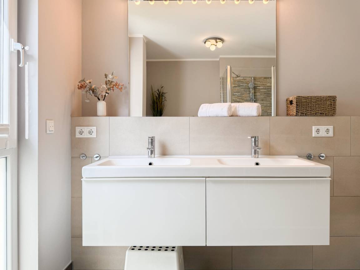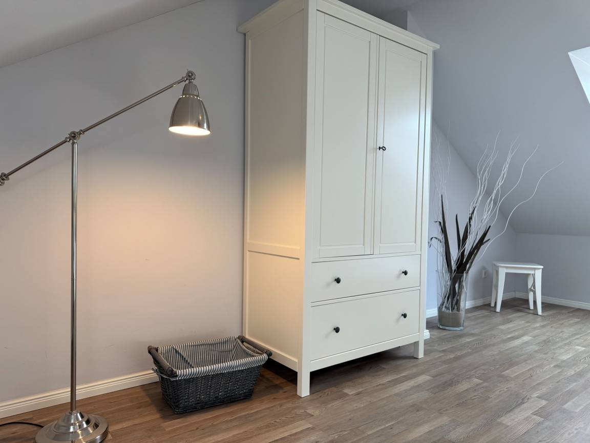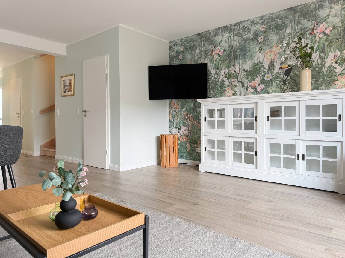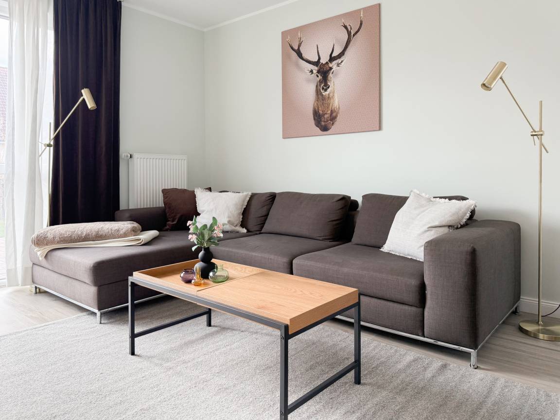 Es erwartet Sie ein tolles Doppelhaus mit 3 separaten Schlafzimmern und 2 Duschbädern. Sonnige Räumlichkeiten auf über 100 qm Wohnfläche und die geschmackvolle Einrichtung mit liebevollen Details schaffen ein behagliches Ambiente für 6 Personen. Im Erdgeschoss erwartet Sie ein großzügiger Wohnbereich, der mit einem gemütlichen Ecksofa und TV eingerichtet ist. Die vorgelagerte Sonnenterrasse in Südausrichtung garantiert erholsame Urlaubszeit. Die großzügige Einbauküche ist bestens ausgestattet und lädt zum gemeinsamen Kochen ein. Der anschließende Essbereich, mit großem Esstisch und gemütlichen Sesseln, bietet ausreichend Platz für gemeinsame Mahlzeiten und geselliges Beisammensein. Im Eingangsbereich befindet sich eine Garderobe und ein neuwertiges Tageslichtbad mit Dusche, Waschbecken und WC. Eine Waschmaschine ist im separaten Abstellraum untergebracht, ebenfalls im Erdgeschoss. Im Obergeschoss befindet sich ein weiteres Duschbad mit Doppelwaschtisch und Fenster sowie 2 separate Schlafzimmer. Schlafzimmer 1 ist äußerst großzügig und mit einem Doppelbett, einer Sitzecke mit TV und einem Schreibtisch für das Home Office eingerichtet. Schlafzimmer 2 verfügt über 2 Einzelbetten und einen gemütlichen Relaxsessel. Im Dachgeschoss befindet sich das 3. Schlafzimmer mit einem Doppelbett (180x200), Kleiderschrank und Sessel. Die Dachflächenfenster lassen sich über ein Rollo verdunkeln, alle anderen Fenster des Hauses sind mit elektrischen Außenjalousien versehen. WLAN steht selbstverständlich kostenlos zur Verfügung. Vor dem Haus befinden sich zwei Parkplätze. (1 Carport und 1 Außenstellplatz). Fahrräder können sicher und trocken im Schuppen am Haus untergestellt werden. [nbsp]