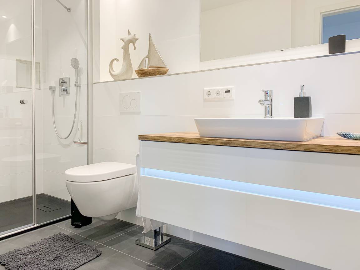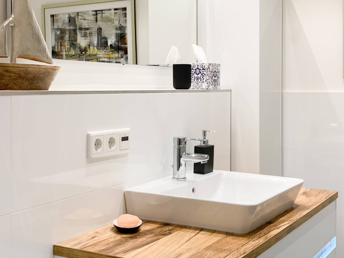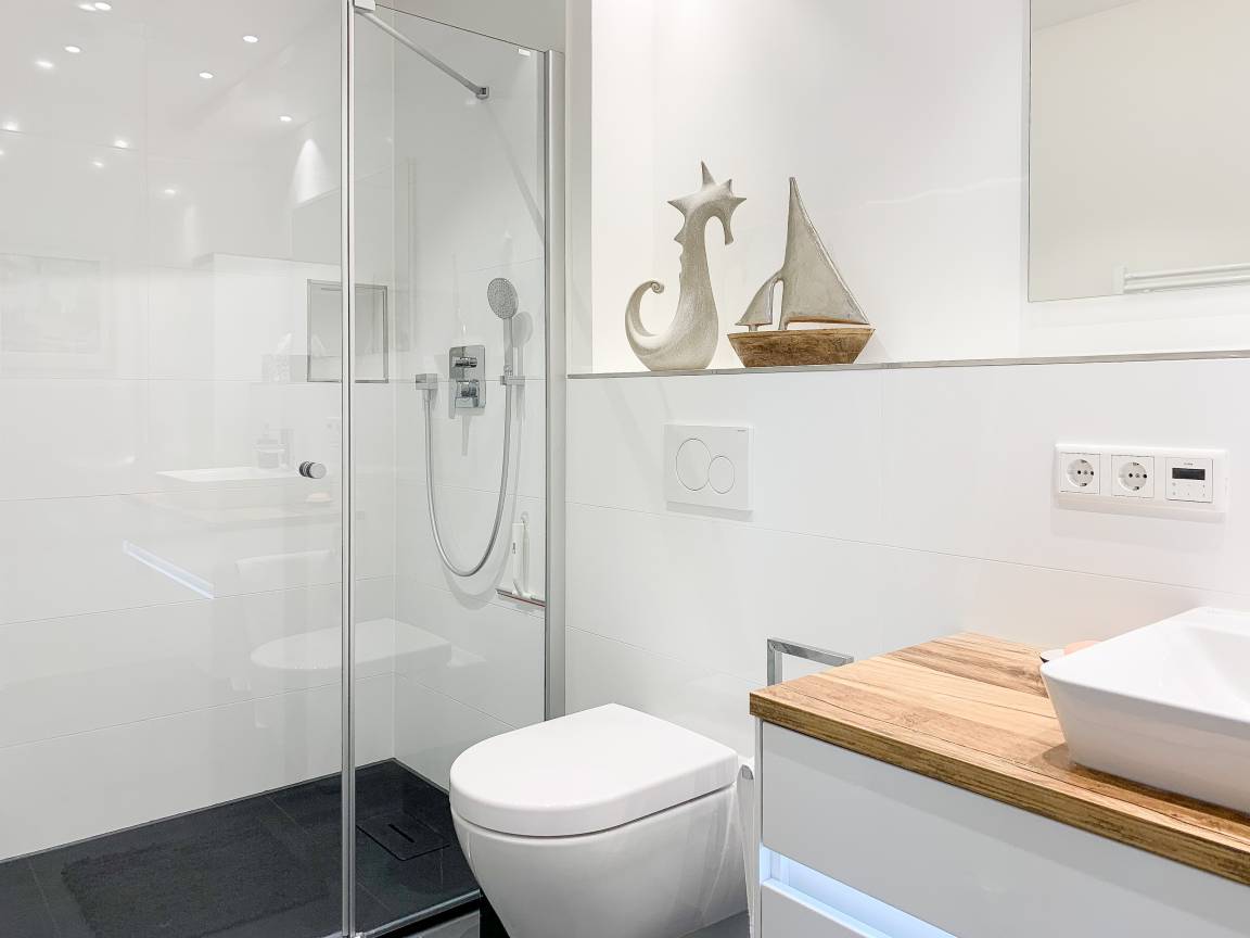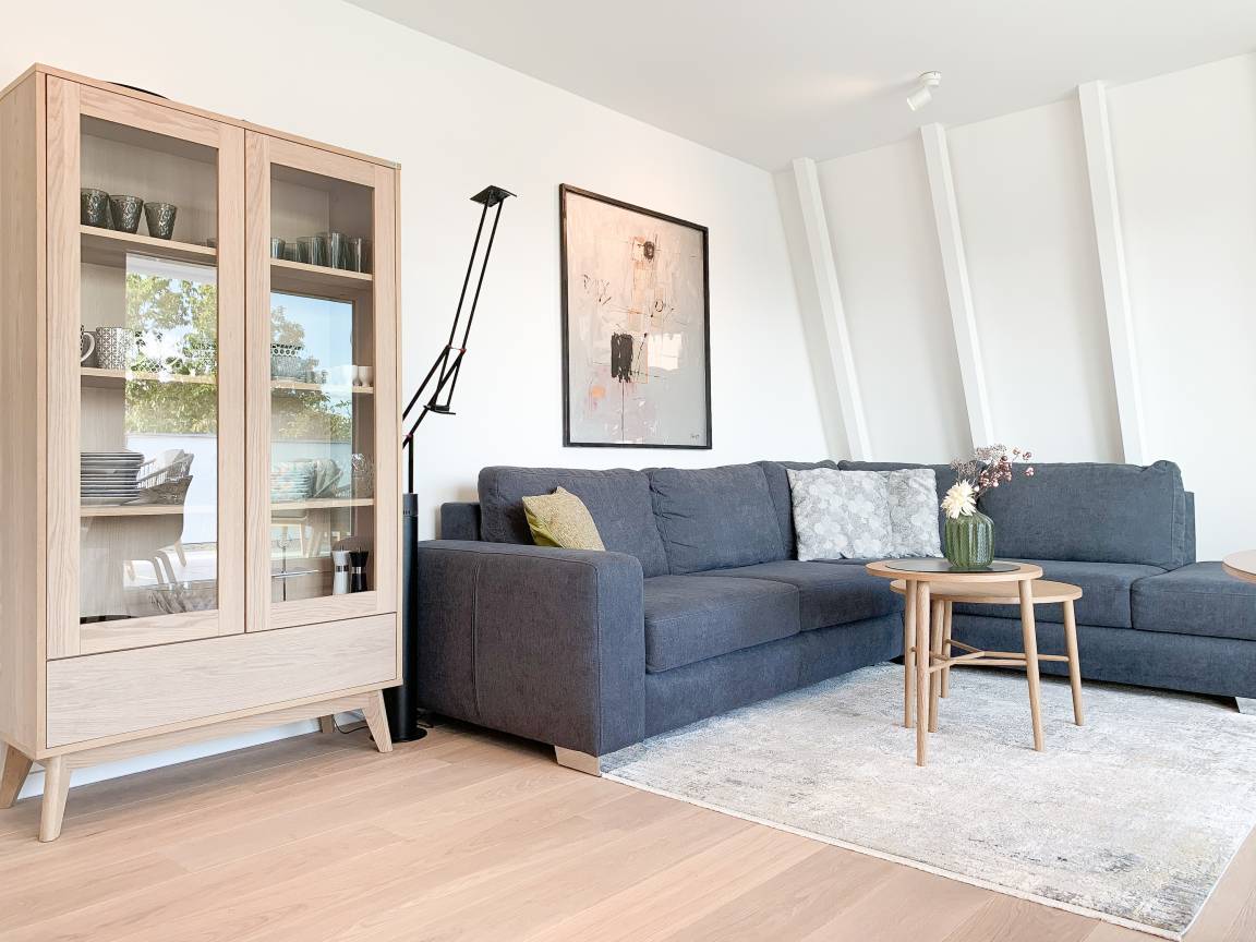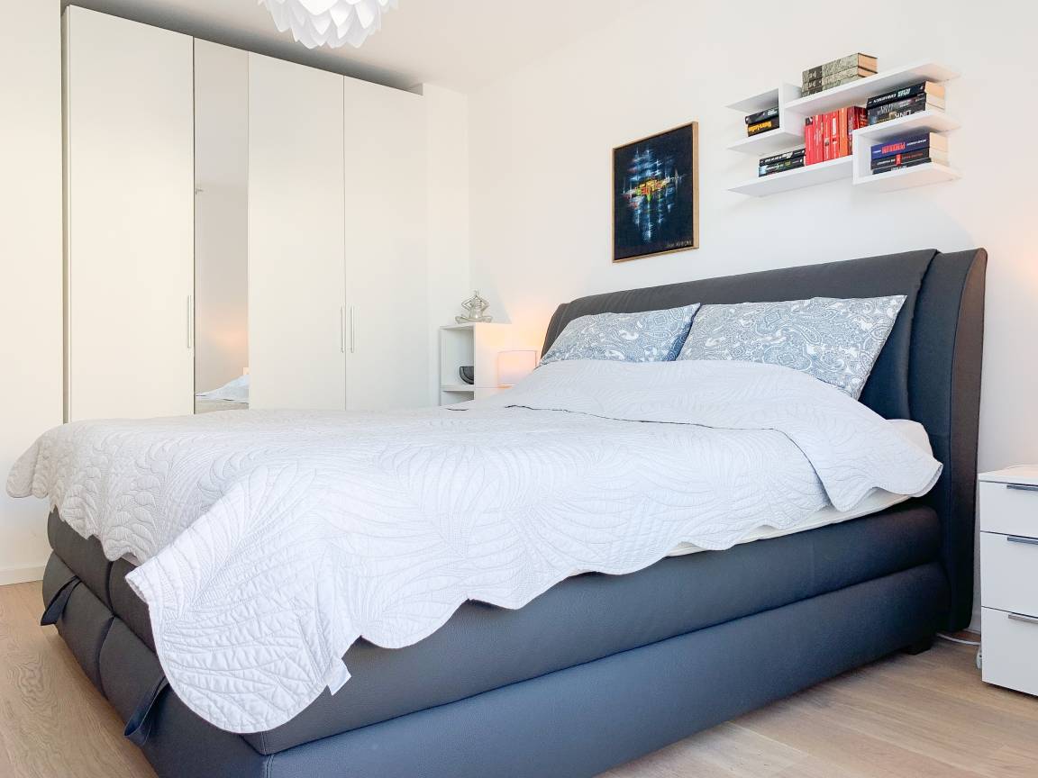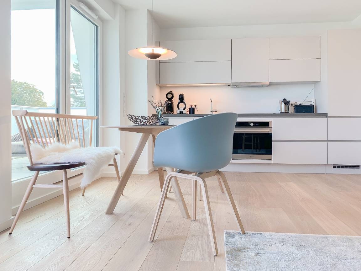 Durch das Zusammenspiel von Farben und hochwertigen Materialien mit viel Liebe zum Detail ist es gelungen eine wunderbare Atmosphäre zu schaffen. Echtholzparkett und Fußbodenheizung sorgen für ein angenehmes Raumklima und große Fensterflächen, alle mit elektrischen Außenjalousien versehen, für lichtdurchflutete Räumlichkeiten. Es erwartet Sie ein kombinierter Wohn- Essbereich mit hochwertigem Schlafsofa und integrierter Einbauküche. Der großzügige Südbalkon ist mit exklusiven Garten- und Loungemöbeln ausgestattet und mit einem Deckenheizstrahler versehen, um den Außenbereich auch an kühleren Abenden nutzen zu können. Vor dem Schlafzimmer, ausgestattet mit einem Boxspringdoppelbett und TV, befindet sich ein weiterer Balkon, um die Morgensonne bei einer Tasse Café zu genießen. Das Bad ist luxuriös und verfügt über eine großzügig angelegte Walk In Dusche.