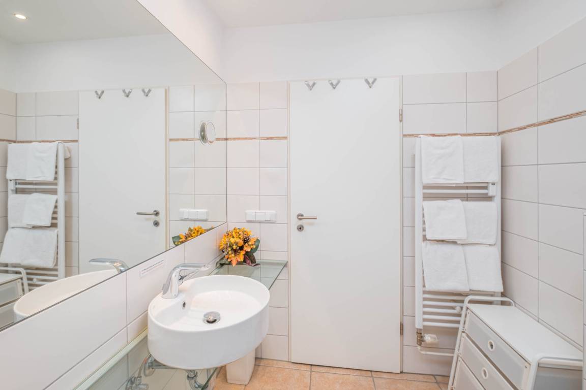 Das helle und moderne Badezimmer ist mit einer Dusche, WC und Fön ausgestattet.