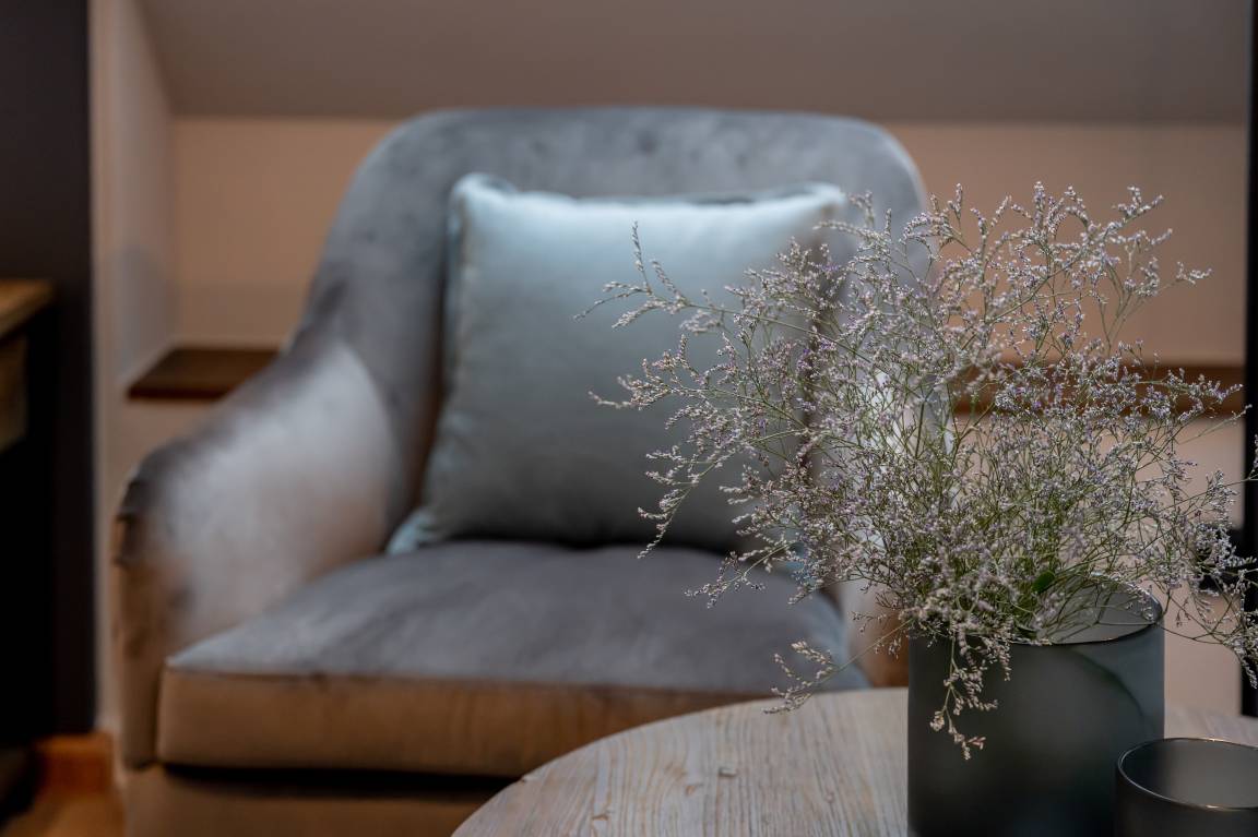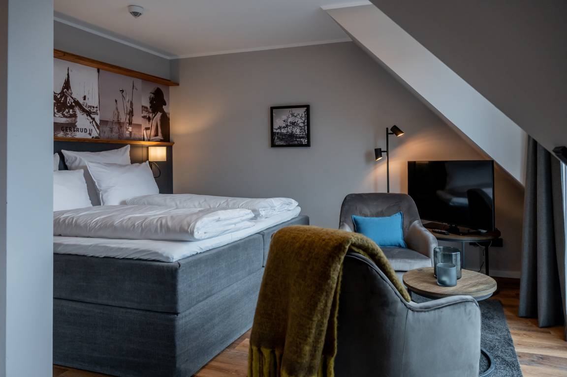 Im kombinierten Wohn- und Schlafbereich befindet sich eine vollausgestattete Einbauküche mit Essbereich für zwei Personen, zwei Sessel und ein Flachbild-TV. Die Gertrud II verfügt über einen Balkon mit Süd-West-Ausrichtung und seitlichen Blick auf den Niendorfer Hafen, auf dem Sie ein kleiner Tisch, Stühle und gemütliche Lounger erwarten. Hier können Sie den ersten Kaffee des Tages oder am Abend einen erfrischenden Sundowner genießen. Im Schlafbereich ist ein gemütliches Boxspringbett und ein großer Kleiderschrank mit Zimmersafe vorhanden. Entschleunigen können Sie im separaten Badezimmer mit integriertem Internet-Radio und einer Regendusche. Die hochwertige Einrichtung umfasst u. a. Möbel von Riviera Maison. Das Boxspringbett könnte ungeeignet sein für Personen mit einem sehr festen Liegegefühl.
