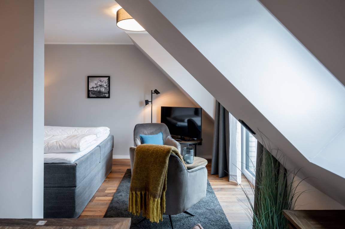Unsere Gertrud II ist 34 m² groß und bietet Platz für 2 Personen im kombinierten Wohn- und Schlafbereich. Die Einrichtung dieser hochwertigen Ferienwohnung kombiniert die zeitgemäßen Loft- und Beachhousestyles ganz erfrischend und wird Ihren Aufenthalt unvergesslich machen.
