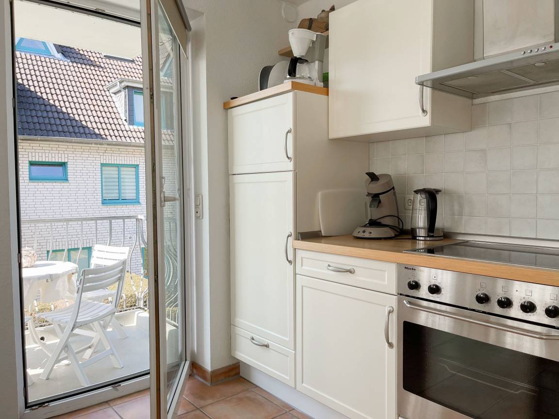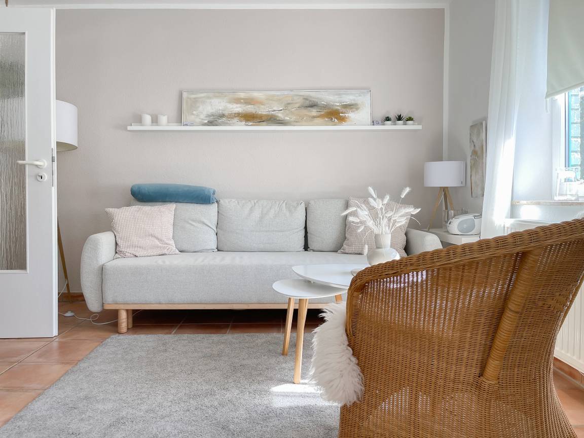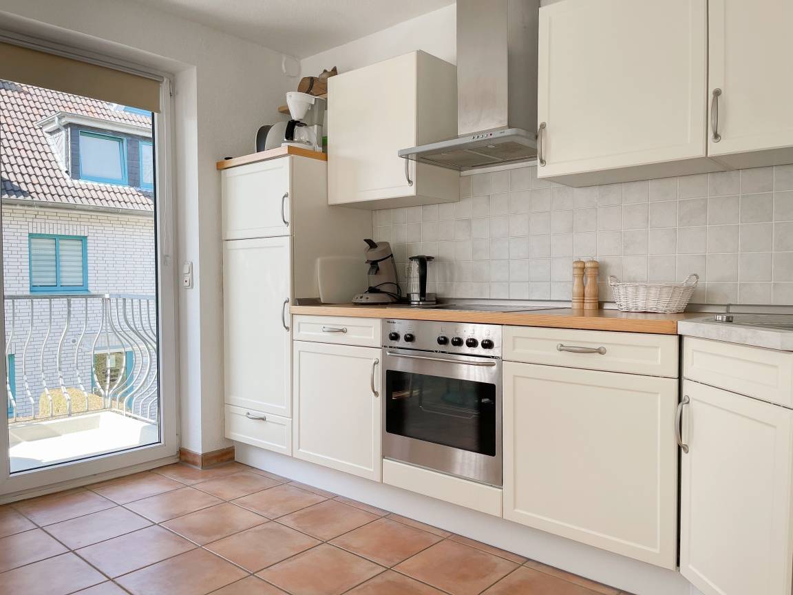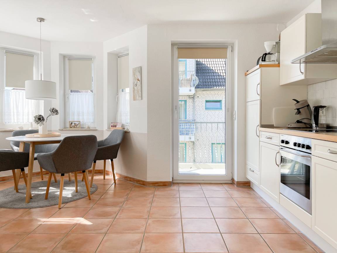 Die sonnige zwei Zimmer Ferienwohnung befindet sich in der 1. Etage und verfügt über kleinen Sonnenbalkon, der mit Gartenmöbeln ausgestattet ist. Der Wohnbereich verfügt über ein Sofa mit Schlaffunktion und TV, eine offene Küche und ein gemütlicher Essbereich, der im Erker untergebracht ist. Das Schlafzimmer ist mit einem Doppelbett (180x200) und einem Kleiderschrank ausgestattet. Das Duschbad verfügt über ein Fenster und ist hell und ansprechend. WLAN steht zur kostenlosen Nutzung zur Verfügung.