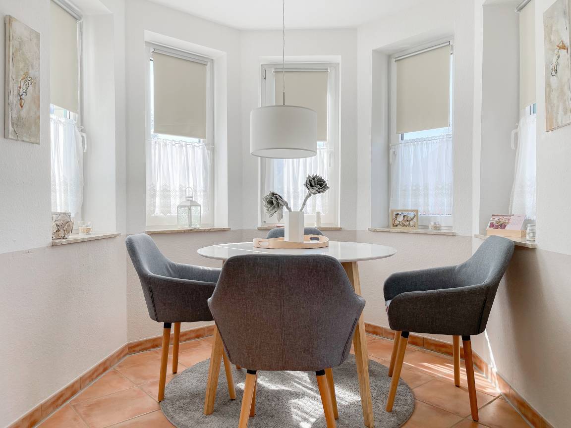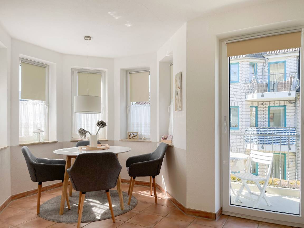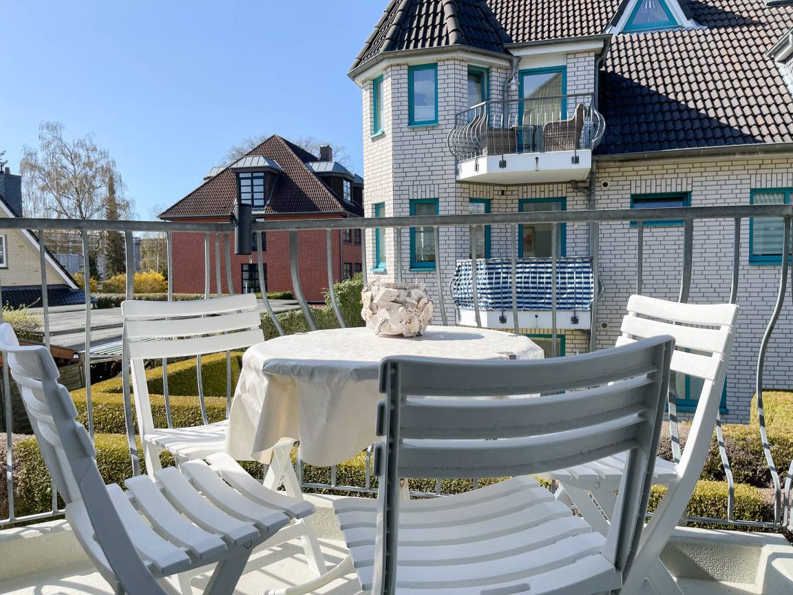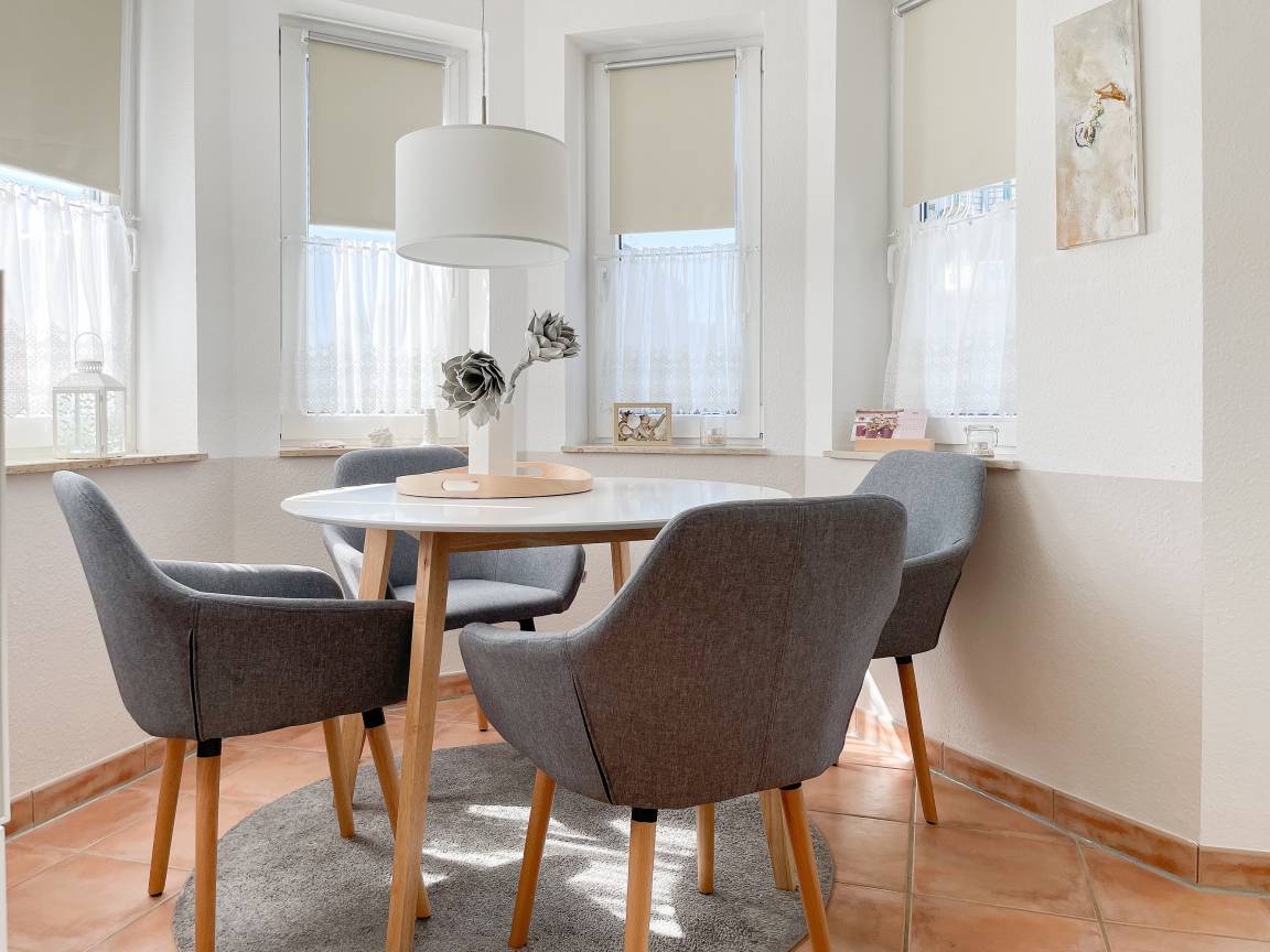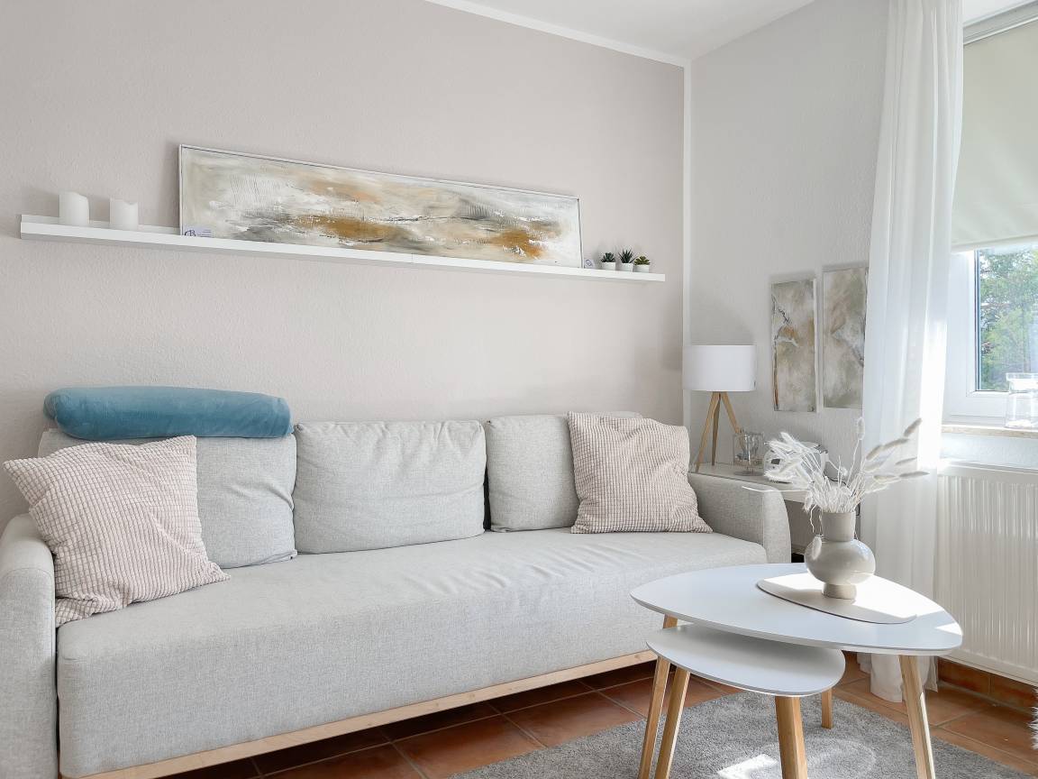 Die sonnige zwei Zimmer Ferienwohnung befindet sich in der 1. Etage und verfügt über kleinen Sonnenbalkon, der mit Gartenmöbeln ausgestattet ist. Der Wohnbereich verfügt über ein Sofa mit Schlaffunktion und TV, eine offene Küche und ein gemütlicher Essbereich, der im Erker untergebracht ist. Das Schlafzimmer ist mit einem Doppelbett (180x200) und einem Kleiderschrank ausgestattet. Das Duschbad verfügt über ein Fenster und ist hell und ansprechend. WLAN steht zur kostenlosen Nutzung zur Verfügung.