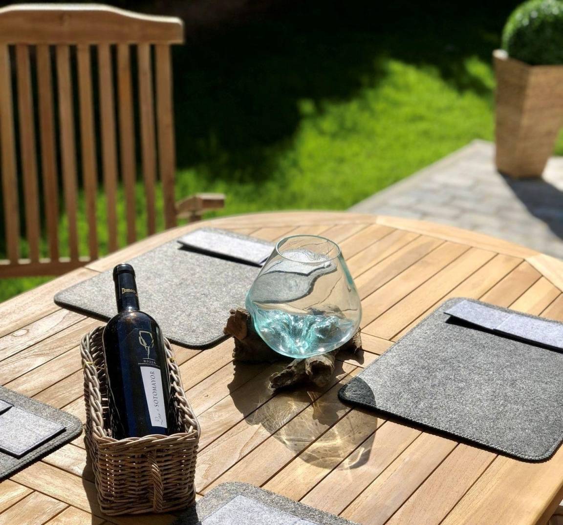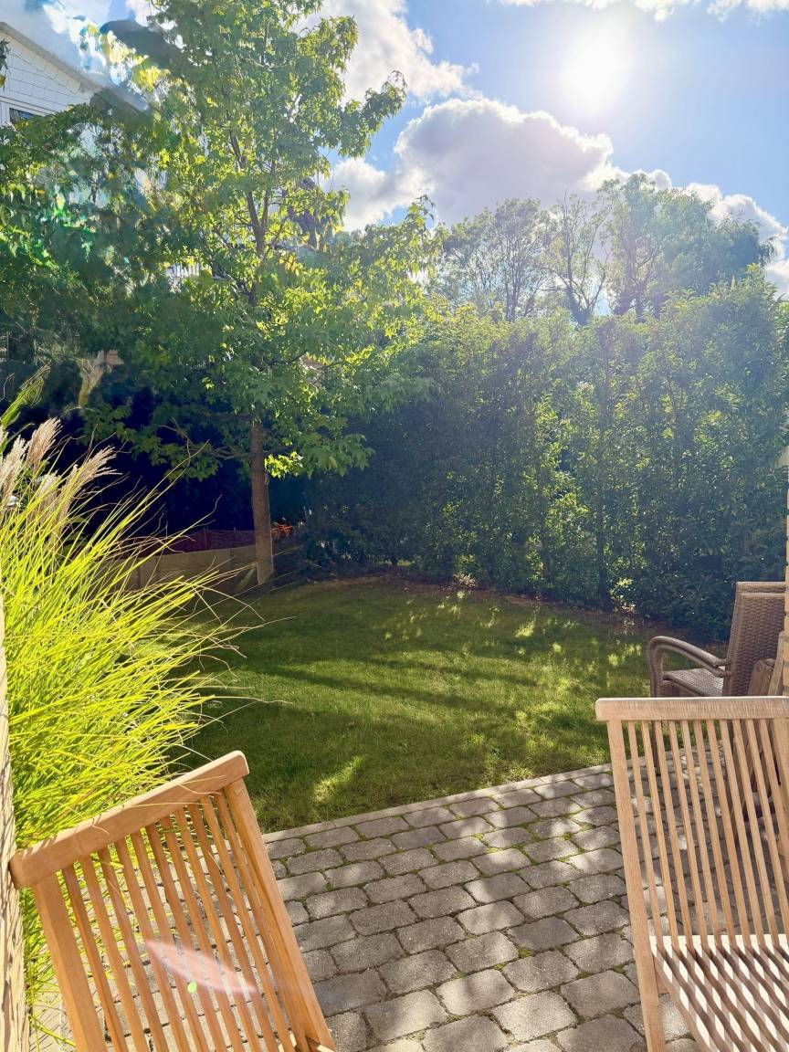 Das Haus verfügt neben dem Südbalkon über eine eigene geräumige Terrasse mit Gartenanteil in Südlage. Die an das Wohnzimmer angrenzende Terrasse ist zum Teil vom Balkon überdacht und mit Markise und eigenem Strandkorb ausgestattet. Es gibt einen kostenlosen Stellplatz. Das Grundstück ist mit Hecken und Schilfgras eingegrenzt und eingewachsen.