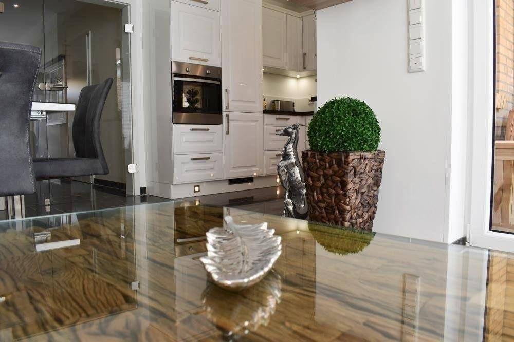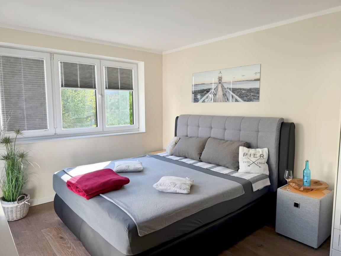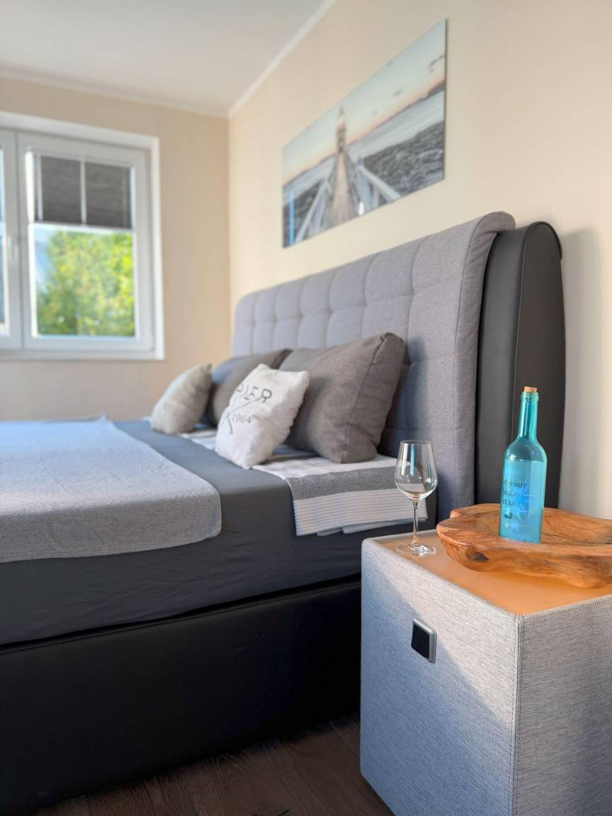 Das stilvolle Haus ist Ende 2018 fertiggestellt und modern, maritim eingerichtet. Große bodentiefe Fenster im Wohn- und Schlafbereich und moderne Bodenbeläge sorgen für eine helle und gemütliche Atmosphäre. Im Wohnzimmer befinden sich eine bequeme Couch und ein hochwertiger Essbereich im maritimen Stil für sechs Personen. An das Wohnzimmer grenzt die Terrasse und der sonnige Garten. Im Erdgeschoss können Sie neben dem Gäste-WC die hauseigene, moderne Sauna im geräumigen Saunaraum erleben. Die offene Marken-Küche ist unter anderem mit Kochplatte, Kühl-/Gefrierschrank, Backofen, Mikrowelle, Kaffeevollautomat und Geschirrspülmaschine ausgestattet. Im Obergeschoss befinden sich zwei Schlafzimmer jeweils mit Boxspringbetten. Das eine Schlafzimmer ist geräumig geschnitten und komfortabel mit Doppelbett und hochwertigen Elektrokamin ausgestattet. Vom Schlafzimmer aus gelangen Sie zum Südbalkon. Das weitere Schlafzimmer im Obergeschoss ist ebenfalls mit Doppelbett versehen. Beide Schlafzimmer sind mit Verdunkelungs-Plissee's für ein angenehmen Schlaf ausgestattet. Das modern geflieste Badezimmer ist als Vollbad mit Dusche, WC und großer Badewanne für 2 Personen ausgestattet. Das Dachgeschoss hat seinen Charm durch die hohe Giebel-Decke und bietet weiteren Schlafraum mit einem Doppelbett. Schlafraum sowie das Wohnzimmer sind mit großen, modernen Flachbild-Fernsehern mit Telekom MagentaTV ausgestattet. Schnelles Glasfasernetz mit WLan und Fußbodenheizung sind im ganzen Haus vorhanden.