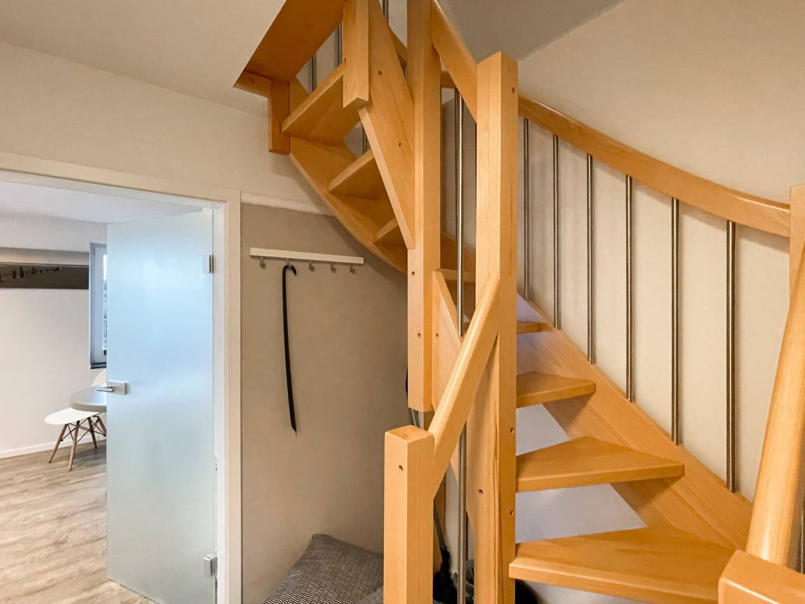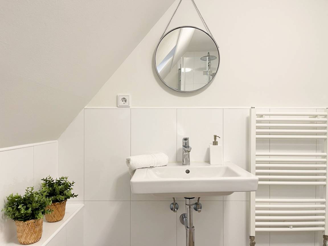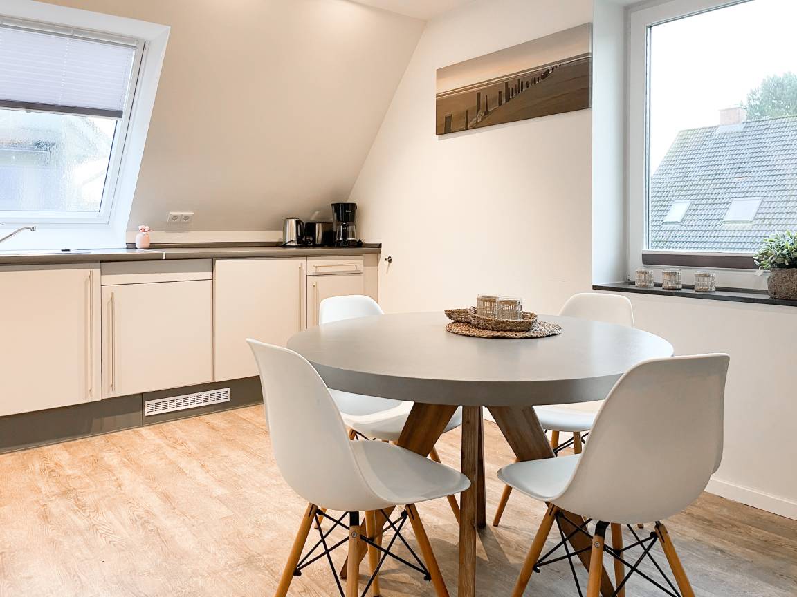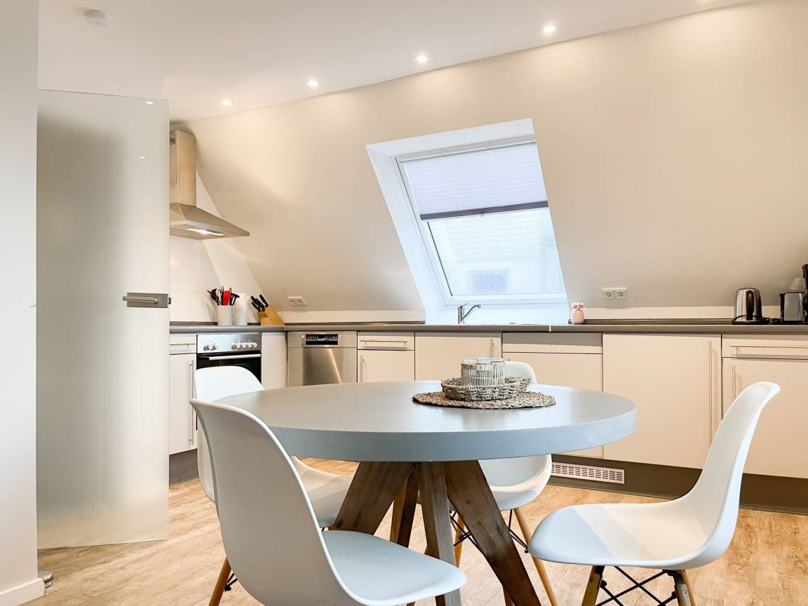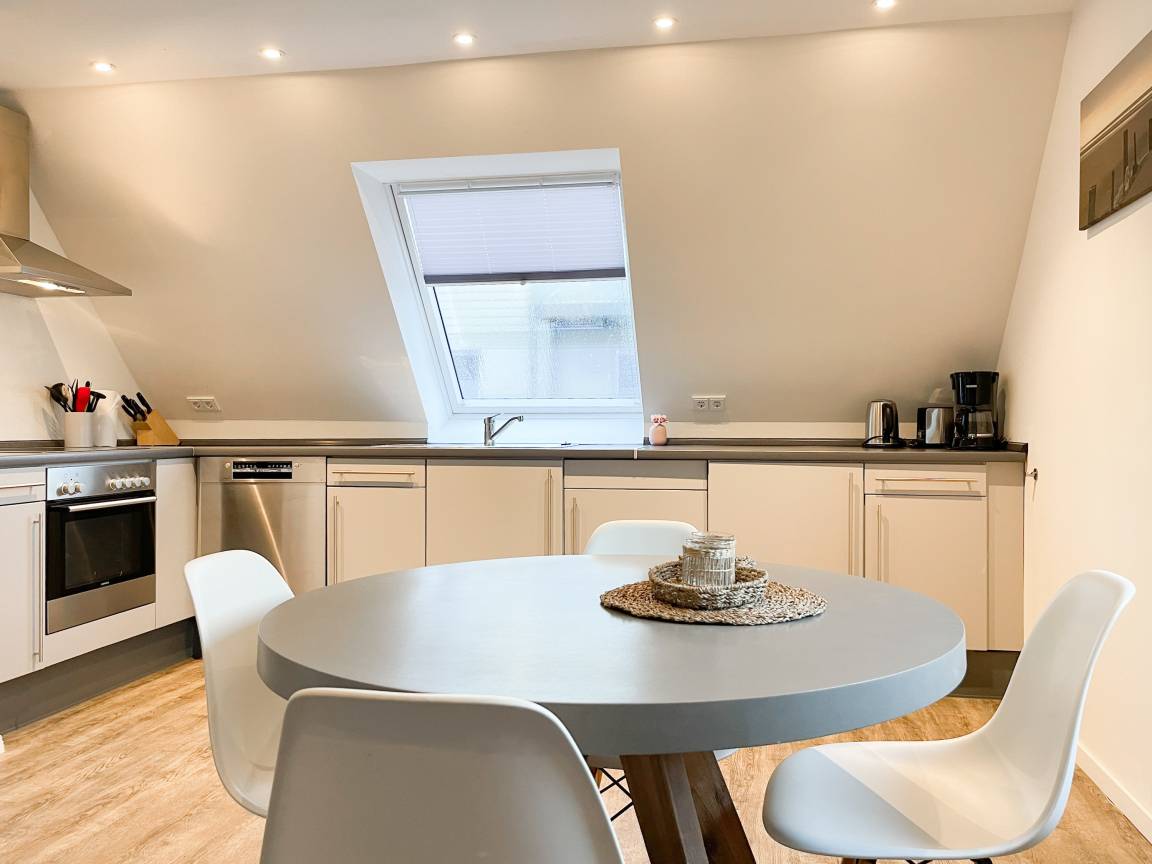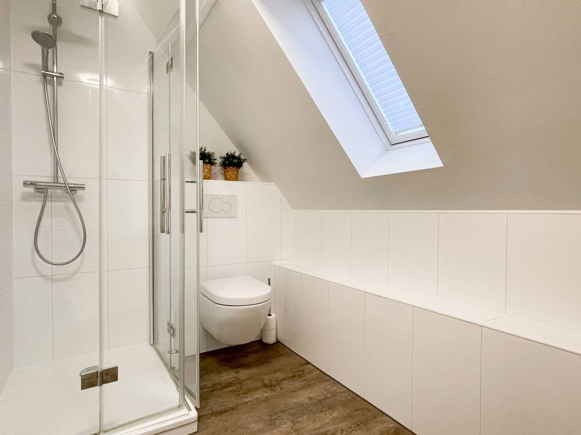 Die Maisonette Waterkant #2 befindet sich im Obergeschoss und bietet mit 2 Schlafzimmern auf 50 qm ausreichend Raum für 2-4 Personen, um einen entspannten Ostseeurlaub in Strandnähe zu verleben. Es erwartet Sie ein heller Wohnbereich mit Sofa, ein anschließender Essbereich und eine offene Einbauküche, gut ausgestattet mit Ceranfeld, Backofen, Geschirrspüler und Kühl- und Gefrierschrank. Das separate Schlafzimmer ist mit einem Doppelbett (140x200), einem Einbauschrank mit viel Staufläche, Verdunkelungsplissee und TV eingerichtet. Das Galerieschlafzimmer im Dachgeschoss (Deckenhöhe 1,80 und halboffen zum Flur) ist über eine Raumspartreppe zu erreichen verfügt über 2 Einzelbetten. Aufgrund der Schrägen und der geringen Deckenhöhe ist es gut für Kinder geeignet. Das Bad ist mit einer Dusche, Waschbecken, WC, Fenster und Handtuchwärmer ausgestattet. WLAN kann selbstverständlich kostenlos genutzt werden. Ein Außenstellplatz gehört zur Wohnung. Ein abschließbarer Fahrradraum kann gemeinschaftlich genutzt werden, ebenso Waschmaschine und Trockner, die im separaten Waschraum untergebracht sind.