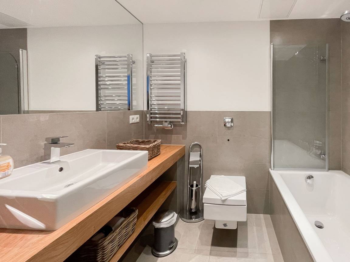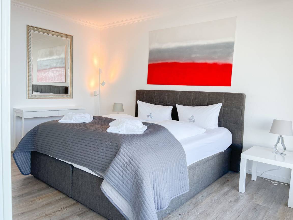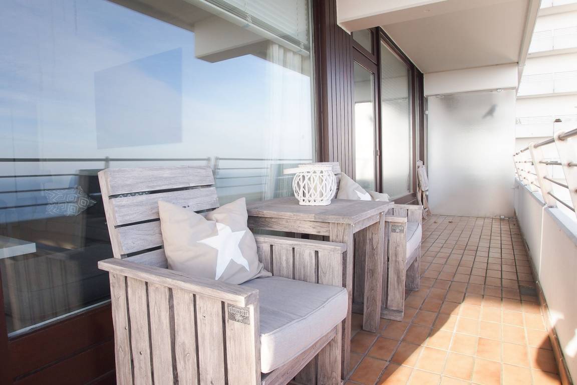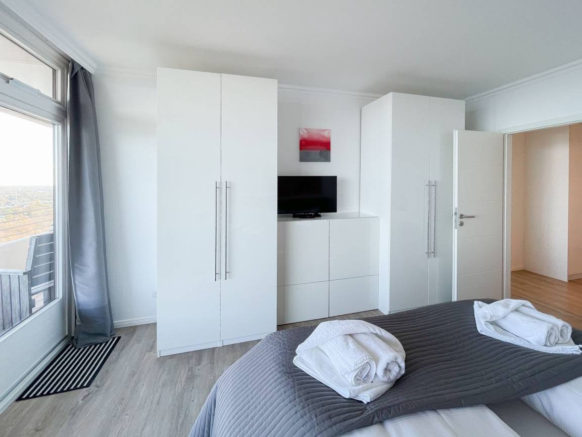 Die großzügige Eckwohnung bietet[nbsp] mit 2 Schlafzimmern und 2 Bädern auf 120 qm höchsten Wohnkomfort für 4 Personen, um einen entspannten Urlaub zu verleben. Der umlaufende Sonnenbalkon ist sowohl vom Wohnbereich als auch von den [nbsp]beiden Schlafzimmern zugänglich. Genießen Sie tagsüber das sensationelle Meerblickpanorama aus nahezu jedem Raum und bei Dunkelheit die besondere Atmosphäre der beleuchteten Lübecker Bucht. Es steht ein großzügiges[nbsp] Wohnzimmer mit anschließendem Essbereich für 4 Personen zur Verfügung. In der offenen, bestens ausgestatteten Designküche mit Induktionskochfeld, Mikrowelle und Spülmaschine, ist ebenfalls eine Waschmaschine untergebracht. Die beiden Schlafzimmer sind jeweils mit einem Doppelbett (180x200 und 160x200) und TV ausgestattet. Die Fenster sind mit Verdunkelungsvorhängen versehen. Zwei neue, hochwertige Bäder, eines mit Dusche und eines mit Badewanne, runden das Angebot ab. Ein fester PKW Stellplatz in der Hotelgarage (Einfahrtshöhe 1,90/kein Aufzug) ist[nbsp] inklusive. Bei Verlust der Parkkarte ist Ersatz zu leisten.