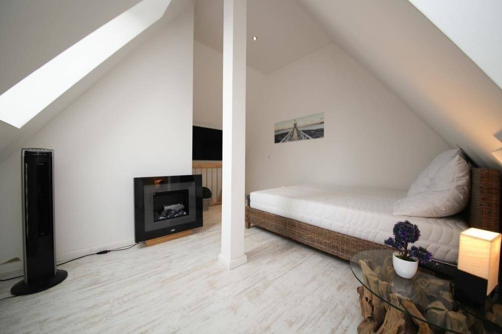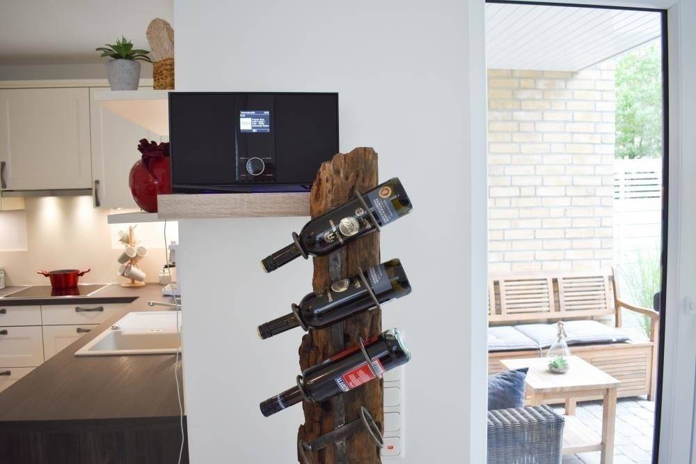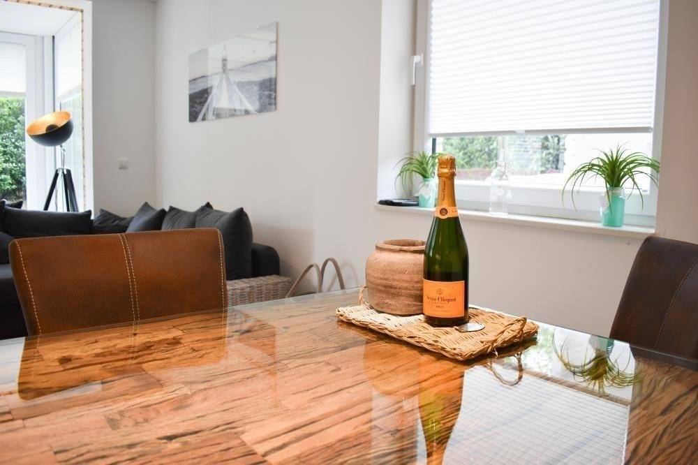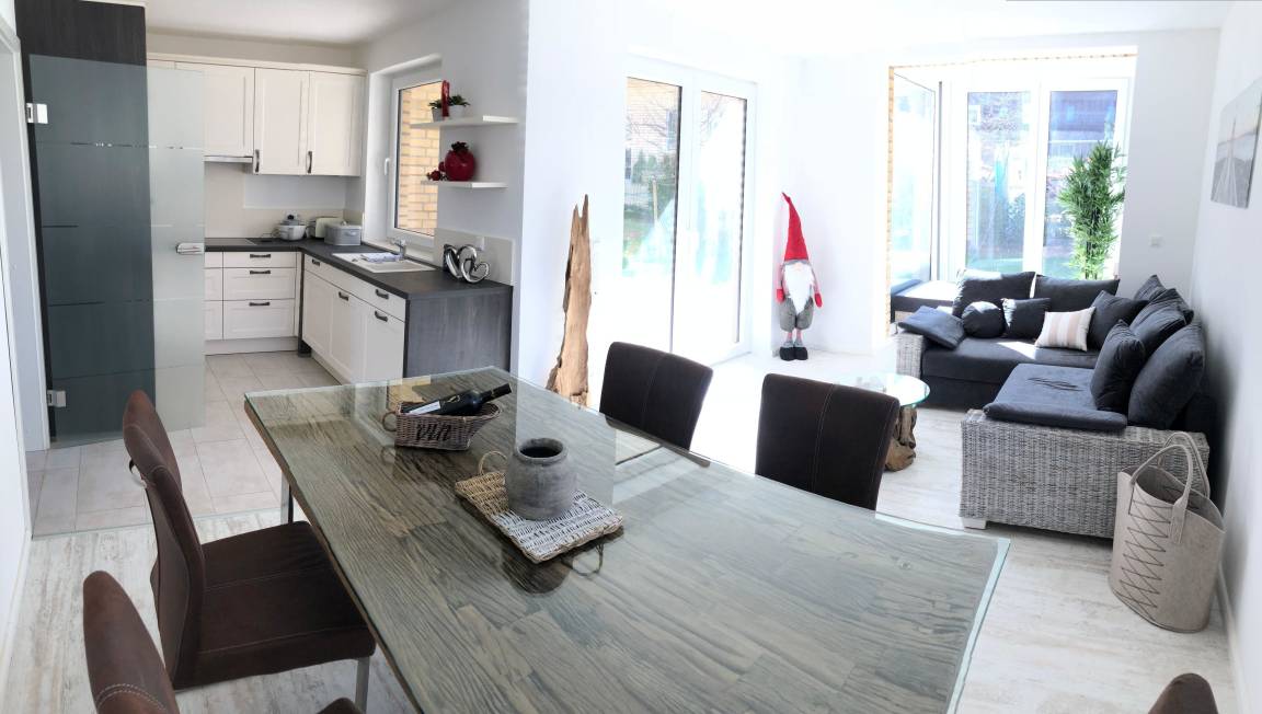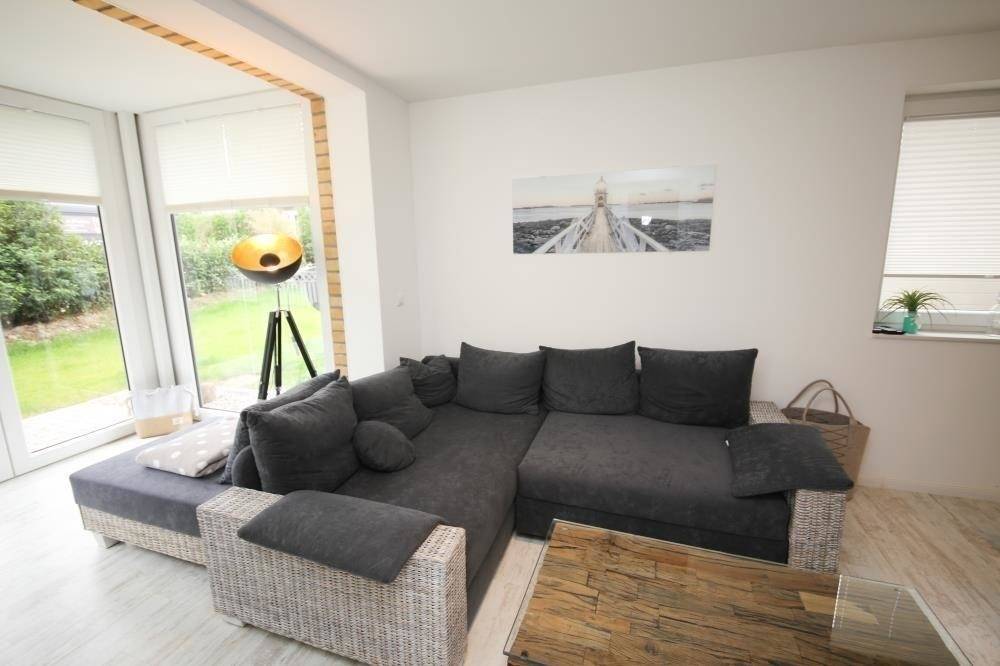 Das stilvolle Haus ist Ende 2019 fertiggestellt und modern, maritim eingerichtet. Große bodentiefe Fenster im Wohn- und Schlafbereich und moderne Bodenbeläge sorgen für eine helle und gemütliche Atmosphäre. Im Wohnzimmer befinden sich eine bequeme Couch und ein hochwertiger Essbereich im maritimen Stil für sechs Personen. An das Wohnzimmer grenzt ein kleiner Wintergarten, der vom sonnigen Garten umgeben ist. Im Erdgeschoss können Sie neben dem Gäste-WC die hauseigene, moderne Sauna im geräumigen Saunaraum erleben. Die offene Marken-Küche ist unter anderem mit Markengeräten von Neff mit Induktionsherd, Kühl-/Gefrierschrank, Backofen, Mikrowelle, Kaffeevollautomat und Geschirrspülmaschine ausgestattet. Im Obergeschoss befinden sich zwei Schlafzimmer jeweils mit Boxspringbetten. Das eine Schlafzimmer ist in L-Form geräumig geschnitten und komfortabel mit Doppelbett, XL-Couchsessel und hochwertigen Elektrokamin ausgestattet. Vom Schlafzimmer aus gelangen Sie zum Südbalkon. Das weitere Schlafzimmer im Obergeschoss ist mit zwei Boxspring-Einzelbetten versehen, die auch als Doppelbett zusammengestellt werden können. Beide Schlafzimmer sind mit Verdunkelungs-Plissee's für ein angenehmen Schlaf ausgestattet. Das modern geflieste Badezimmer ist als Vollbad mit Dusche, WC und Badewanne ausgestattet. Das Dachgeschoss hat seinen Charm durch die hohe Giebel-Decke und bietet weiteren Schlafraum mit einem Doppelbett. Alle Schlafräume sowie das Wohnzimmer sind mit großen, modernen Flachbild-Fernsehern mit Telekom MagentaTV ausgestattet. Schnelles Glasfasernetz mit WLan und Fußbodenheizung sind im ganzen Haus vorhanden.