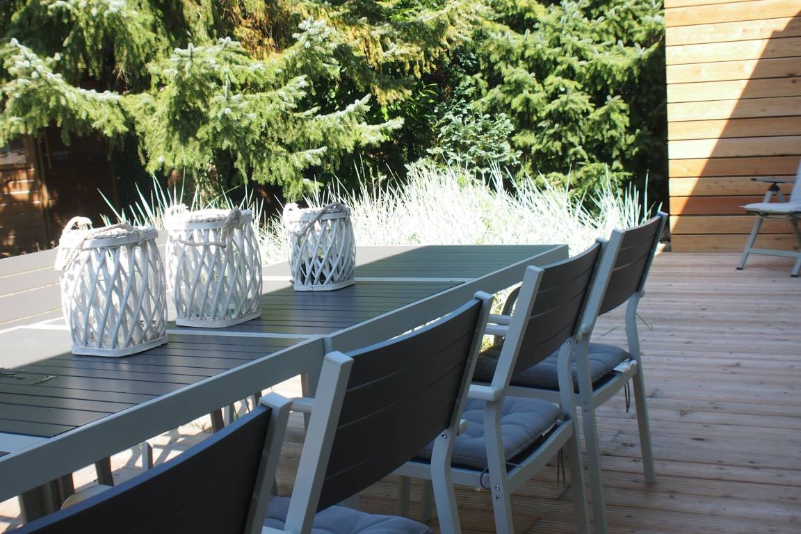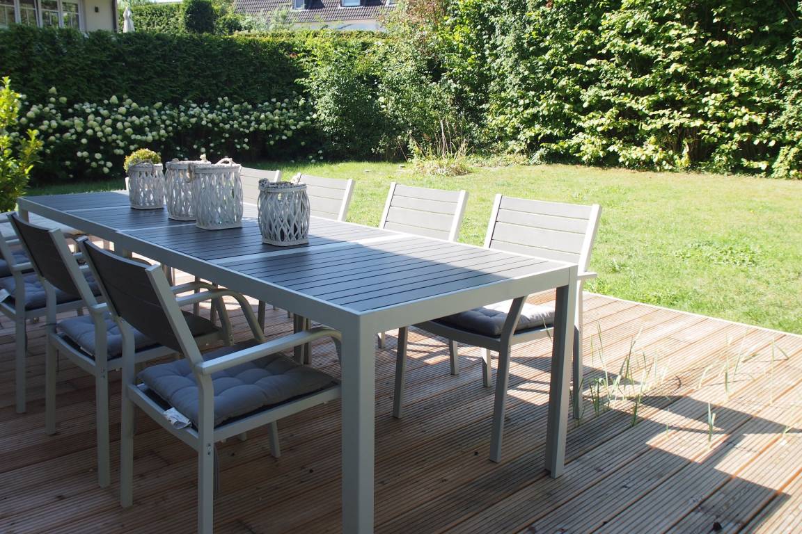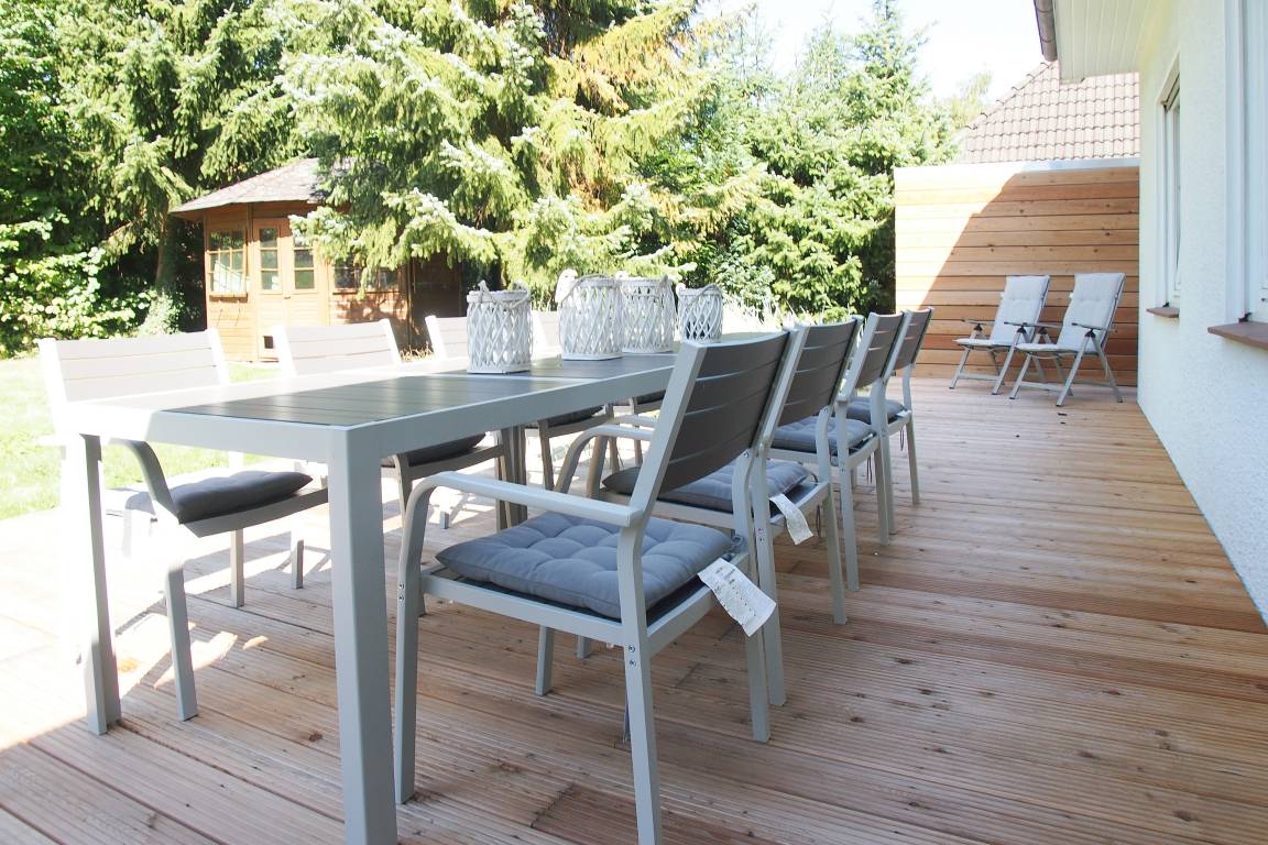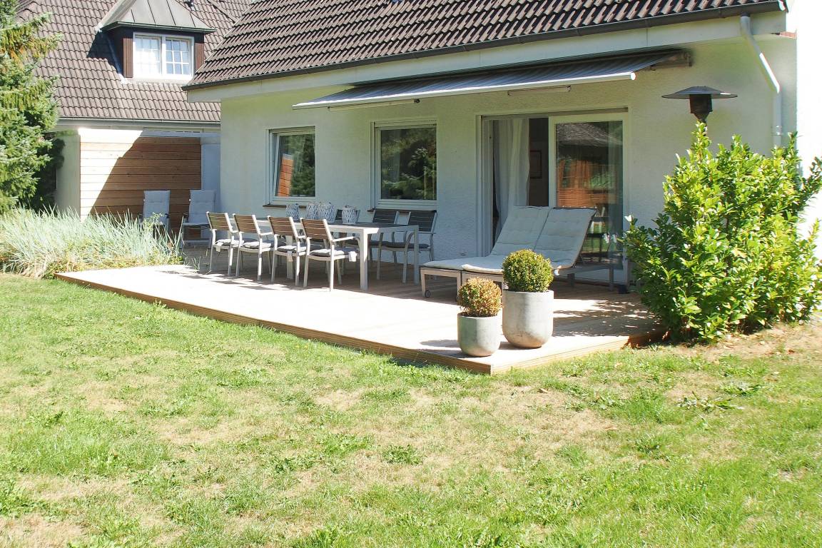 Die 30 qm große Sonnenterrasse ist mit einer Sitzgruppe für 8 Personen ausgestattet. Markise und Sonnenliegen sind selbstverständlich vorhanden. Das Gartengrundstück ist eingezäunt. Waschmaschine und Trockner sind im Keller untergebracht. Es steht ein PKW Stellplatz auf dem Grundstück zur Verfügung.