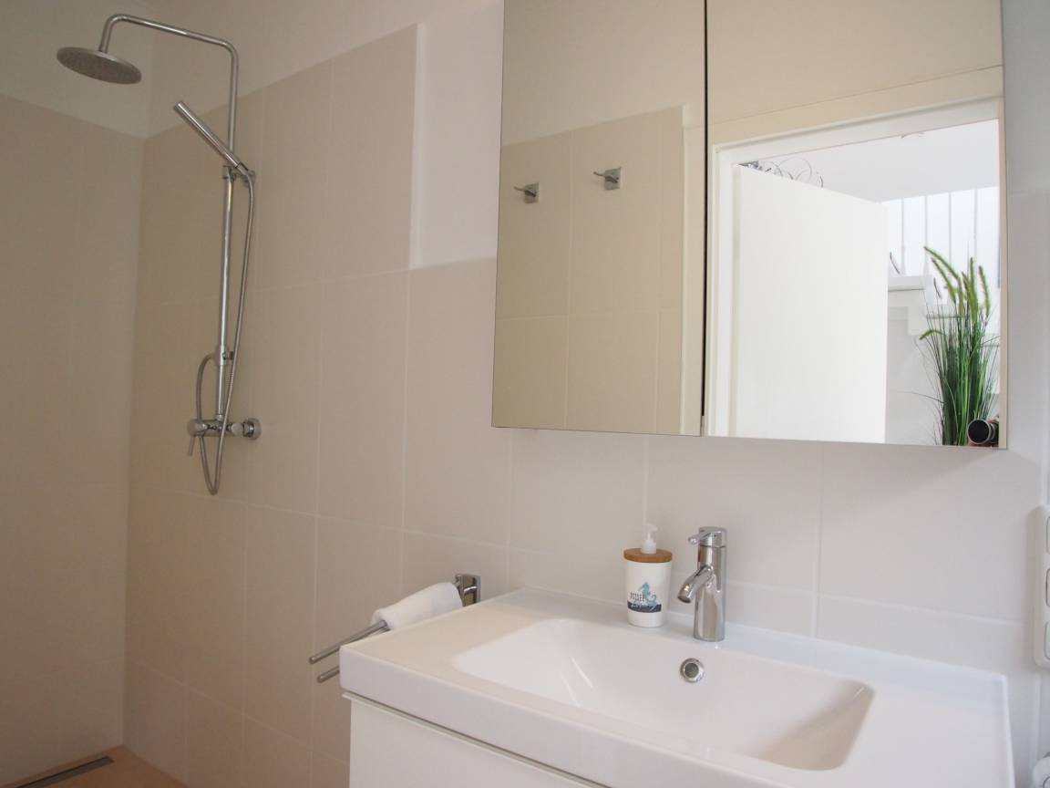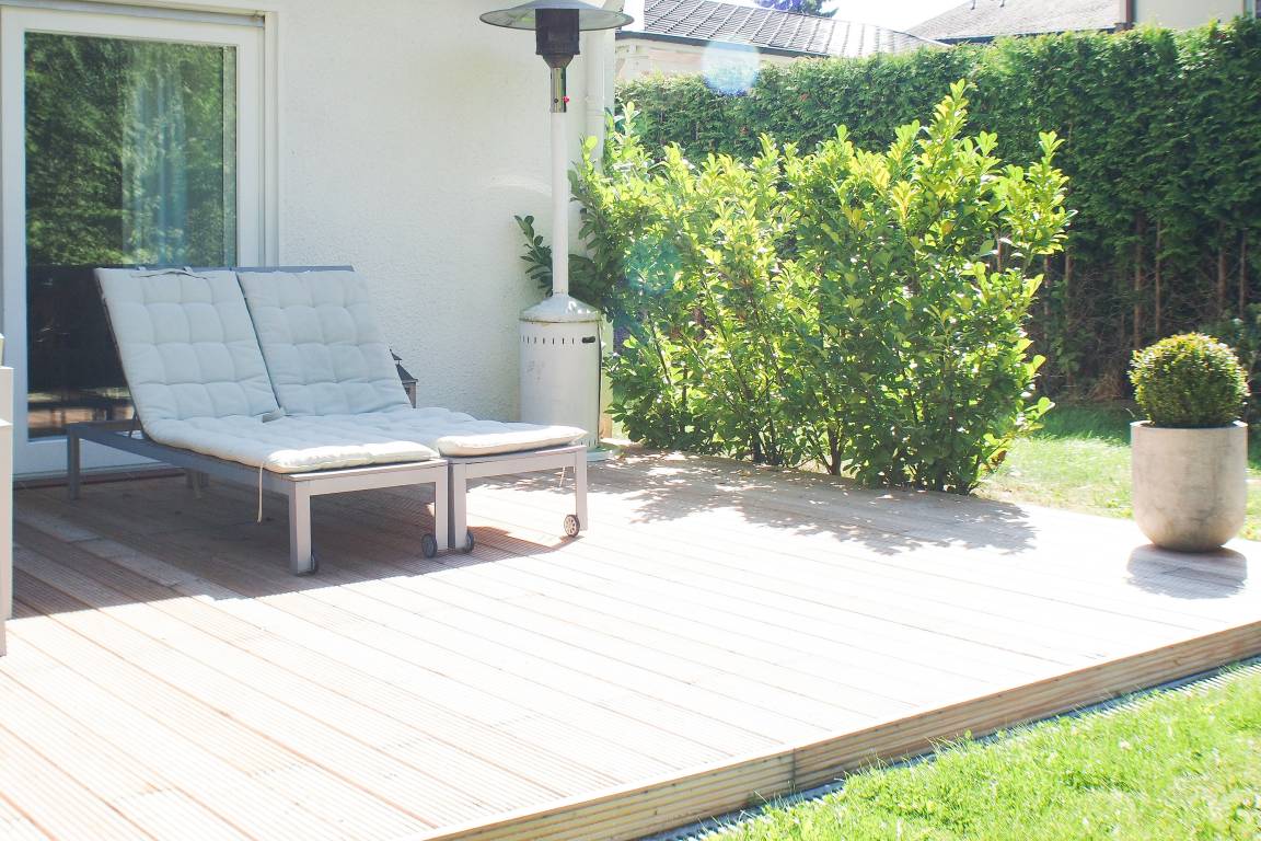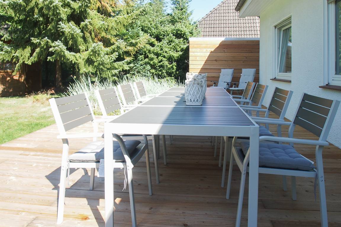 Die 30 qm große Sonnenterrasse ist mit einer Sitzgruppe für 8 Personen ausgestattet. Markise und Sonnenliegen sind selbstverständlich vorhanden. Das Gartengrundstück ist eingezäunt. Waschmaschine und Trockner sind im Keller untergebracht. Es steht ein PKW Stellplatz auf dem Grundstück zur Verfügung.