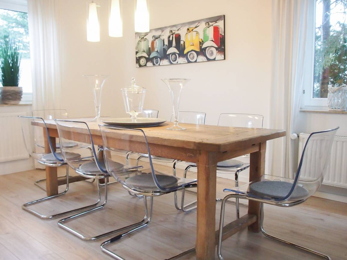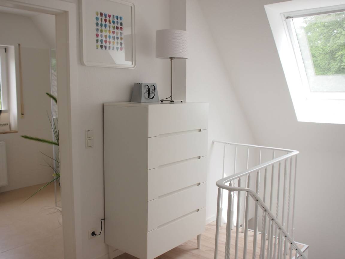 Das Ferienhaus bietet mit 4 Schlafzimmern, ausgestattet mit 3 Doppelbetten (180x200) und einem Einzelbett mit Auszug (160x200) sowie zwei Bädern ausreichend Platz für 7-8 Personen. Im Erdgeschoss befindet sich eine Einbauküche, ein großzügiger, heller Wohn-und Essbereich sowie ein Schlafzimmer mit Doppelbett und ein Duschbad. Im Obergeschoss stehen 3 separate Schlafzimmer mit TV, ein Duschbad sowie die Sauna (Münzbetrieb) zur Verfügung. Internetzugang ist über WLAN gegeben.