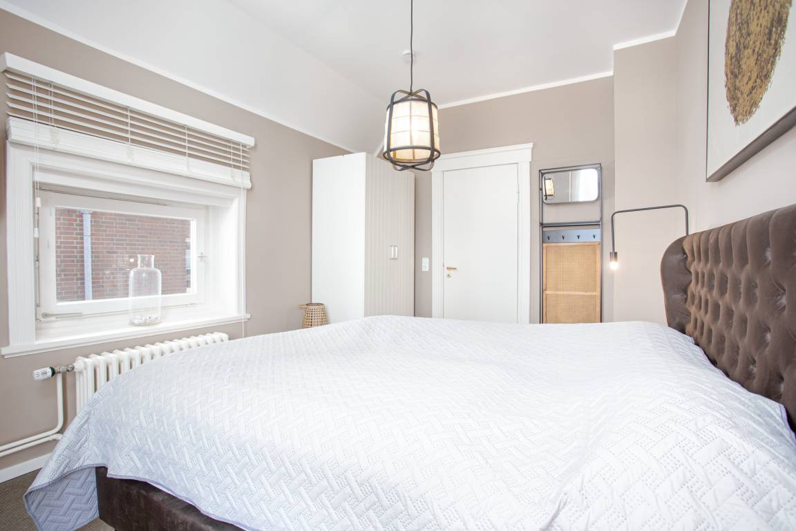 Das helle Schlafzimmer hat ein bequemes Doppelbett mit Flachbild TV und vom Bett aus genießen Sie ebenfalls einen fabelhaften, direkten Blick auf die Ostsee.