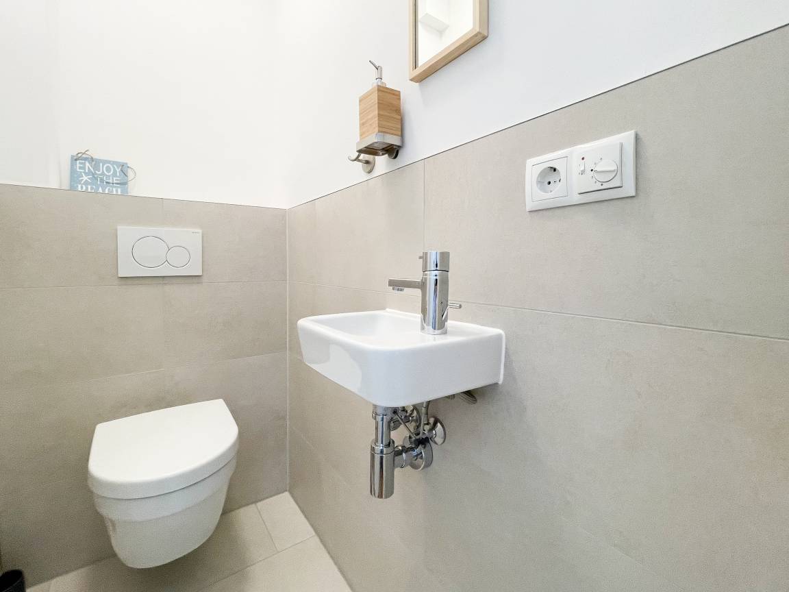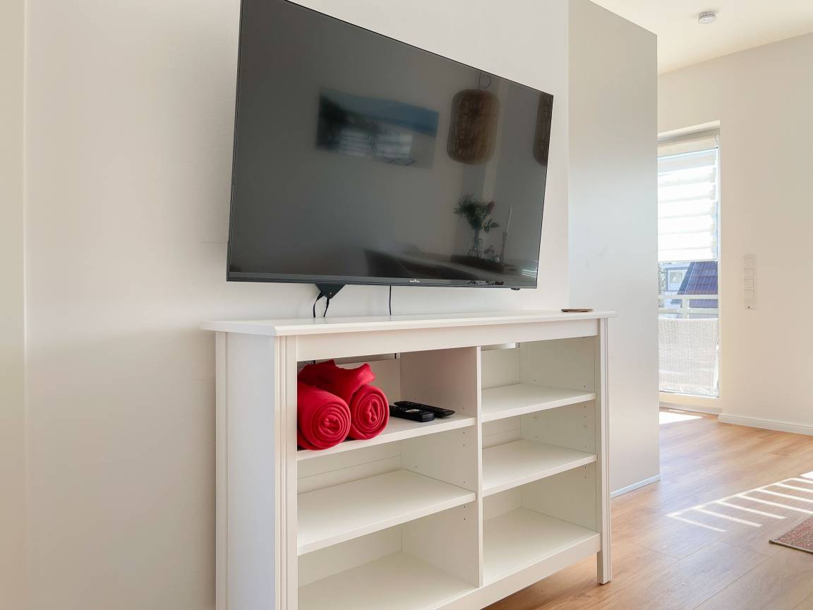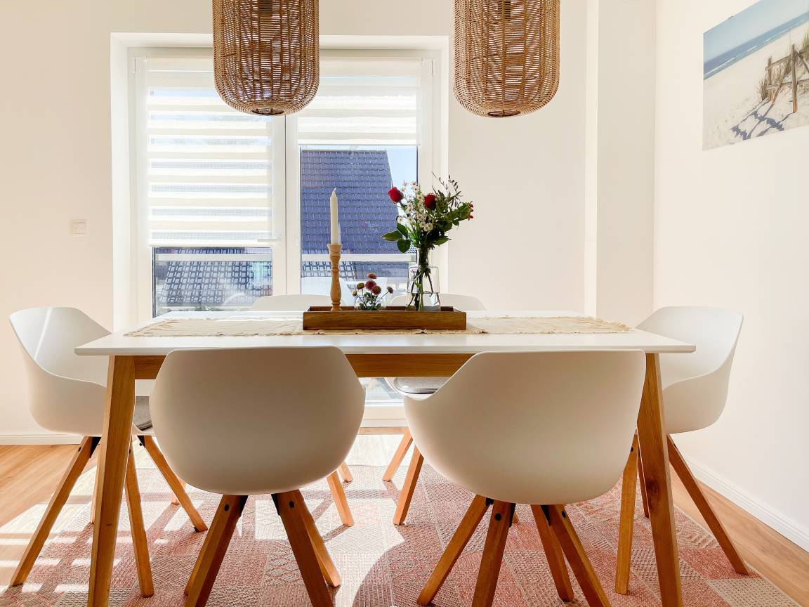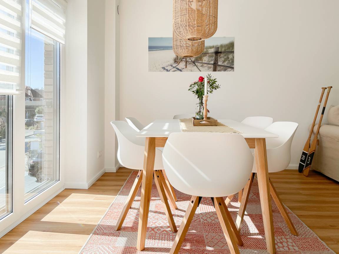 Es erwartet Sie eine wunderschöne Ferienwohnung, die Gemütlichkeit und Wohlbefinden vermittelt. Warme Farben, viel Licht und ein durchdachtes Raumkonzept schaffen eine ganz besondere Atmosphäre und eine Lüftungsanlage sorgt durch permanenten Frischluft Austausch für eine gute Luftqualität in allen Räumen. Sämtliche Fenster sind mit elektrischen Außenjalousien versehen und die Fußbodenheizung sorgt für angenehme Wärme.[nbsp] Der Wohnbereich ist mit einem gemütlichen Ecksofa mit Schlaffunktion und TV ausgestattet. Der anschließende Essbereich bietet ausreichend Platz für 6 Personen und fügt sich harmonisch in die bestens ausgestattete Wohnküche ein. Der vorgelagerte kleine Südbalkon verfügt über 2 Gartensessel, einen kleinen Tisch und 2 weitere Gartenstühle. Es gibt 2 Schlafzimmer, die mit Doppelbetten und Kleiderschränken ausgestattet sind, eines der beiden mit einem zusätzlichen TV. Neben dem modernen Bad mit Waschtisch, WC, Walk In Dusche und Fenster, gibt es ein zusätzliches Gäste WC. WLAN steht selbstverständlich kostenlos zur Verfügung. Die Waschmaschine ist in einem separaten Abstellraum innerhalb der Wohnung untergebracht.