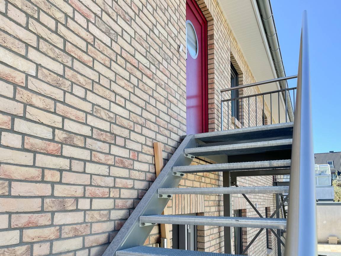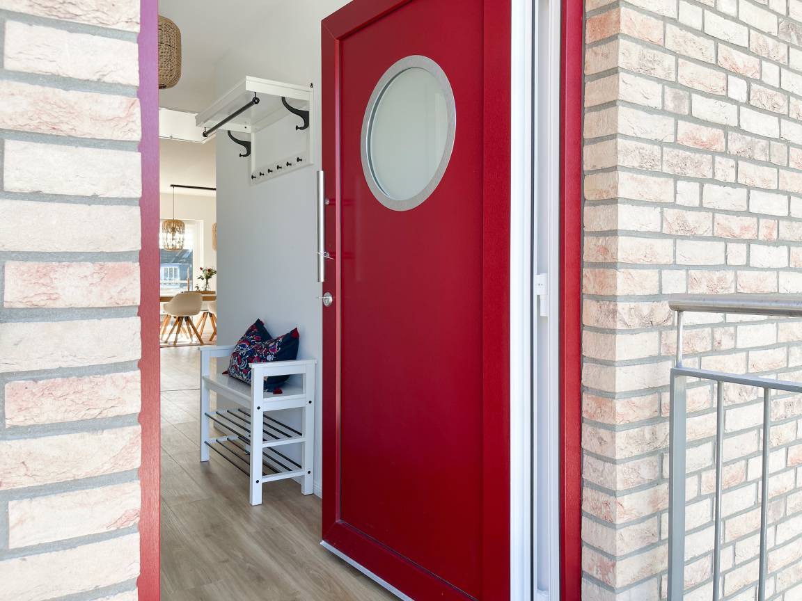 Über eine Außentreppe gelangt man zum privaten Eingang der Ferienwohnung. Ein Parkplatz befindet sich auf dem Grundstück direkt am Haus.