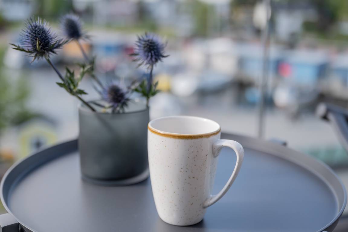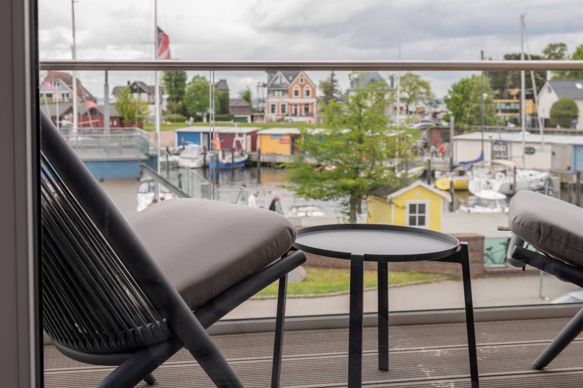 Sie betreten unsere Venus durch einen Flur mit einer großzügigen Garderobe mit Sitzgelegenheit. Vom Flur gehen das Wohnzimmer, das Schlafzimmer und das Badezimmer ab. Im Wohnbereich befindet sich eine vollausgestattete Einbauküche mit Essbereich für vier Personen, ein kuscheliges Hussensofa, ein Sessel und ein Flachbild-TV. Vom Wohnzimmer aus kommen Sie auf den Balkon mit Nord-, Süd- und West-Ausrichtung und unmittelbaren Hafenblick, auf dem Sie ein kleiner Tisch, Stühle und gemütliche Lounger erwarten. Hier können Sie den ersten Kaffee des Tages oder am Abend einen erfrischenden Sundowner genießen. Das Schlafzimmer verfügt über ein gemütliches Boxspringbett, zwei große Kleiderschränke mit einem Zimmersafe und einen Flachbild-TV. Entschleunigen können Sie im separaten Badezimmer mit integriertem Internet-Radio und einer Regendusche. Die hochwertige Einrichtung umfasst u. a. Möbel von Riviera Maison. Das Boxspringbett könnte ungeeignet sein für Personen mit einem sehr festen Liegegefühl.