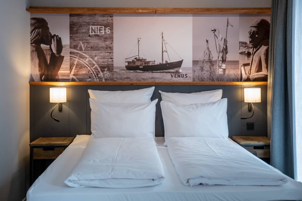 Unsere Großen Kajüten sind ganz im Stil der Region nordisch-maritim eingerichtet und verfügen jeweils über ein separates Wohn- und Schlafzimmer. Alle unsere Kajüten sind nach Fischkuttern benannt, die früher einmal im romantischen Niendorfer Hafen beheimatet waren.