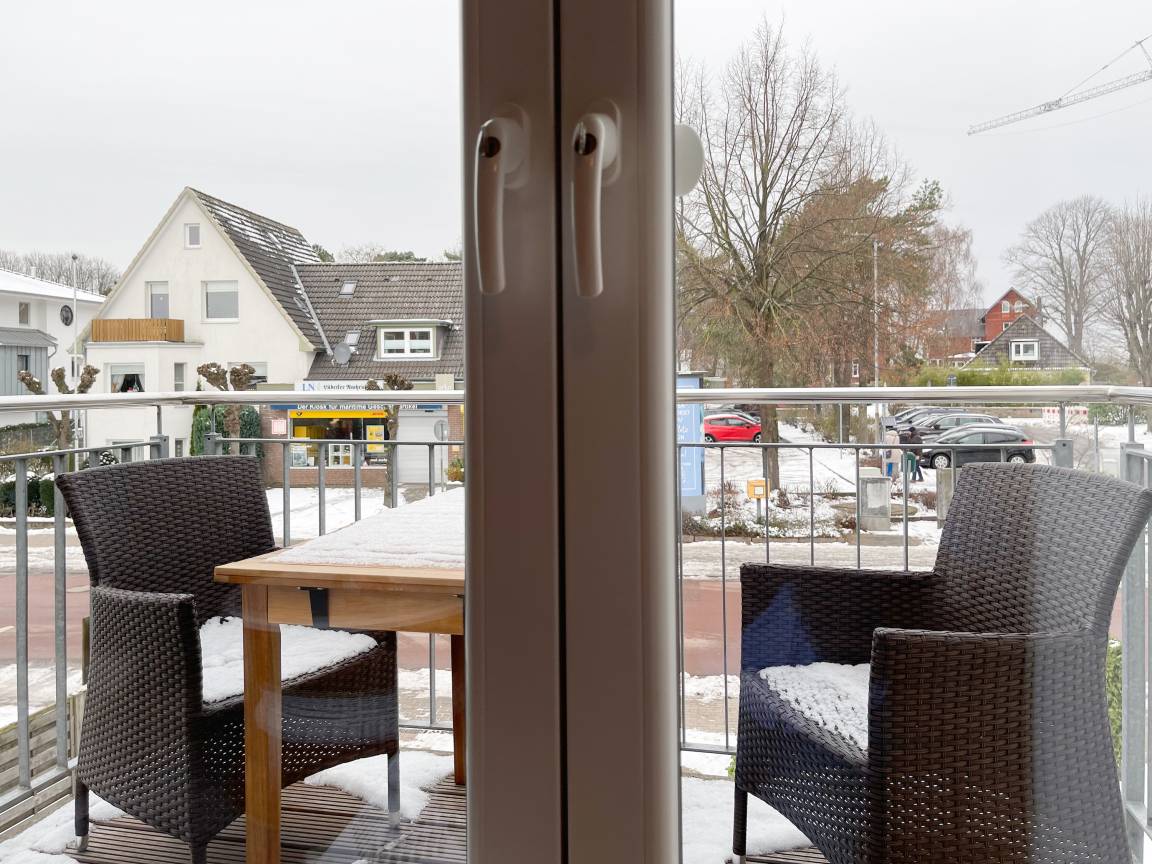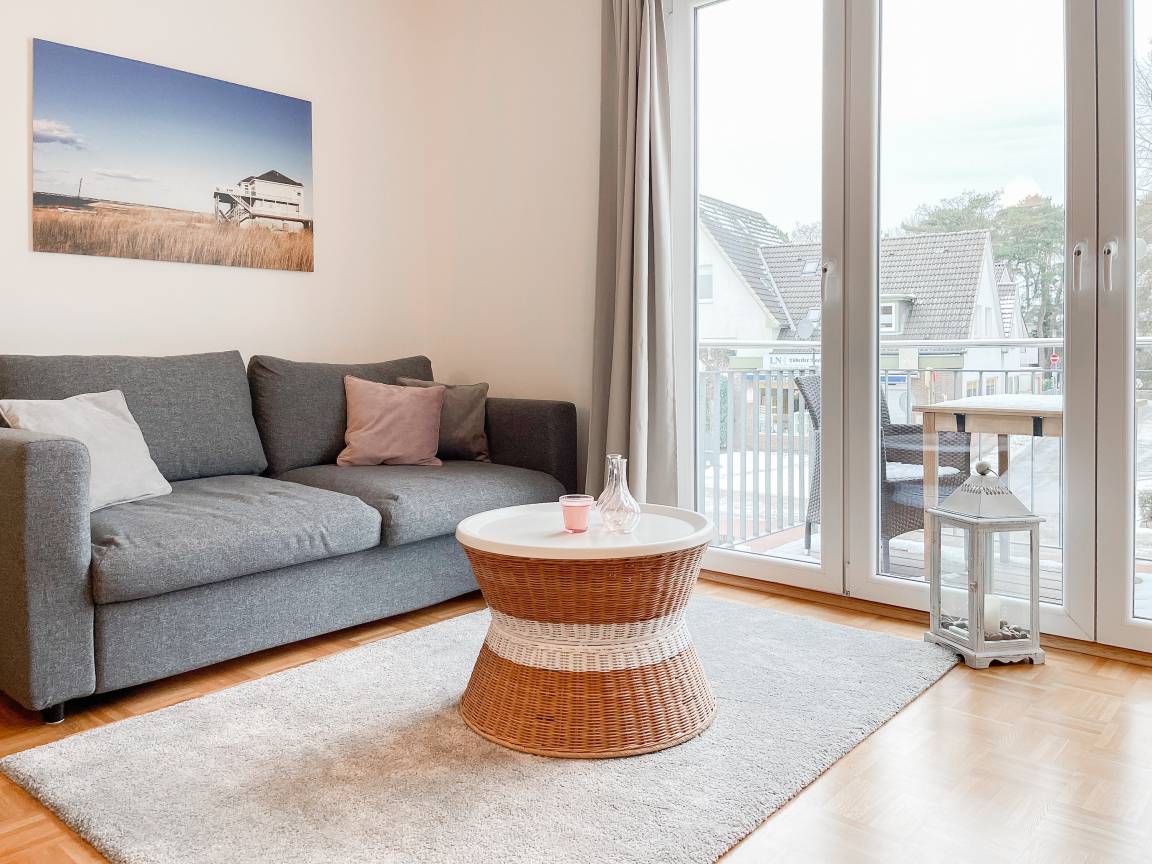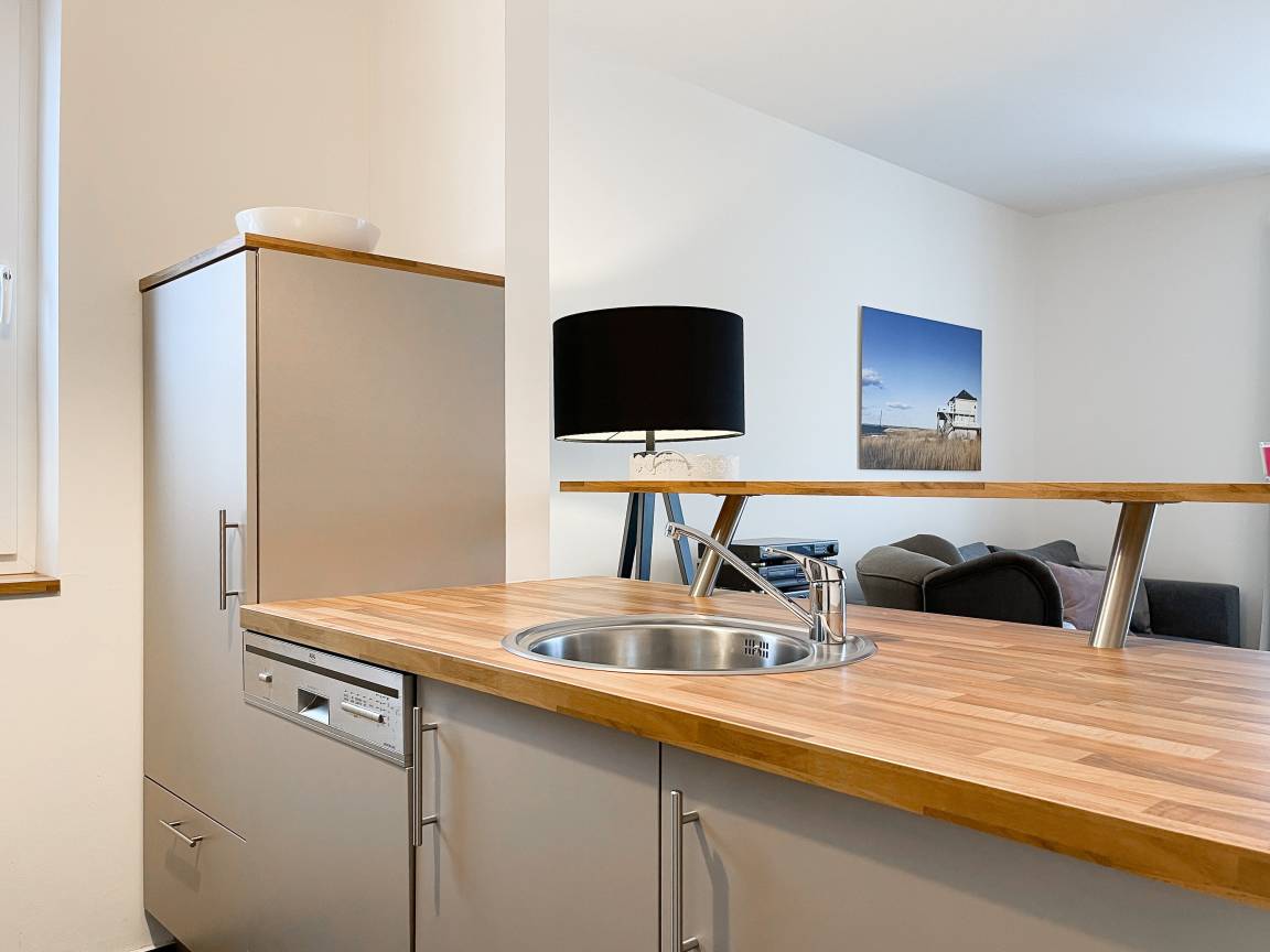 Ankommen und wohl fühlen in der liebevoll eingerichteten Ferienwohnung Kleine Jolle. Es erwartet Sie ein großzügiger Wohn- Essbereich, der mit einem Schlafsofa (140x190), einem gemütlichen Lesesessel, TV, Hifi-Anlage und WLAN ausgestattet ist. Bodentiefe Fensterelemente führen auf den Balkon in Nordwest Ausrichtung, um die letzen Sonnenstunden zu genießen. Der anschließende Essbereich bietet ausreichend Platz für 4 Personen. Die angrenzende Einbauküche mit Tresen ist bestens ausgestattet.[nbsp] Im separatem Schlafzimmer befindet sich ein Doppelbett (180x200), ein Kleiderschrank mit viel Staufläche sowie ein weiterer TV. Die Fenster lassen sich durch Plissees verdunkeln. Das moderne, großzügige Bad mit ist sowohl mit einer bodentiefen Walk-In Dusche als auch einer Badewanne ausgestattet. Ein Fahrstuhl ist vorhanden. Waschmaschine und Trockner (Münzgeräte) sind im Keller untergebracht und stehen zur gemeinschaftlichen Nutzung zur Verfügung. Ein reservierter Parkplatz auf dem Grundstück gehört zur Wohnung.