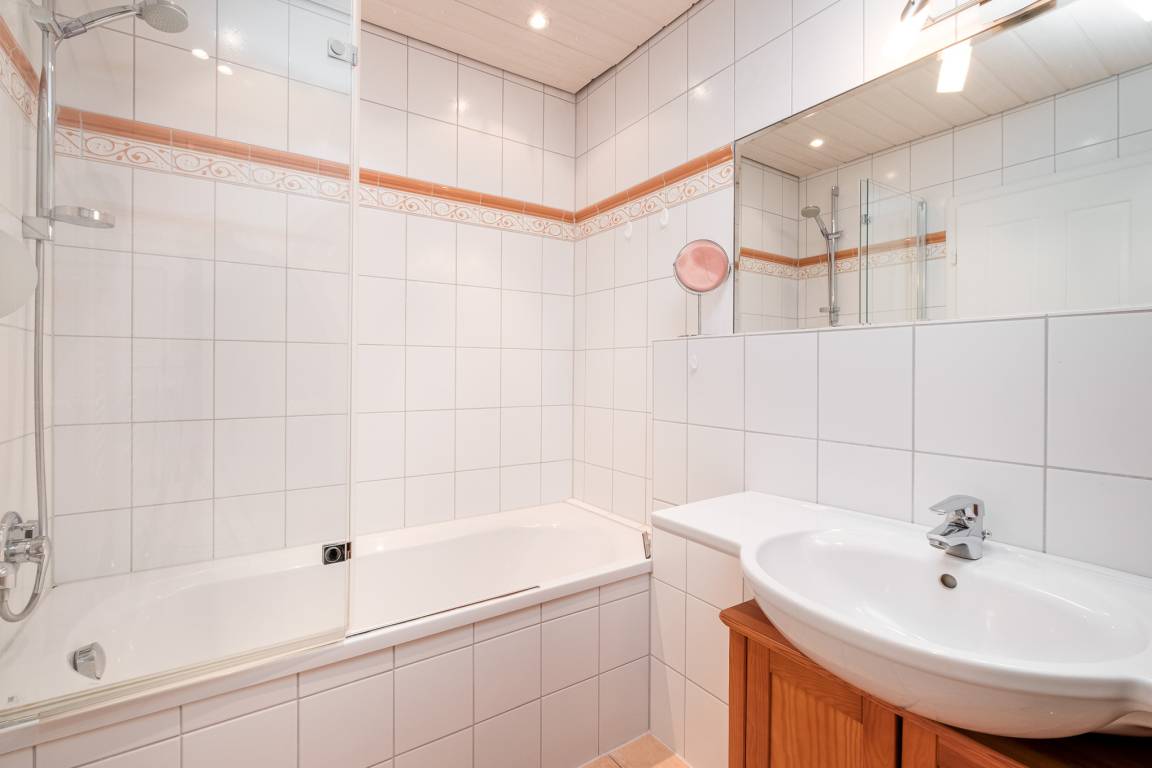 Im hellen Badezimmer gibt es eine Badewanne, WC, Fön und einen Kosmetikspiegel.