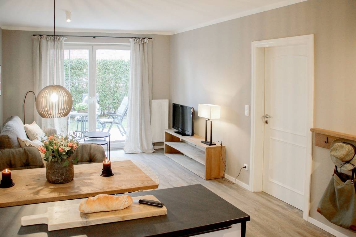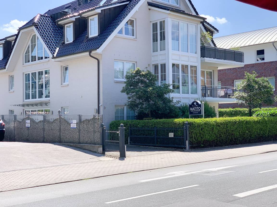 Die in 2022 renovierte Ferienwohnung befindet sich im Erdgeschoss im Haus Matito und ist bestens für 3 Personen geeignet, um einen schönen Urlaub zu verbringen. Warme Farben und die hochwertige Einrichtung mit viel Liebe zum Detail sorgen für eine wunderbare Atmosphäre zum wohl fühlen. Die neue Einbauküche ist bestens ausgestattet und der gemütliche Essbereich fügt sich perfekt ein. Das Sofa mit Schlaffunktion bietet eine Liegefläche von 140x200. TV, Radio und kostenloser Internetzugang über WLAN stehen zur Verfügung. Das separate Schlafzimmer ist mit einem Doppelbett (180x200) und einem Kleiderschrank mit ausreichend Staufläche, ausgestattet. Das neue Duschbad ist sehr hochwertig gestaltet. Die vorgelagerte, großzügig angelegte Sonnenterrasse erstreckt sich über die gesamte Breite der Wohnung und ist ein echtes Highlight. Ein herrlicher Platz, um die Sonne zu genießen und zu entspannen! Zur Wohnung gehört ein fester PKW Stellplatz auf dem Grundstück und ein Fahrradständer (außen) ist vorhanden.