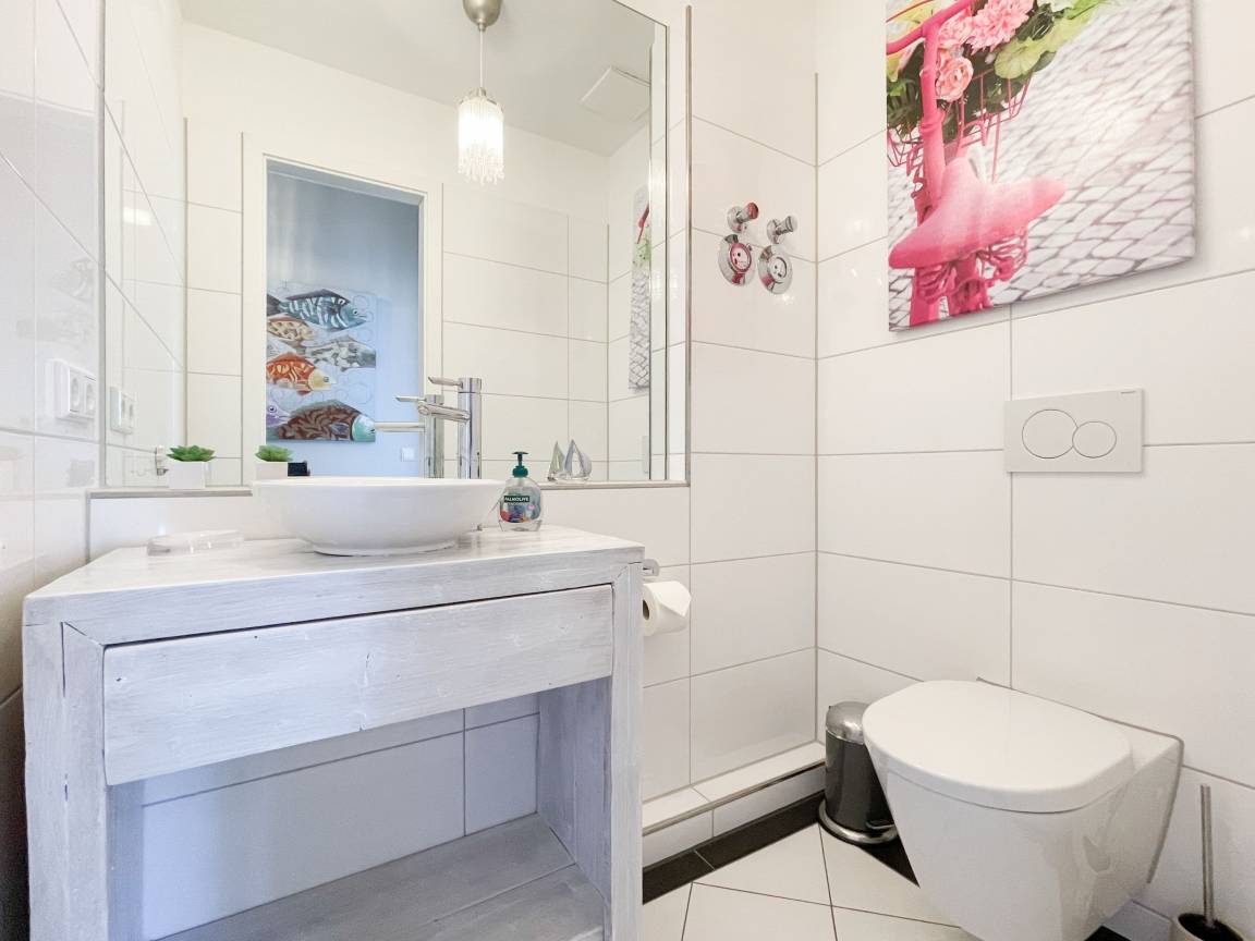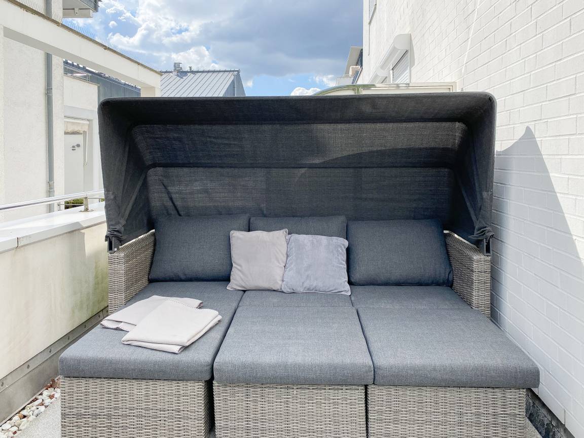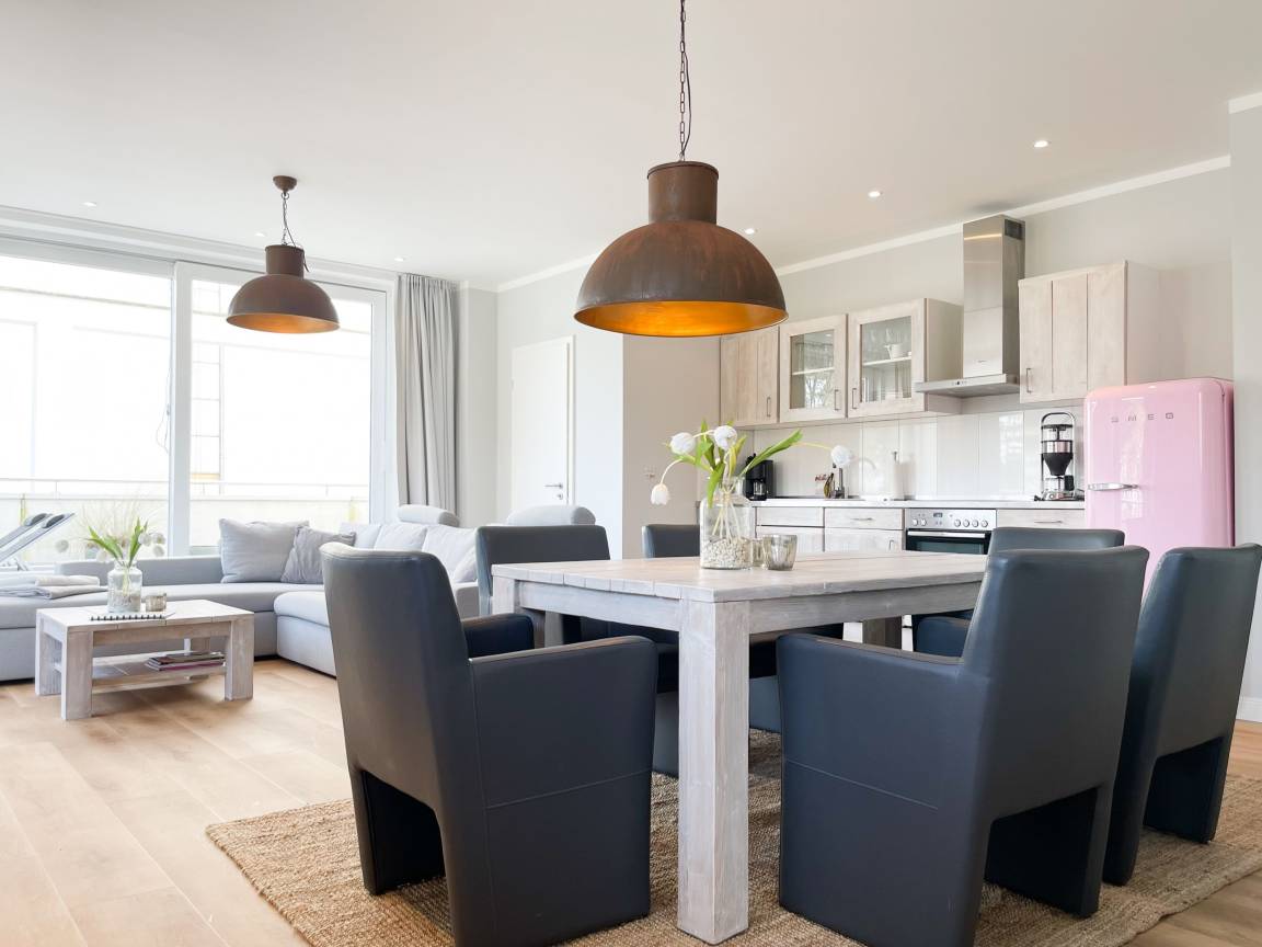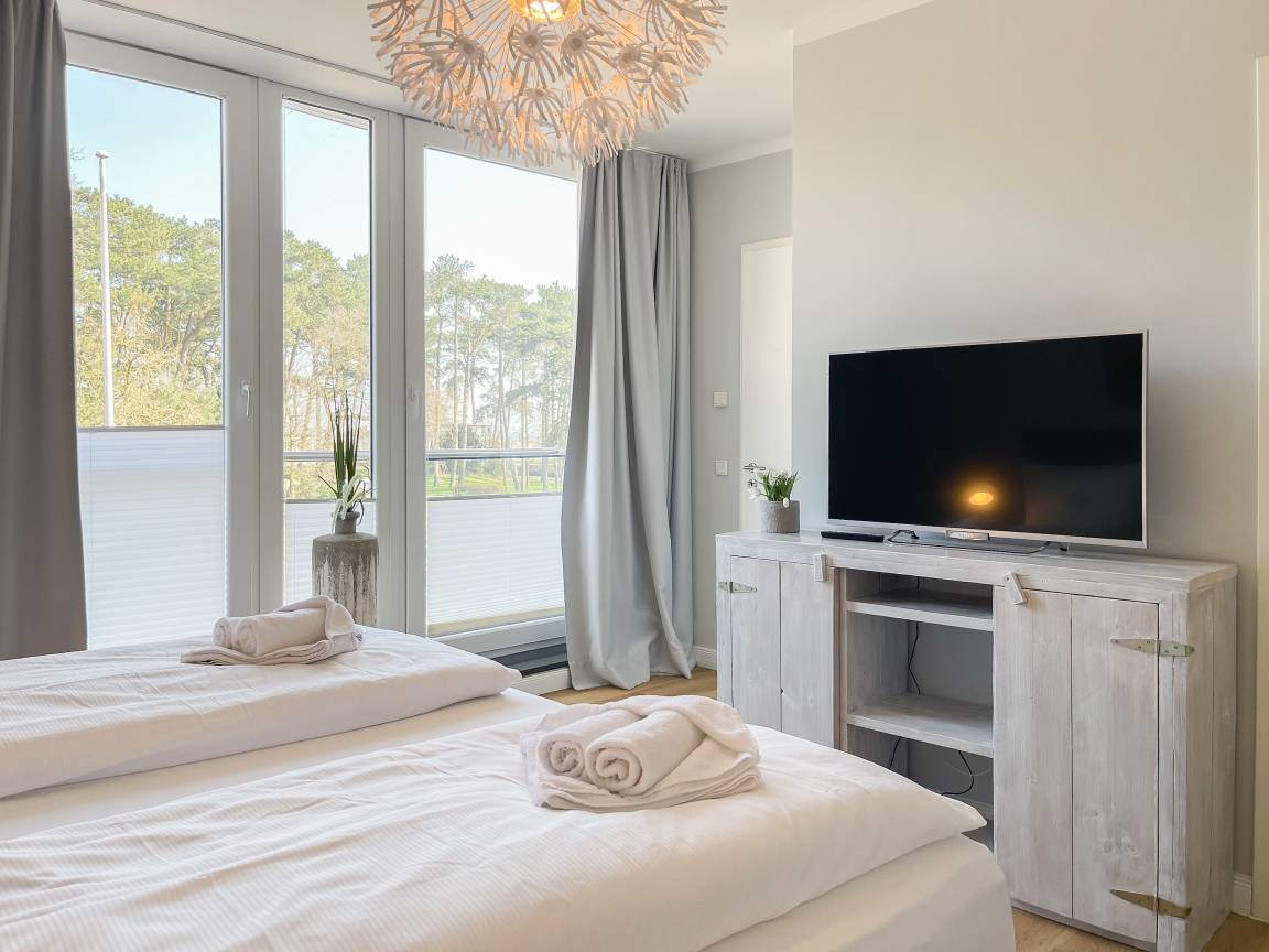Die Ferienwohnung Beach Pearl #1 befindet sich in der ersten Etage und bietet auf fast 90 qm viel Raum für 2 Personen, um einen entspannten Urlaub zu verleben. Große, bodentiefe Fensterflächen sorgen für reichlich Tageslicht und herrliche Ausblicke. Besonders hervorzuheben ist der riesige, umlaufende Balkon in Südostausrichtung, der teilweise überdacht und bestens möbliert ist. Im großzügigen Wohnraum erwartet Sie ein gemütliches XXL Ecksofa, TV, WLAN und ein Essbereich, der ausreichend Platz für 6 Personen bietet. Die integrierte Wohnküche verfügt über eine Spülmaschine, Backofen, Ceranfeld und einen großen Kühlschrank. Das separate Schlafzimmer ist mit einem Doppelbett (180x200), einem Kleiderschrank mit reichlich Stauraum für Ihre Urlaubsgarderobe, TV und Verdunkelungsvorhängen ausgestattet. Das Bad ensuite verfügt über einen Doppelwaschtisch, Radio, Dusche und eine integrierte Waschmaschine. Ein separates Gäste WC ist ebenfalls vorhanden. Zur Ferienwohnung gehört eine fester Tiefgaragen Stellplatz und das Haus verfügt selbstverständlich über einen Aufzug. Fahrradunterstellmöglichkeit vorhanden.