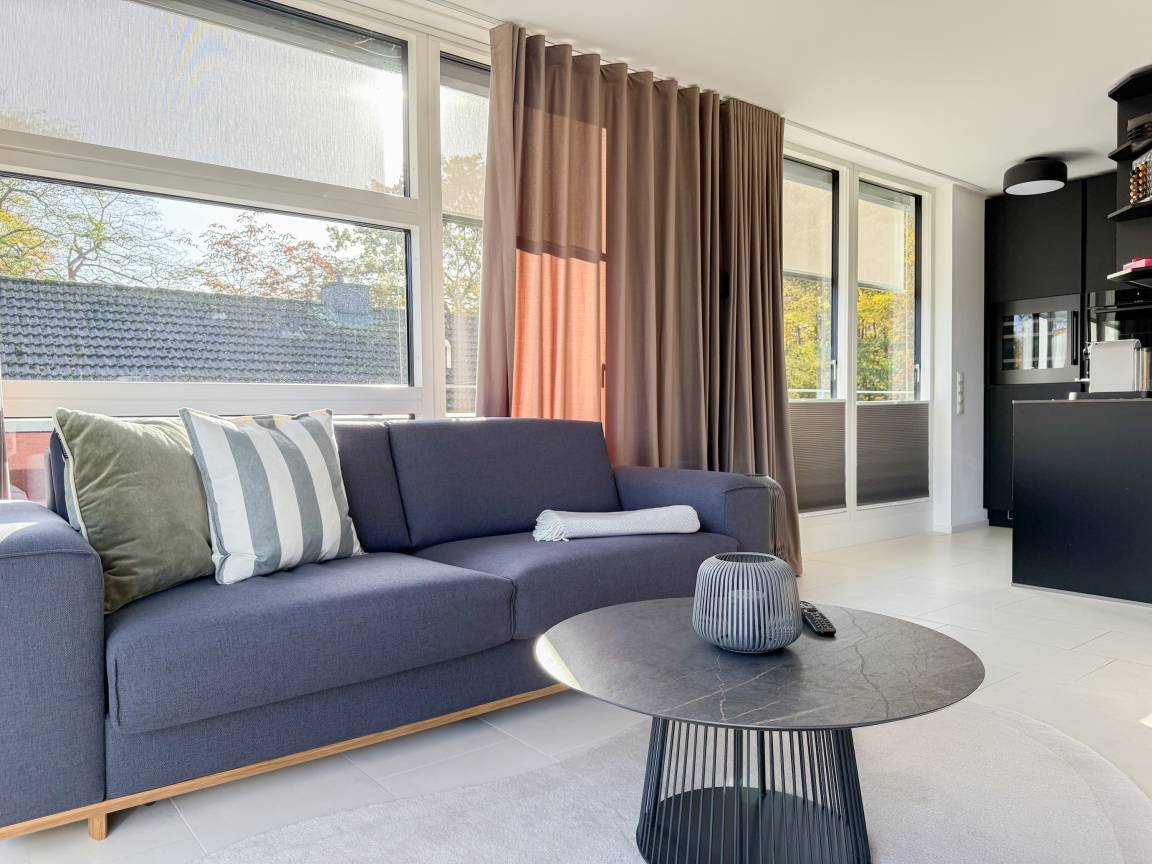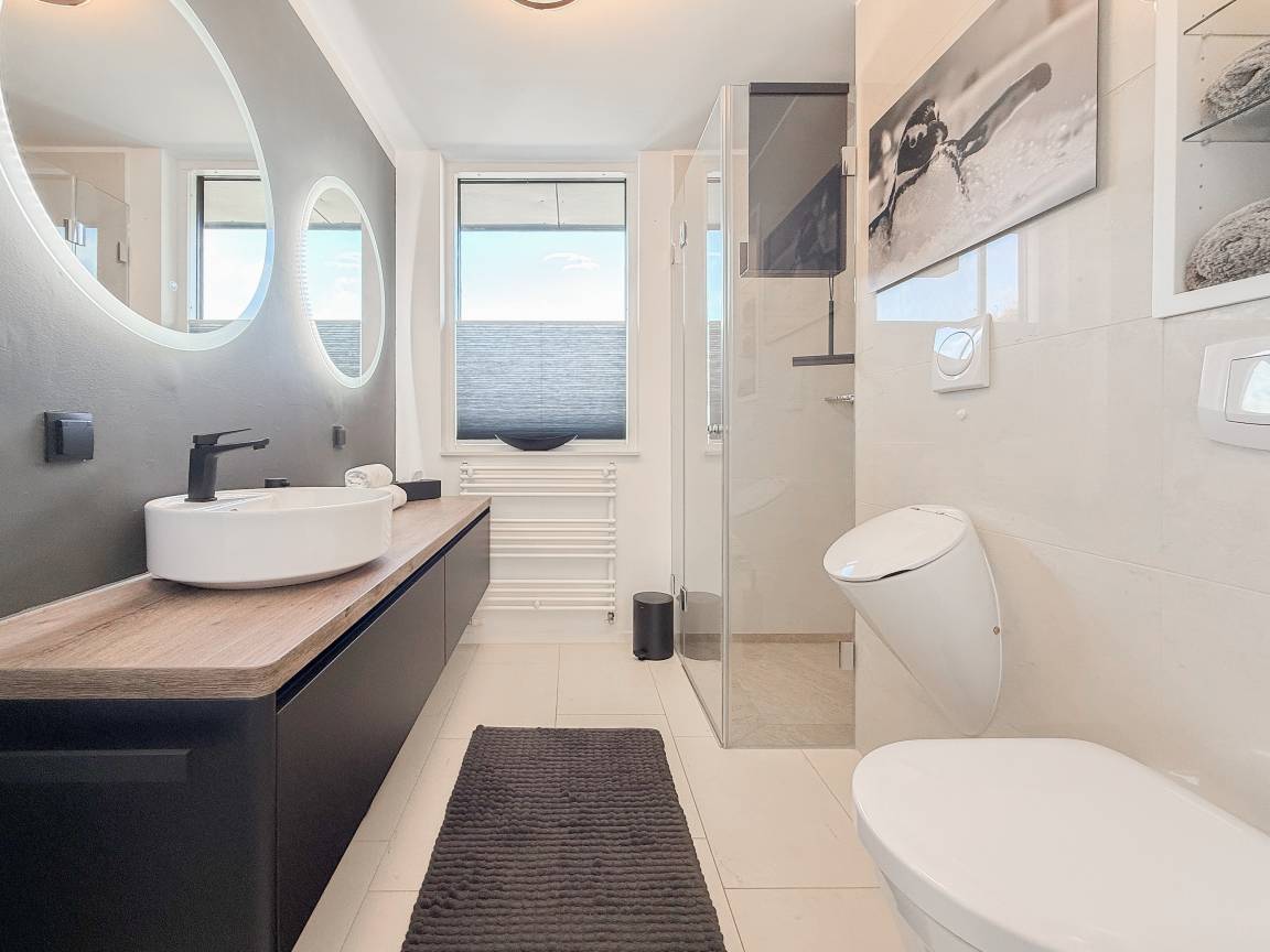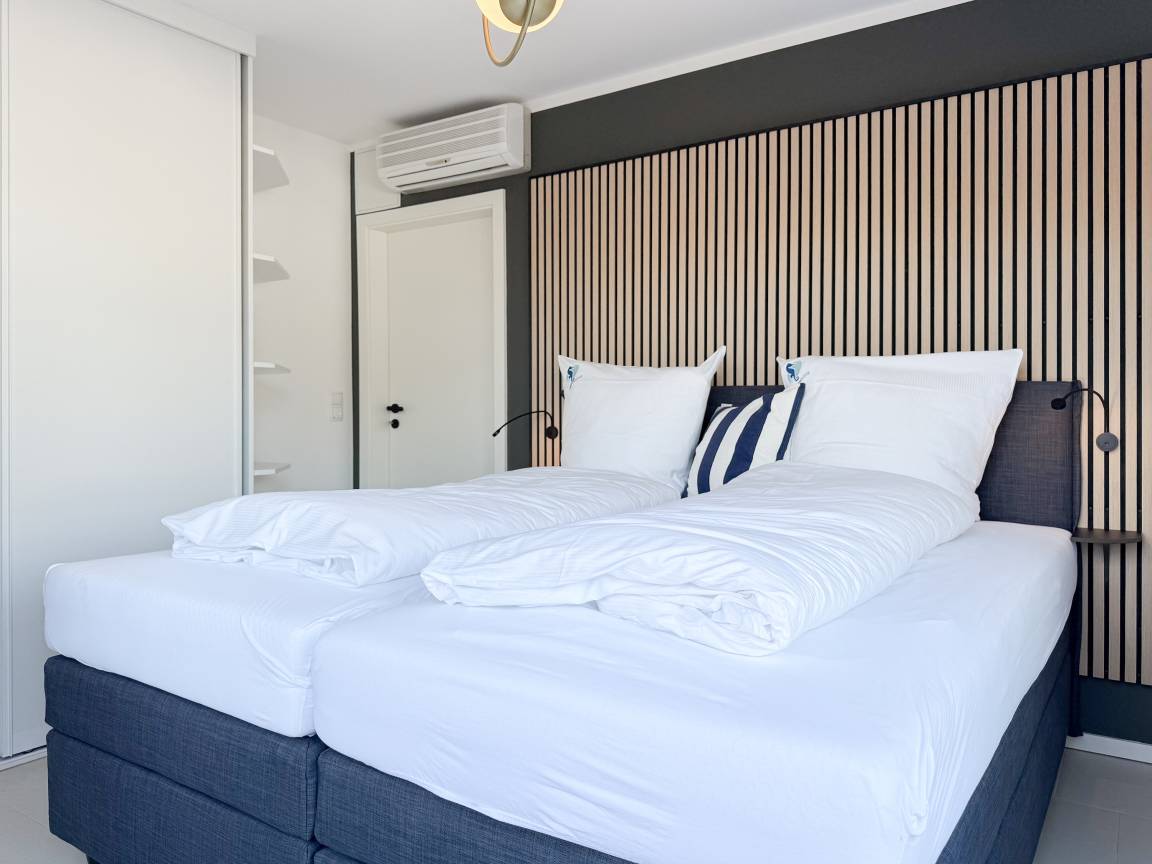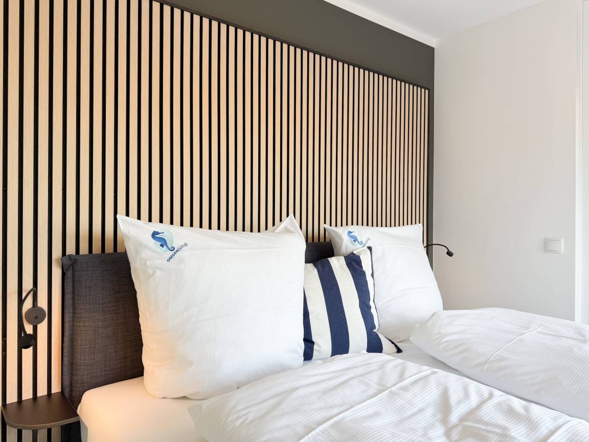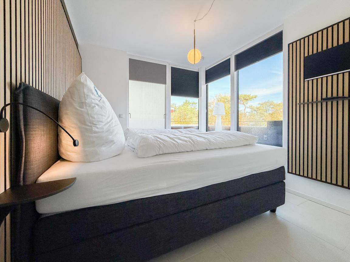 Das absolut neuwertige Penthouse begeistert durch ein stilvolles Interieur und eine luxuriöse Ausstattung. Umlaufende bodentiefe Fensterflächen sorgen für ein offenes Raumgefühl mit herrlichem Ausblick, teilweise bis auf die Ostsee. Genießen Sie viele entspannte Stunden auf der herrlichen Dachterrasse, die mit einem Essbereich, Sonnenschirmen und Loungebereich ausgestattet ist. Meeresrauschen und frische Seeluft inklusive! Der offen gestaltete Wohnbereich verfügt über ein komfortables Sofa mit Schlaffunktion, Smart-TV und Bluetooth-Radio. Der anschließende Essbereich bietet ausreichend Platz und die perfekt integrierte Designküche, bestens ausgestattet mit separatem Weinkühlschrank, lässt keine Wünsche offen. Das Schlafzimmer ist mit einem Doppelbett (180x200), einer Klimaanlage, Black-out-Plissees, einem Kleiderschrank mit ausreichend Stauraum und TV eingerichtet. Die Fenster im Wohnzimmer sind mit Vorhängen versehen und die Zugangstüren zur Dachterrasse, sowohl vom Schlafzimmer als auch vom Wohnzimmer, verfügen über Insektenschutzgitter. Das Duschbad ist geräumig, hochwertig und mit einem Fenster ausgestattet. Der Fahrstuhl führt von der Tiefgarage direkt in das Penthouse, sodass Urlaubsgepäck auf kurzem Wege bequem in die Wohnung gelangt. WLAN steht selbstverständlich kostenlos zur Verfügung.