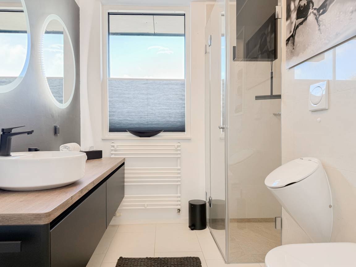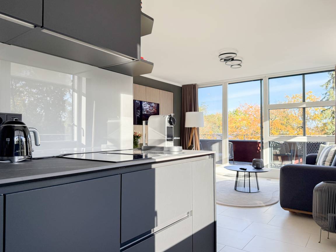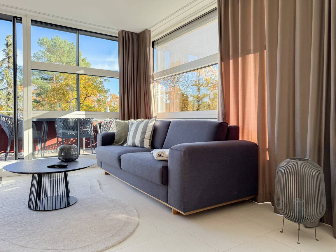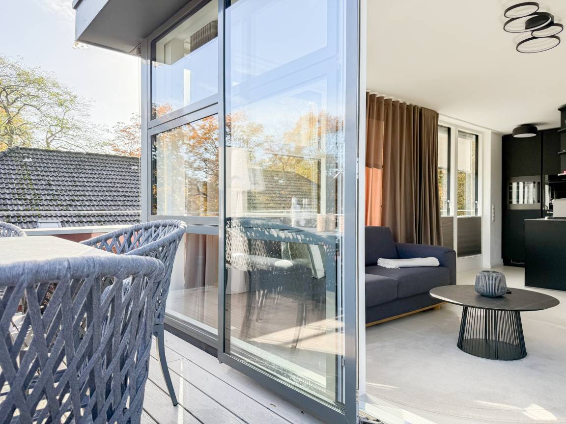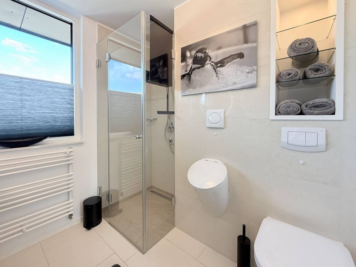 Das absolut neuwertige Penthouse begeistert durch ein stilvolles Interieur und eine luxuriöse Ausstattung. Umlaufende bodentiefe Fensterflächen sorgen für ein offenes Raumgefühl mit herrlichem Ausblick, teilweise bis auf die Ostsee. Genießen Sie viele entspannte Stunden auf der herrlichen Dachterrasse, die mit einem Essbereich, Sonnenschirmen und Loungebereich ausgestattet ist. Meeresrauschen und frische Seeluft inklusive! Der offen gestaltete Wohnbereich verfügt über ein komfortables Sofa mit Schlaffunktion, Smart-TV und Bluetooth-Radio. Der anschließende Essbereich bietet ausreichend Platz und die perfekt integrierte Designküche, bestens ausgestattet mit separatem Weinkühlschrank, lässt keine Wünsche offen. Das Schlafzimmer ist mit einem Doppelbett (180x200), einer Klimaanlage, Black-out-Plissees, einem Kleiderschrank mit ausreichend Stauraum und TV eingerichtet. Die Fenster im Wohnzimmer sind mit Vorhängen versehen und die Zugangstüren zur Dachterrasse, sowohl vom Schlafzimmer als auch vom Wohnzimmer, verfügen über Insektenschutzgitter. Das Duschbad ist geräumig, hochwertig und mit einem Fenster ausgestattet. Der Fahrstuhl führt von der Tiefgarage direkt in das Penthouse, sodass Urlaubsgepäck auf kurzem Wege bequem in die Wohnung gelangt. WLAN steht selbstverständlich kostenlos zur Verfügung.