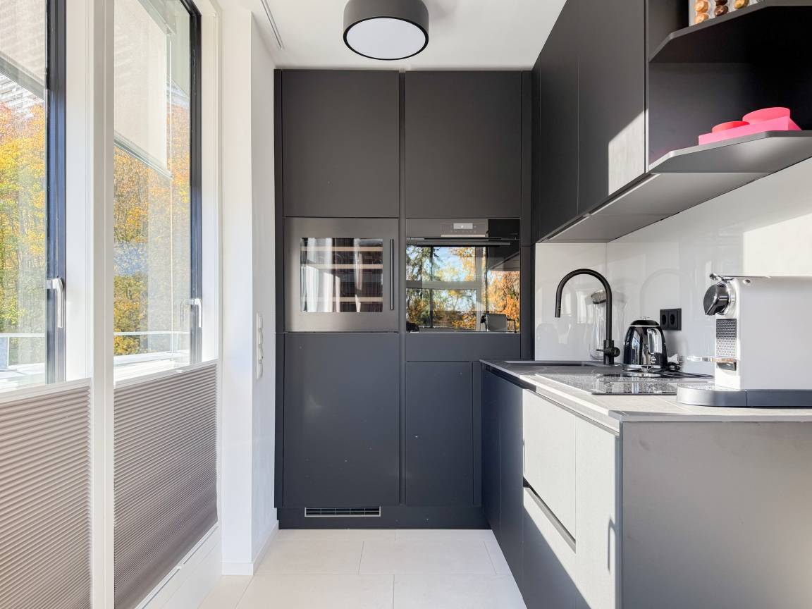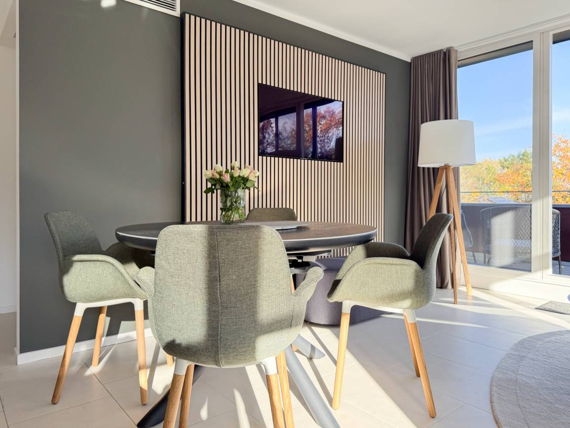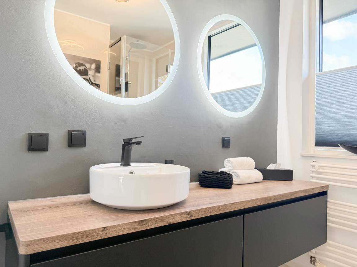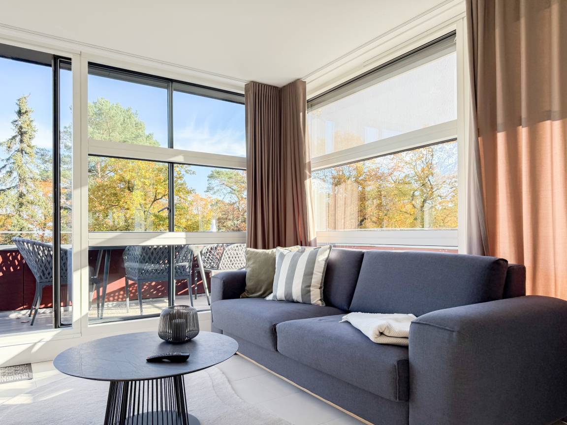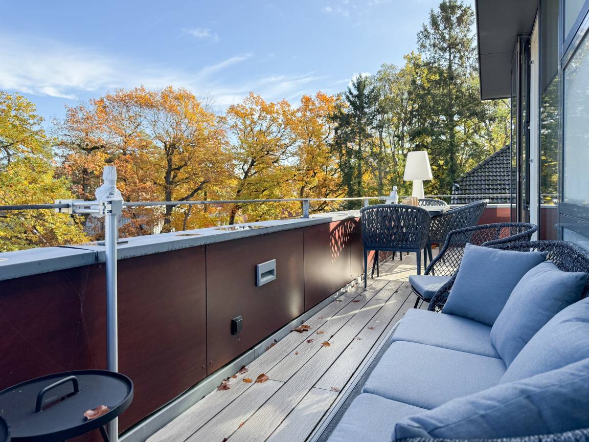 Das absolut neuwertige Penthouse begeistert durch ein stilvolles Interieur und eine luxuriöse Ausstattung. Umlaufende bodentiefe Fensterflächen sorgen für ein offenes Raumgefühl mit herrlichem Ausblick, teilweise bis auf die Ostsee. Genießen Sie viele entspannte Stunden auf der herrlichen Dachterrasse, die mit einem Essbereich, Sonnenschirmen und Loungebereich ausgestattet ist. Meeresrauschen und frische Seeluft inklusive! Der offen gestaltete Wohnbereich verfügt über ein komfortables Sofa mit Schlaffunktion, Smart-TV und Bluetooth-Radio. Der anschließende Essbereich bietet ausreichend Platz und die perfekt integrierte Designküche, bestens ausgestattet mit separatem Weinkühlschrank, lässt keine Wünsche offen. Das Schlafzimmer ist mit einem Doppelbett (180x200), einer Klimaanlage, Black-out-Plissees, einem Kleiderschrank mit ausreichend Stauraum und TV eingerichtet. Die Fenster im Wohnzimmer sind mit Vorhängen versehen und die Zugangstüren zur Dachterrasse, sowohl vom Schlafzimmer als auch vom Wohnzimmer, verfügen über Insektenschutzgitter. Das Duschbad ist geräumig, hochwertig und mit einem Fenster ausgestattet. Der Fahrstuhl führt von der Tiefgarage direkt in das Penthouse, sodass Urlaubsgepäck auf kurzem Wege bequem in die Wohnung gelangt. WLAN steht selbstverständlich kostenlos zur Verfügung.