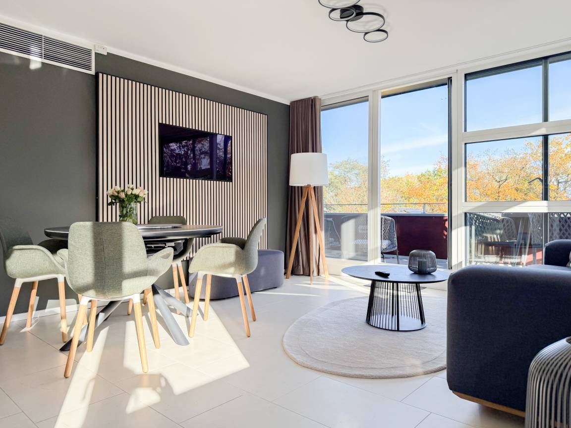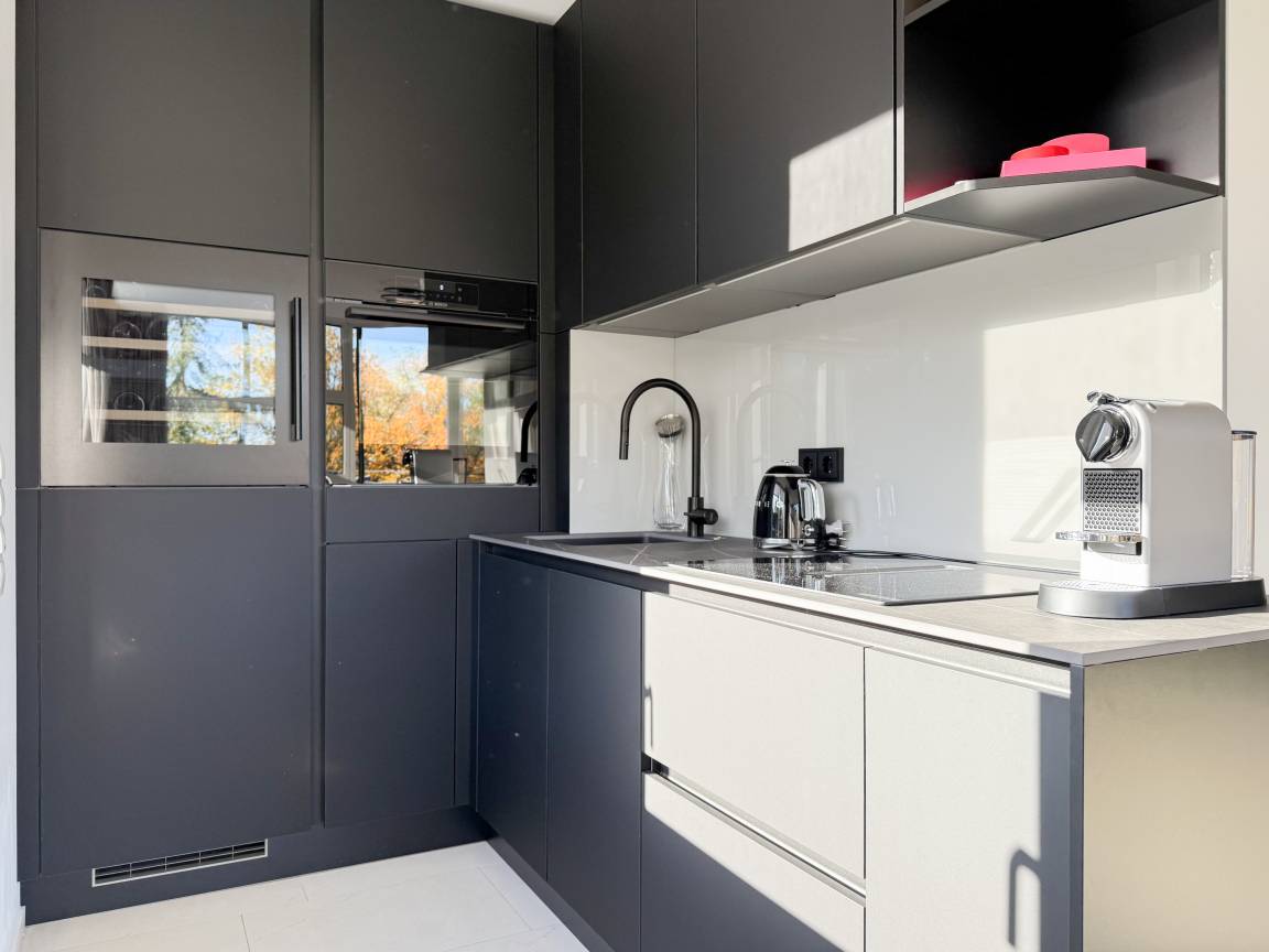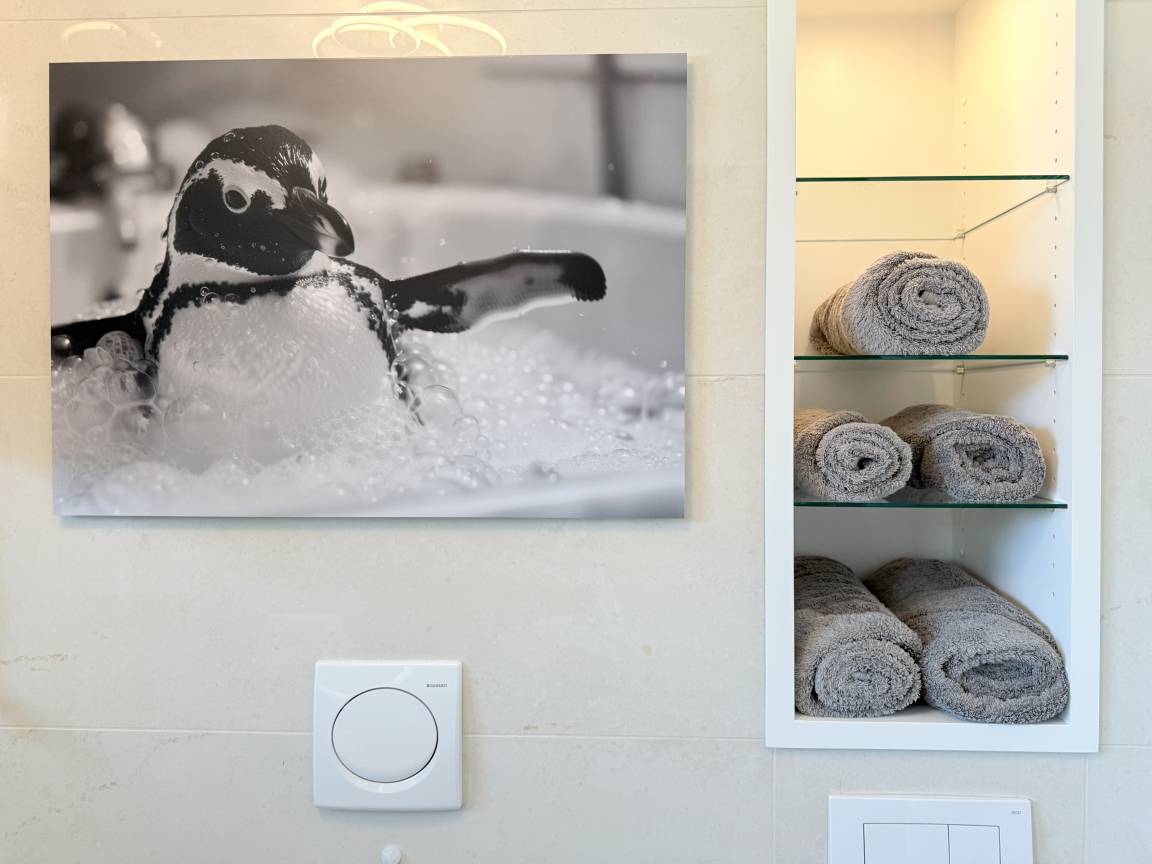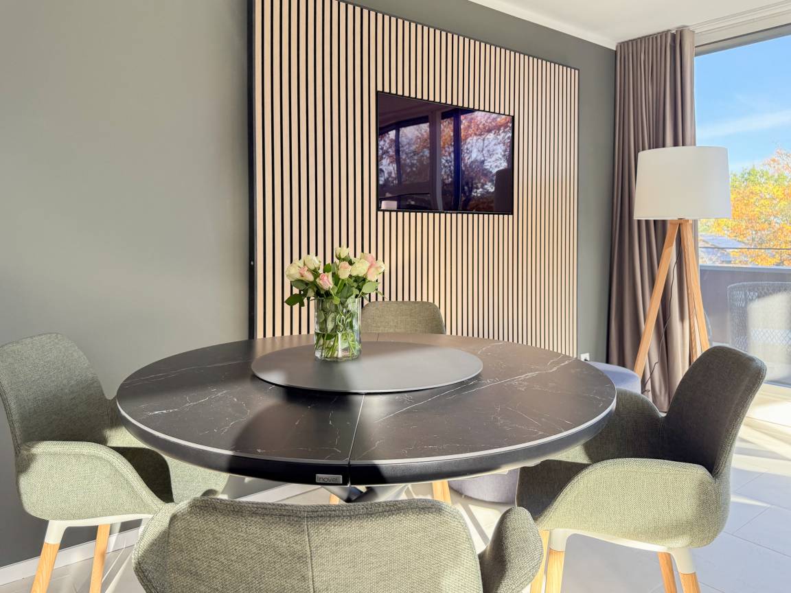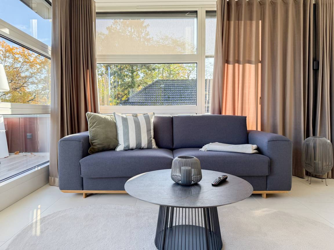 Das absolut neuwertige Penthouse begeistert durch ein stilvolles Interieur und eine luxuriöse Ausstattung. Umlaufende bodentiefe Fensterflächen sorgen für ein offenes Raumgefühl mit herrlichem Ausblick, teilweise bis auf die Ostsee. Genießen Sie viele entspannte Stunden auf der herrlichen Dachterrasse, die mit einem Essbereich, Sonnenschirmen und Loungebereich ausgestattet ist. Meeresrauschen und frische Seeluft inklusive! Der offen gestaltete Wohnbereich verfügt über ein komfortables Sofa mit Schlaffunktion, Smart-TV und Bluetooth-Radio. Der anschließende Essbereich bietet ausreichend Platz und die perfekt integrierte Designküche, bestens ausgestattet mit separatem Weinkühlschrank, lässt keine Wünsche offen. Das Schlafzimmer ist mit einem Doppelbett (180x200), einer Klimaanlage, Black-out-Plissees, einem Kleiderschrank mit ausreichend Stauraum und TV eingerichtet. Die Fenster im Wohnzimmer sind mit Vorhängen versehen und die Zugangstüren zur Dachterrasse, sowohl vom Schlafzimmer als auch vom Wohnzimmer, verfügen über Insektenschutzgitter. Das Duschbad ist geräumig, hochwertig und mit einem Fenster ausgestattet. Der Fahrstuhl führt von der Tiefgarage direkt in das Penthouse, sodass Urlaubsgepäck auf kurzem Wege bequem in die Wohnung gelangt. WLAN steht selbstverständlich kostenlos zur Verfügung.