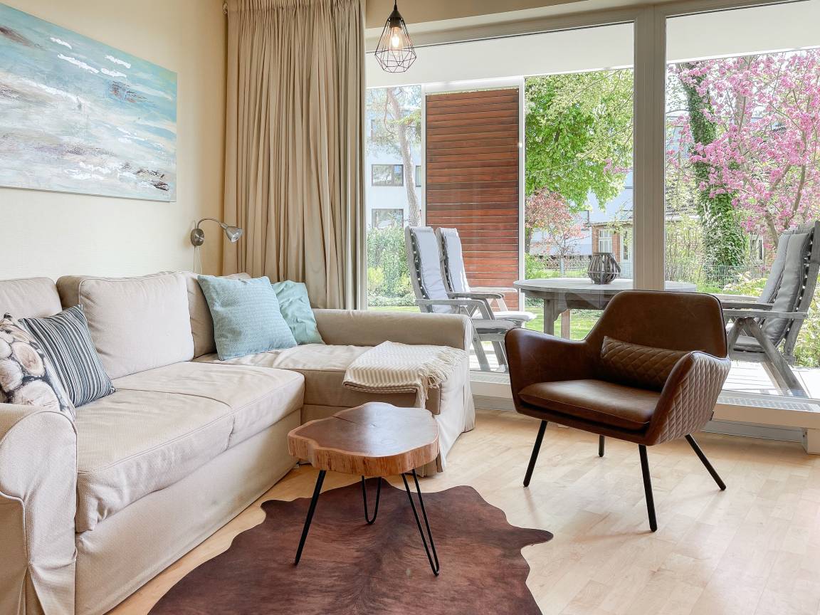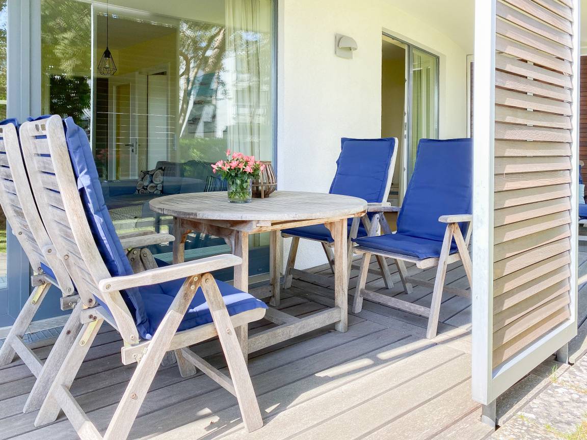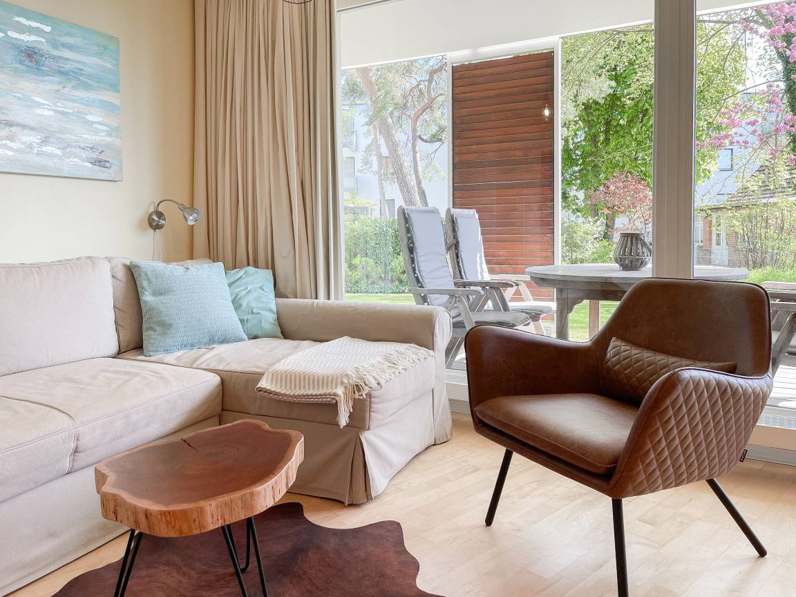 Bodentiefe Fensterflächen sorgen für helle Räumlichkeiten und die geschmackvolle Einrichtung in warmen Farben schafft eine angenehme Wohnatmosphäre. Die überdachte XXL Sonnenterrasse, die sich über die gesamte Breite der Wohnung erstreckt und mit hochwertigen Gartenmöbeln sowie Sonnenliegen ausgestattet ist,[nbsp][nbsp]macht diese Wohnung zu etwas Besonderem. Die angrenzende Rasenfläche kann ebenfalls genutzt werden. Im Wohnbereich erwartet Sie ein hochwertiges Sofa mit Schlaffunktion, TV, Radio und WLAN sowie ein Schreibtisch zur Erledigung wichtiger Korrespondenz. Der integrierte Essbereich ist für 3 Personen eingerichtet und die offene Einbauküche ist mit Backofen, Mikrowelle und Geschirrspüler bestens ausgestattet.[nbsp] Das Schlafzimmer verfügt über ein Doppelbett (180x200), einen geräumigen Schrank und TV.[nbsp] Alle Fenster sind mit Verdunkelungsvorhängen versehen. Das moderne Duschbad ist großzügig angelegt.