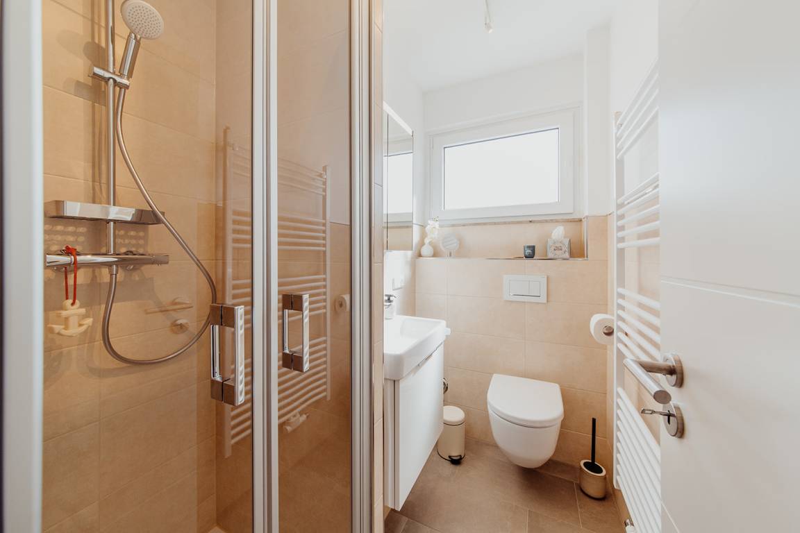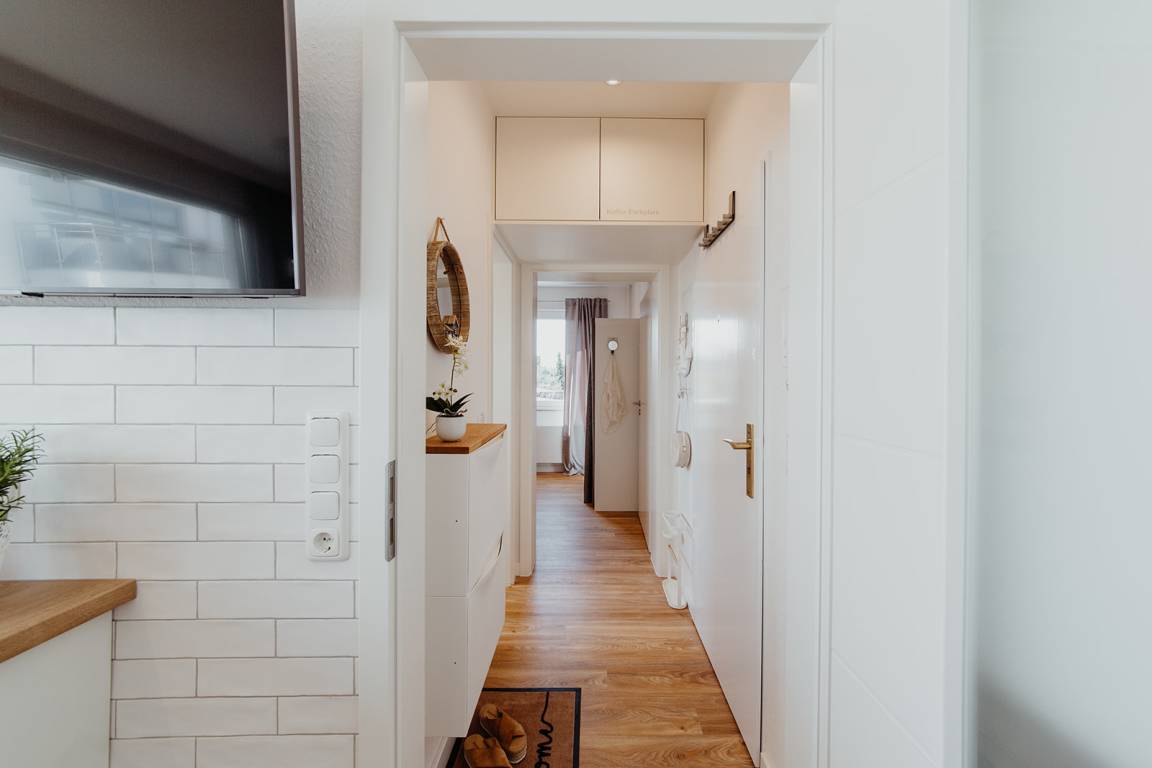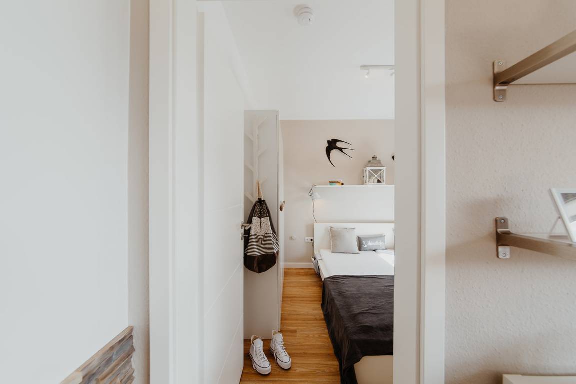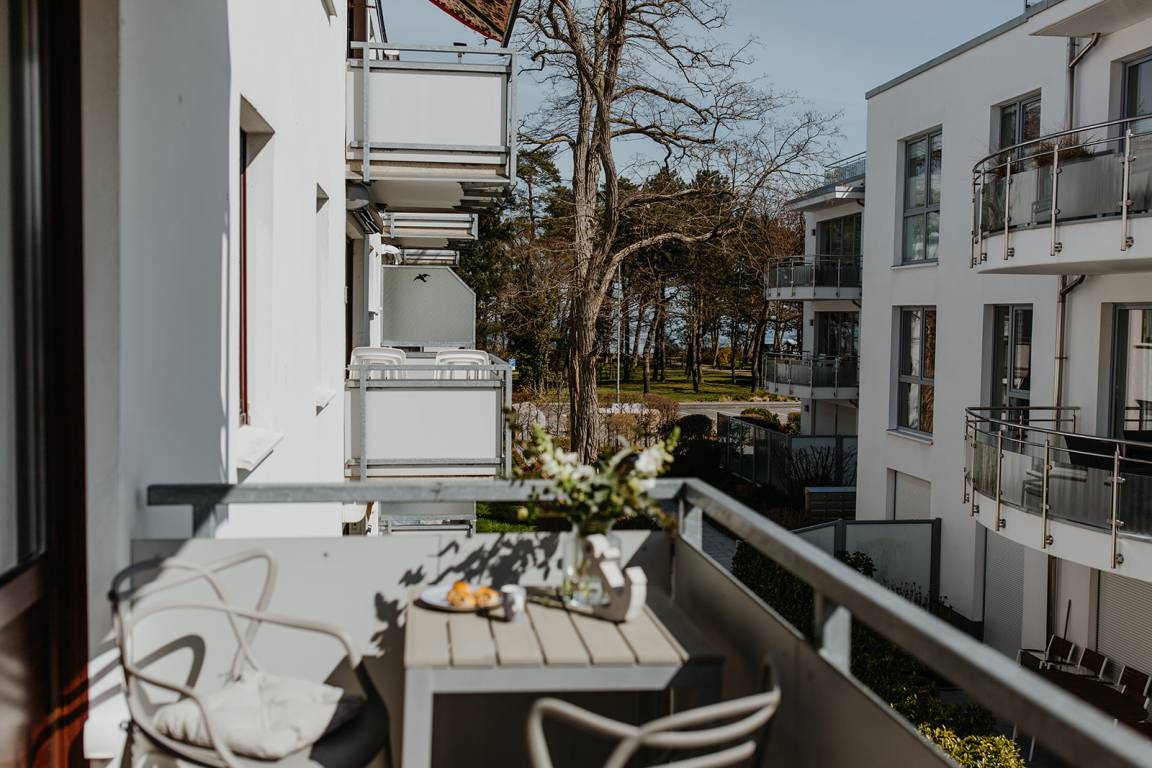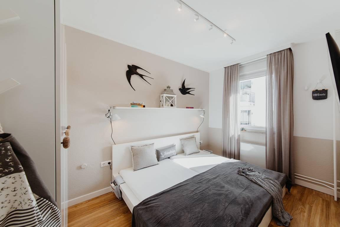 Klein aber fein, hell und freundlich und gespickt mit vielen liebevollen Details präsentiert sich die Ferienwohnung No. 188. Jeder qm ist optimal genutzt und mit ausreichend Ablageflächen, Stauraum und Haken versehen. Es gibt zwei separate Schlafzimmer, ausgestattet mit Doppelbett (180x200), Einzelbett mit Auszug (160x200), Verdunkelungsvorhängen und TV. Strandflair pur ist im Wohnbereich zu finden, der mit einem Sofa und einem Essbereich für 4 Personen ausgestattet ist. Die integrierte kleine Einbauküche fügt sich wunderbar ein und ist bestens ausgestattet. Vom vorgelagerten Sonnenbalkon mit elektrischer Markise und Gartenmöbeln kann man die Ostsee nicht nur hören sondern auch blitzen sehen.