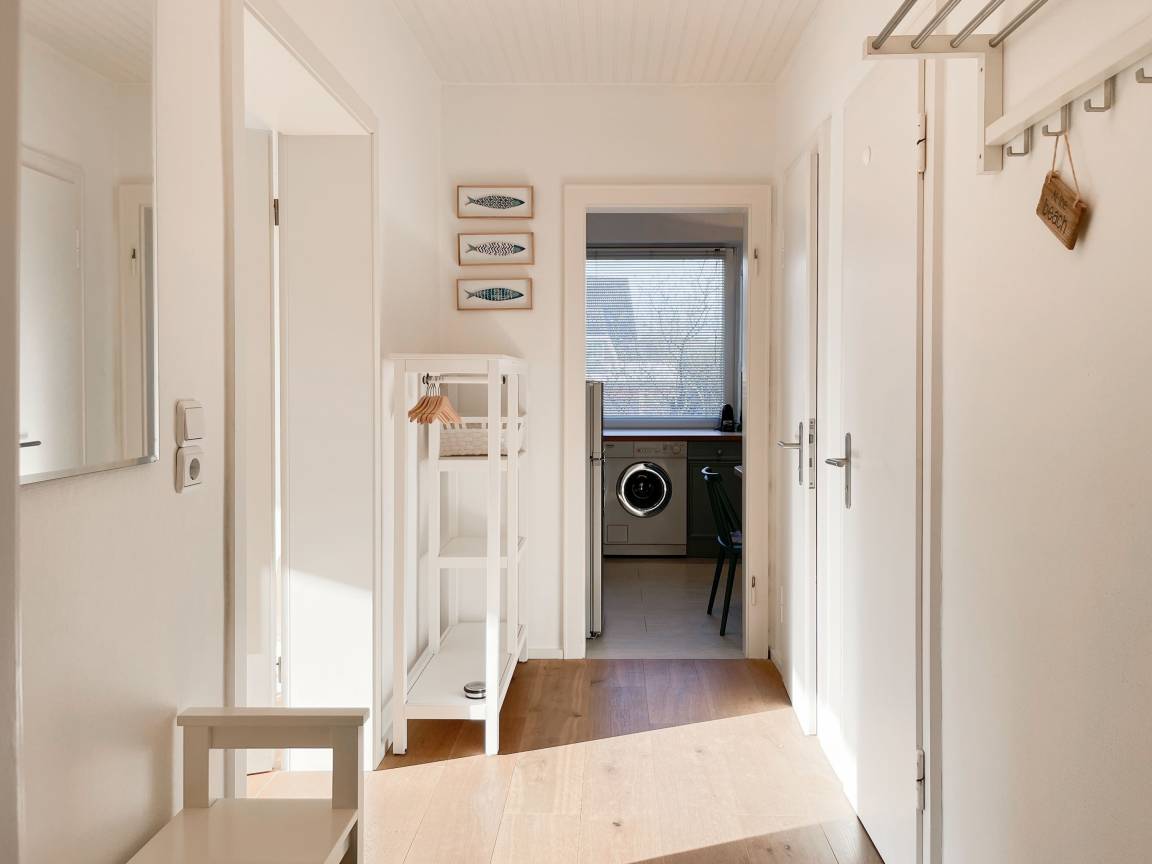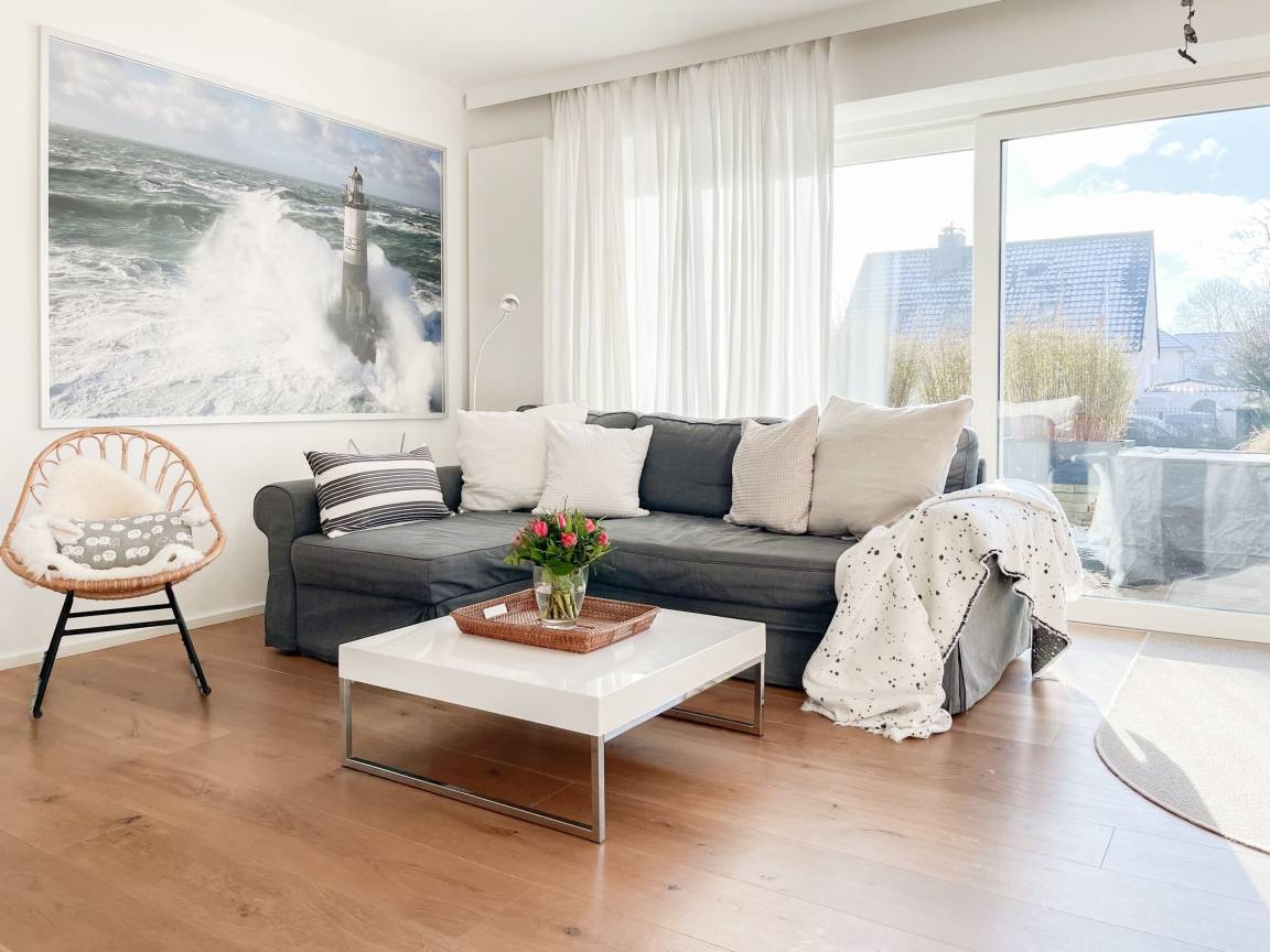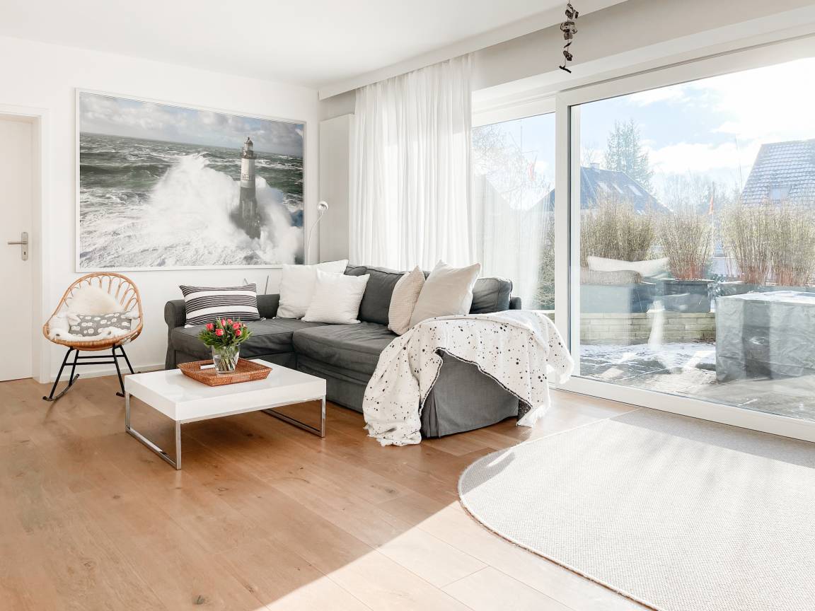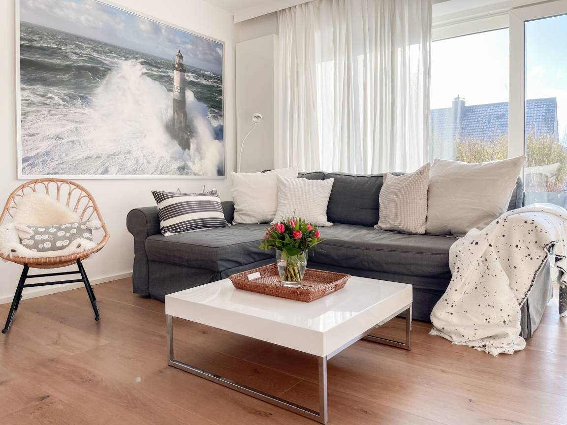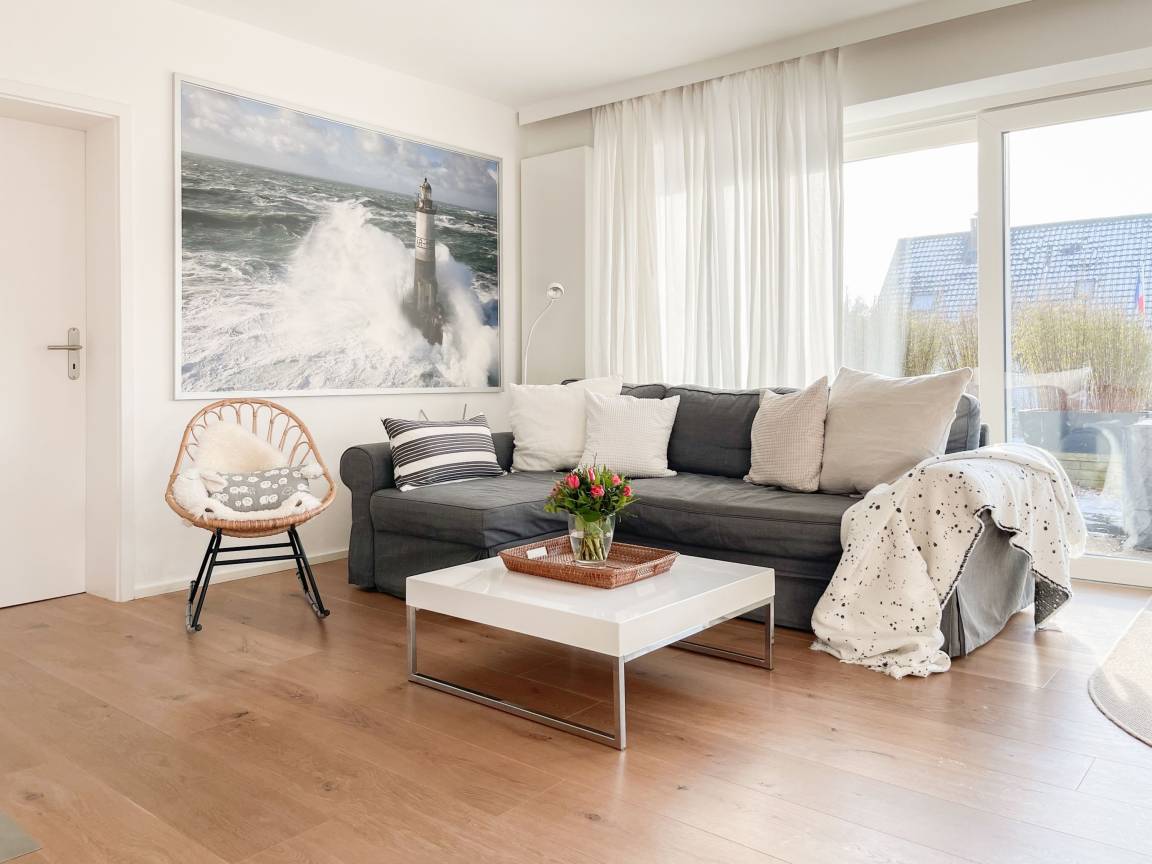 Es erwartet Sie ein geräumiger Wohnbereich, lichtdurchflutet mit bodentiefen Fensterelementen und Gartenblick, der mit einem Sofa mit Schlaffunktion und einem Schaukelstuhl eingerichtet ist. Der anschließende Essbereich bietet 6 Personen ausreichend Platz für gemeinsame Mahlzeiten, Spieleabende und gemütliches Beisammensein.Die separate Küche ist bestens ausgestattet mit Spülmaschine, Backofen, Induktionsfeld, Mikrowelle, Kühlschrank mit Gefrierfach sowie einer integrierten Waschmaschine und ist mit einem weiteren Essbereich für 4 Personen eingerichtet. Beide Schlafzimmer verfügen über ein Doppelbett (160x200) und Verdunkelungsvorhänge. In einem Schlafzimmer befindet sich[nbsp] ein großer Kleiderschrank mit ausreichend Stauraum für die Urlaubsgarderobe und es ist genügend Platz für ein Reisebettchen. In dem zweiten Schlafzimmer gibt es ein Regal und einen offenen Kleiderschrank im Flur. Das Tageslichtbad verfügt über eine Badewanne mit integrierter Dusche, Waschbecken und WC. Zusätzlich steht ein separates Gäste WC zur Verfügung.