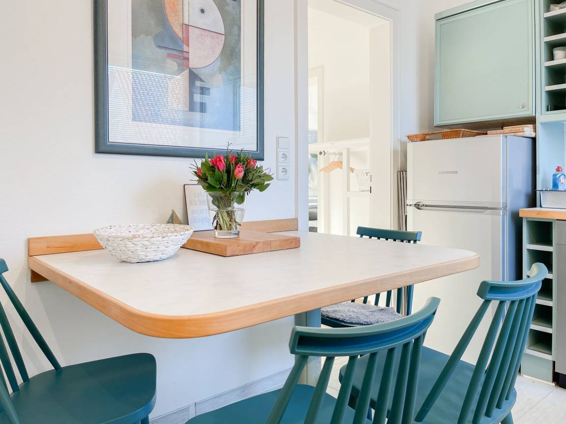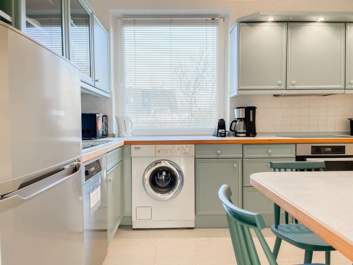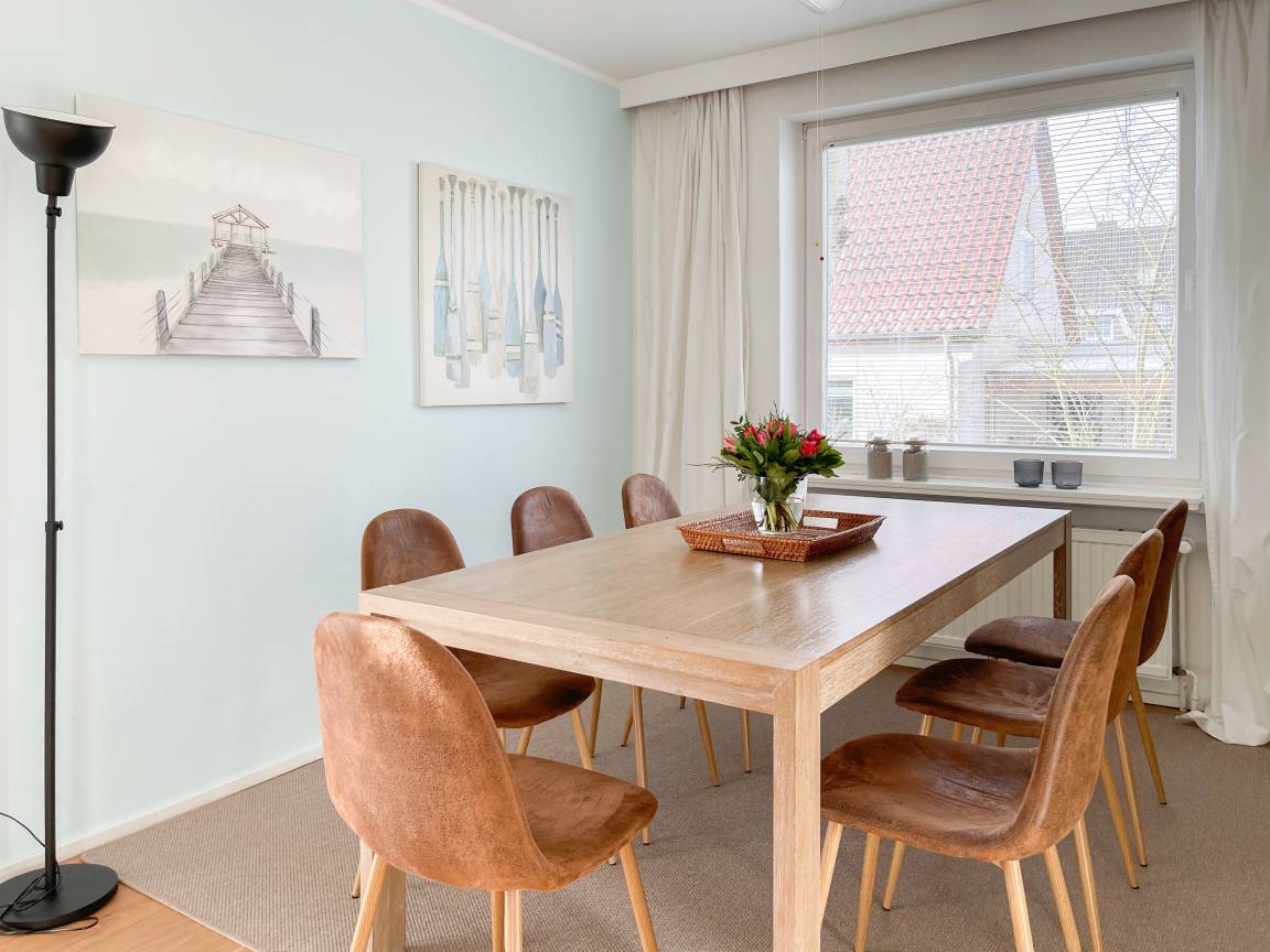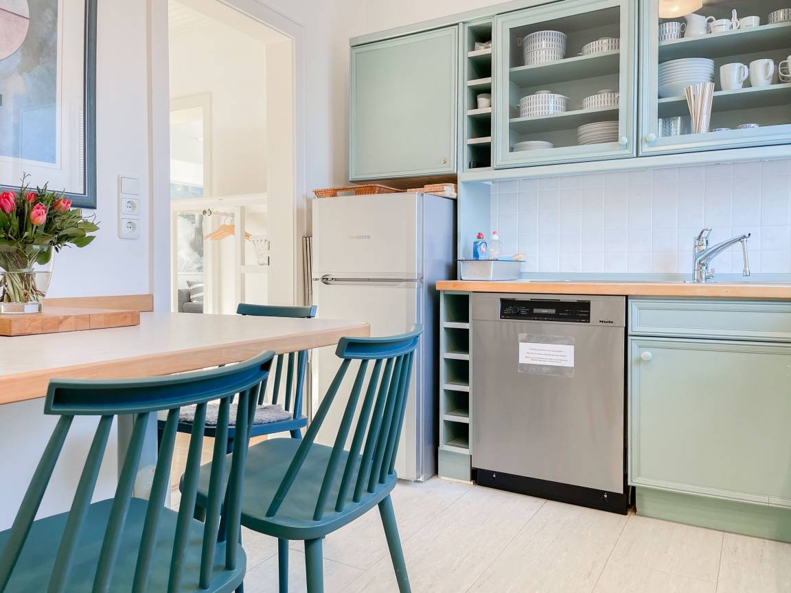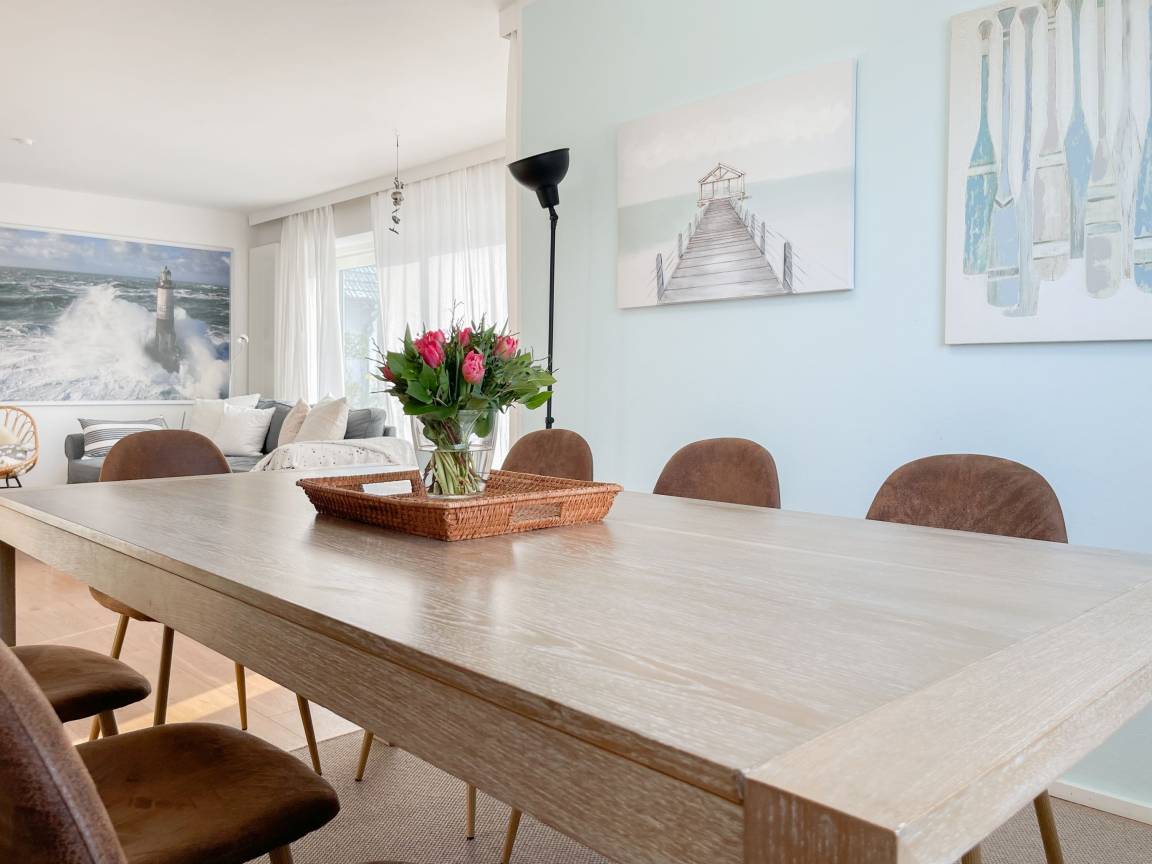 Es erwartet Sie ein geräumiger Wohnbereich, lichtdurchflutet mit bodentiefen Fensterelementen und Gartenblick, der mit einem Sofa mit Schlaffunktion und einem Schaukelstuhl eingerichtet ist. Der anschließende Essbereich bietet 6 Personen ausreichend Platz für gemeinsame Mahlzeiten, Spieleabende und gemütliches Beisammensein.Die separate Küche ist bestens ausgestattet mit Spülmaschine, Backofen, Induktionsfeld, Mikrowelle, Kühlschrank mit Gefrierfach sowie einer integrierten Waschmaschine und ist mit einem weiteren Essbereich für 4 Personen eingerichtet. Beide Schlafzimmer verfügen über ein Doppelbett (160x200) und Verdunkelungsvorhänge. In einem Schlafzimmer befindet sich[nbsp] ein großer Kleiderschrank mit ausreichend Stauraum für die Urlaubsgarderobe und es ist genügend Platz für ein Reisebettchen. In dem zweiten Schlafzimmer gibt es ein Regal und einen offenen Kleiderschrank im Flur. Das Tageslichtbad verfügt über eine Badewanne mit integrierter Dusche, Waschbecken und WC. Zusätzlich steht ein separates Gäste WC zur Verfügung.