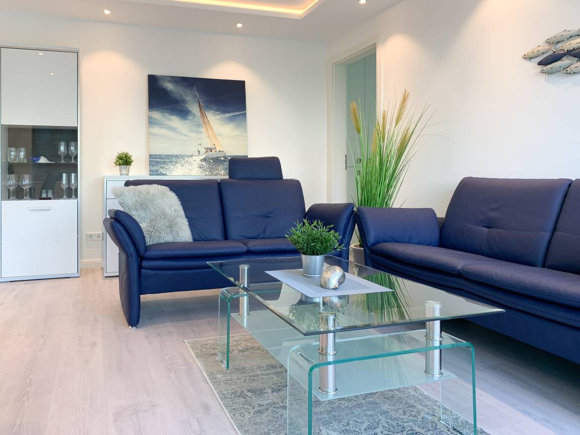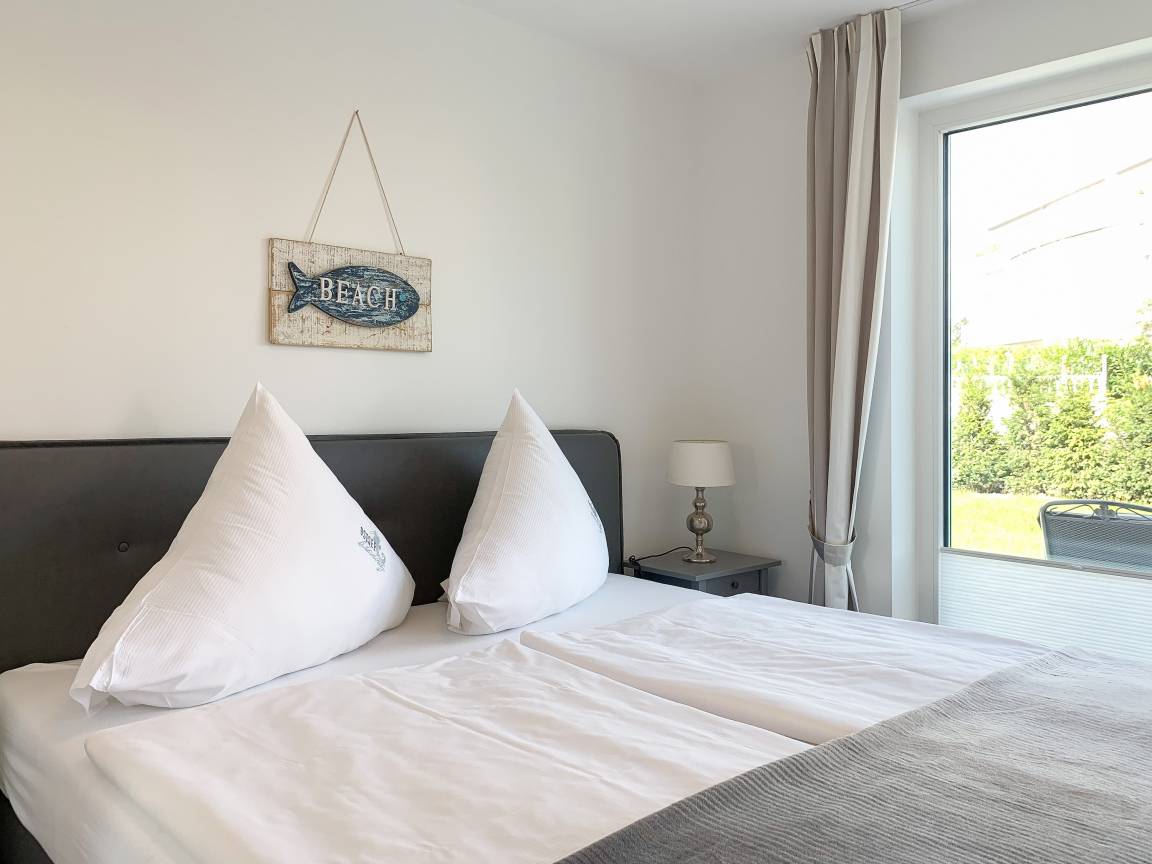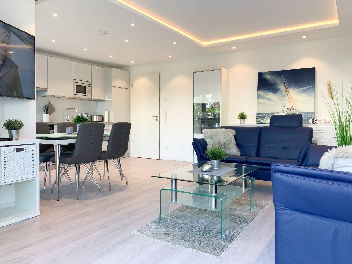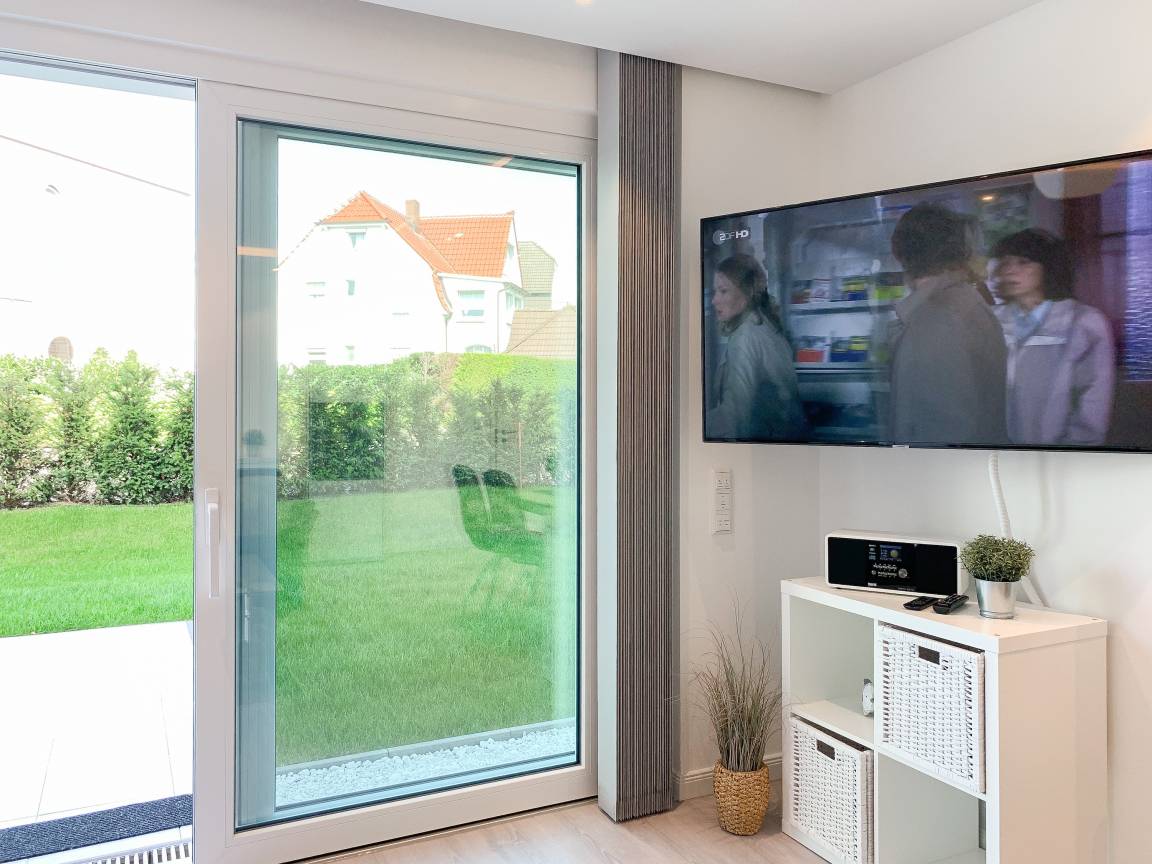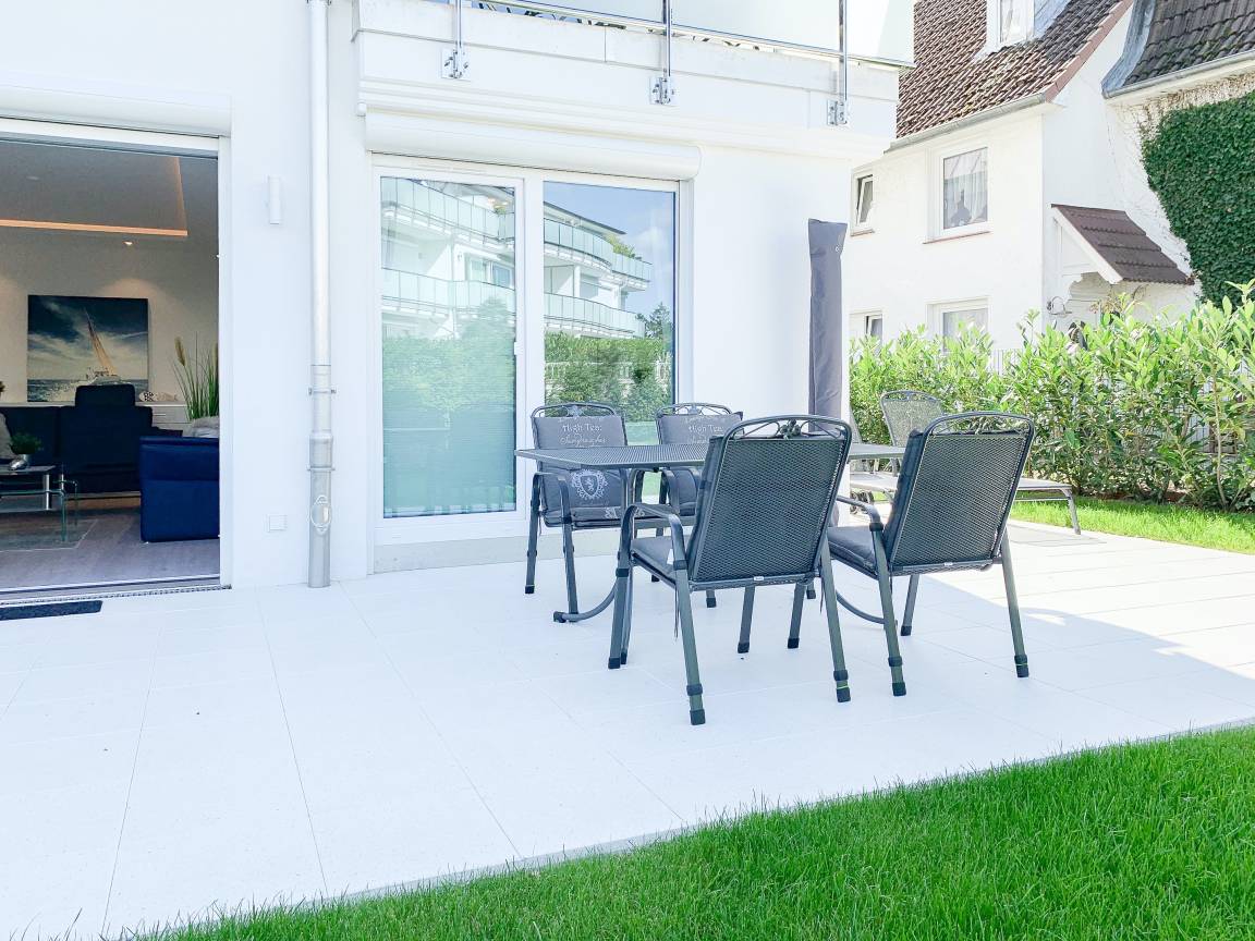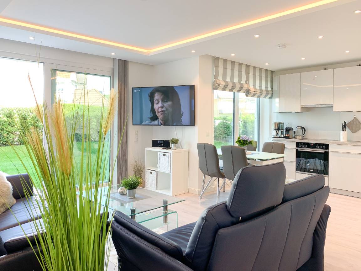 Die exklusive Wohnung bietet mit[nbsp] 2 separaten Schlafzimmern, einem modernen Duschbad sowie einem kombinierte Wohn- Essbereich mit offener Einbauküche ausreichend Platz für 3 bis 4 Personen. Sämtliche Annehmlichkeiten eines Neubaus wie bodentiefe Fensterflächen, Fußbodenheizung und elektrische Außenjalousien sorgen für helle Räumlichkeiten und ein angenehmes Raumklima. Die äußerst hochwertige Einrichtung mit durchdachten Einbauten, der bestens ausgestatteten Designküche mit entsprechenden Markengeräten und das Ruf Boxspringbett der Extraklasse zeichnen diese Wohnung besonders aus. Ein weiteres Highlight ist die 24 qm große, umlaufende[nbsp] Sonnenterrasse, ausgestattet mit Gartenmöbeln und Sonnenliegen und ein kleiner Garten, eingefriedet über Hecke und Büsche. Zur Unterhaltung[nbsp] stehen ein 55 Zoll TV mit Internet Mediathek, Bluetooth Lautsprecher, Radio und WLAN zur Verfügung. Kleine Hunde sind auf Anfrage willkommen.