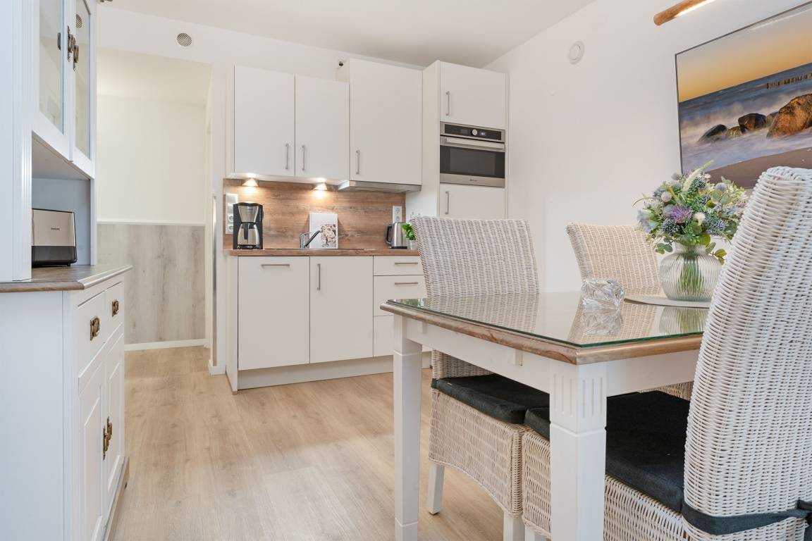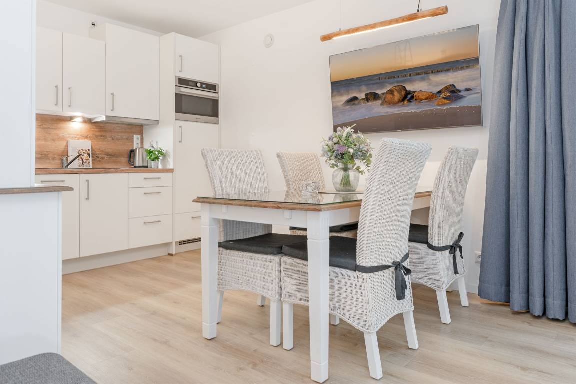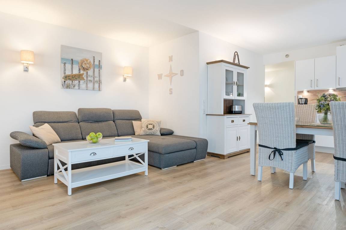 Genießen Sie Ihren Urlaub an der Ostseeküste in modernem Komfort. Die helle Wohnung verfügt über einen gemütlichen Wohnbereich mit Sofa, und TV. Der angrenzende Essbereich und die offene Küche bieten Platz für gemeinsame Mahlzeiten. Die Küche ist gut ausgestattet mit Induktionsherd, Backofen, Spülmaschine, Nespresso-Maschine, Kaffeemaschine, Toaster und Wasserkocher. Vom Wohnbereich aus gelangen Sie auf den überdachten Balkon in Südwestausrichtung – ideal, um die frische Ostseeluft bei jedem Wetter zu genießen. Das Schlafzimmer bietet zwei bequeme Einzelbetten (je 80x200 cm) und ausreichend Stauraum. Darüber hinaus befindet sich ein gemütliches Doppelschrankbett (140x200 cm) im Wohnbereich. Das Badezimmer ist modern eingerichtet und mit einer bodengleichen Dusche sowie einem beheizbaren Handtuchhalter ausgestattet.