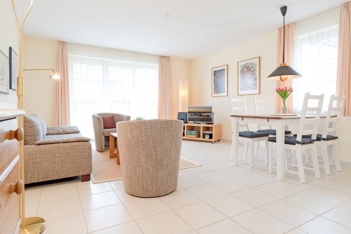 Im Herzen von Timmendorfer Strand liegt Ihr Urlaubsglück. Die kinderfreundliche Ferienwohnung besticht durch ihre gemütliche Einrichtung in warmen Farbtönen. Nehmen Sie im lichtdurchfluteten Wohnzimmer Platz und genießen Sie Ihre Auszeit auf dem kuscheligen Sofa oder den beiden Sesseln. Bei schönem Wetter lockt die möblierte Terrasse gleich nebenan. Die separate Küche mit Geschirrspüler ist gut ausgestattet und bringt sicher jeden Hobby-Koch zum Lächeln. Ihre leckeren Speisen können Sie im Wohnbereich genießen – die komfortable Ess-Ecke bietet sich aber auch für schöne Spiele-Abende an. Nach einem erlebnisreichen Tag an der Küste finden Sie in den beiden Schlafräumen eine wundervolle Nachtruhe: Ein Zimmer verfügt über ein Doppelbett (2x 90x200 cm). In dem anderen Zimmer stehen 2 Einzelbetten (je 90x200 cm). Beide Räume verfügen über genug Platz für ein zusätzliches Kinderreisebett. Das moderne Duschbad mit Fenster verspricht einen guten Start in den Tag.