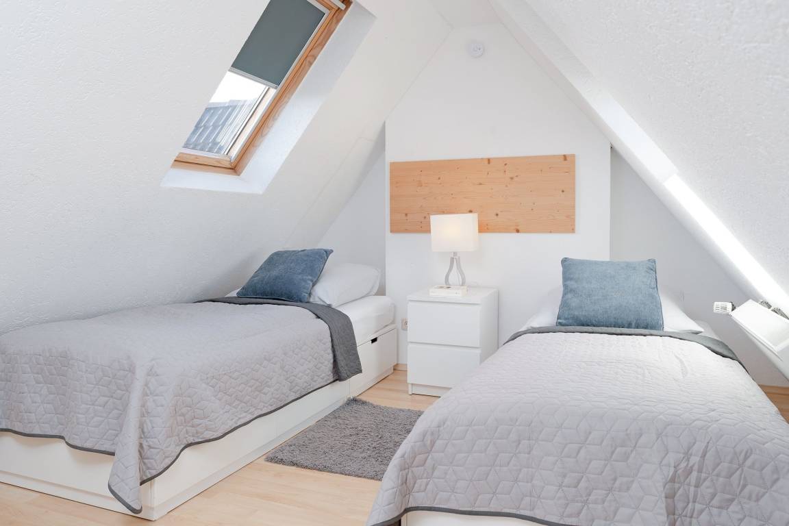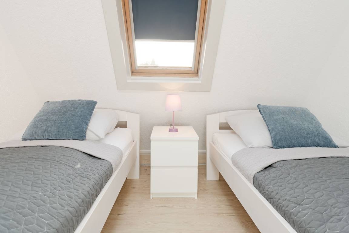 Schlafzimmer 2 im 1.OG: 2 Einzelbetten (je 90x200 cm), Verdunkelungsmöglichkeit: Verdunkelungsrollo, kein Platz für Babybett vorhanden