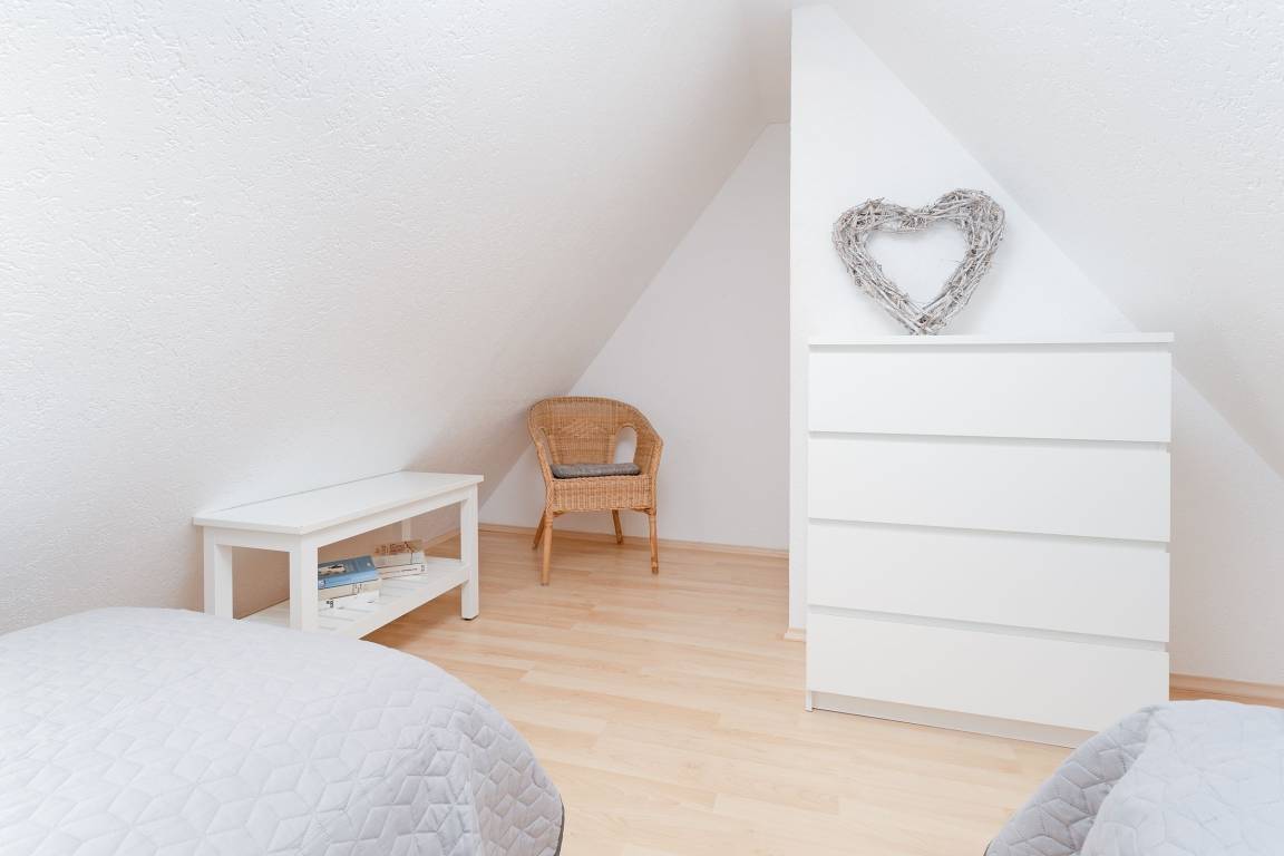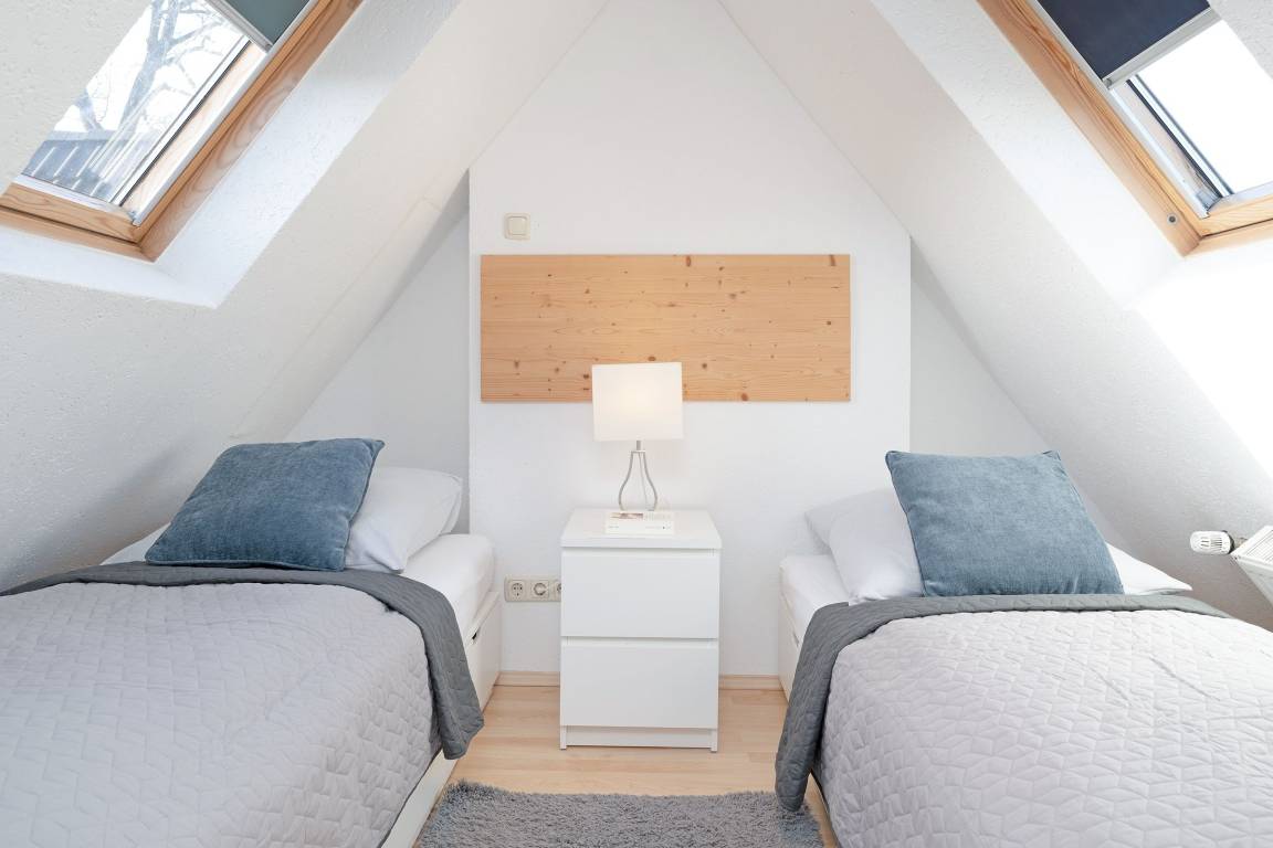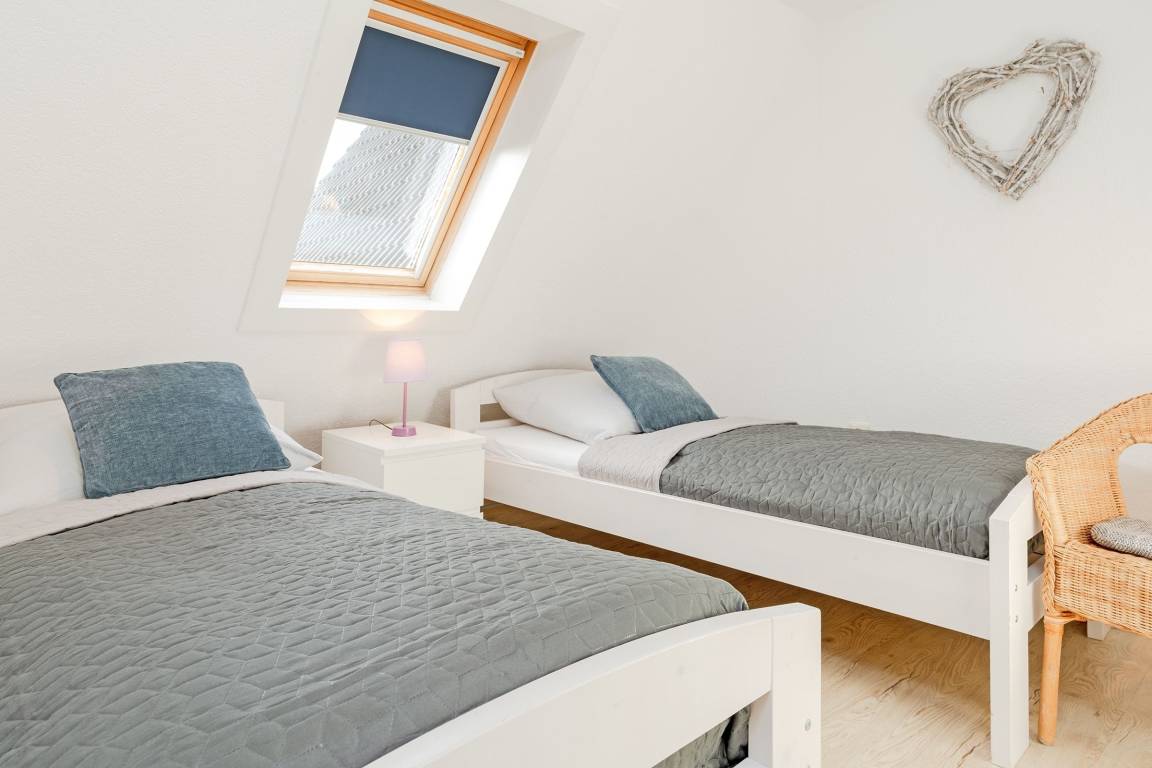 Schlafzimmer 3 im DG: 2 Einzelbetten (je 90x200 cm), Verdunkelungsmöglichkeit: Verdunkelungsrollo, Platz für Babybett vorhanden