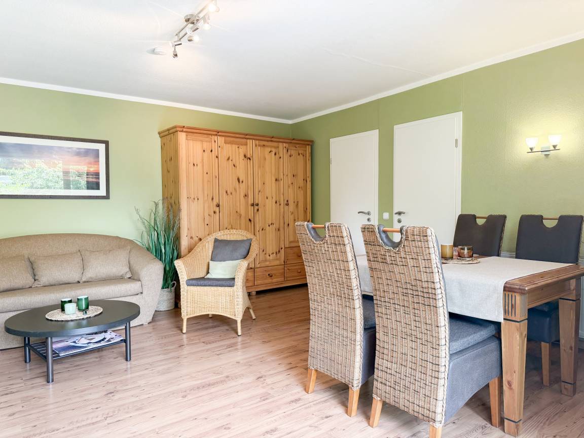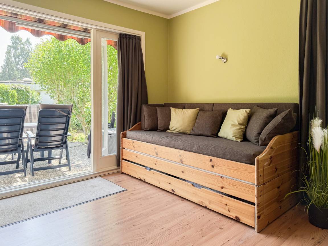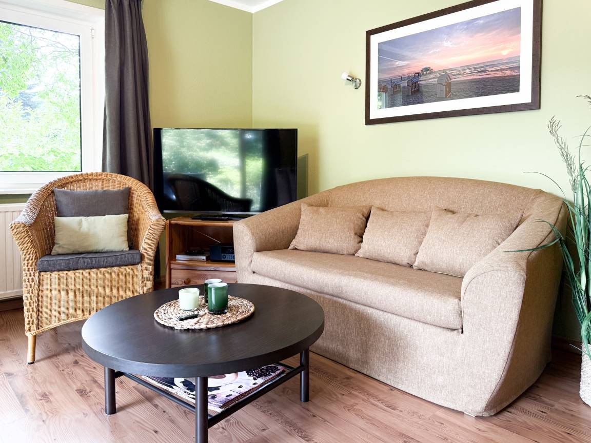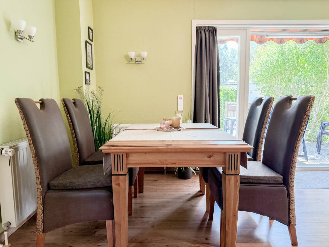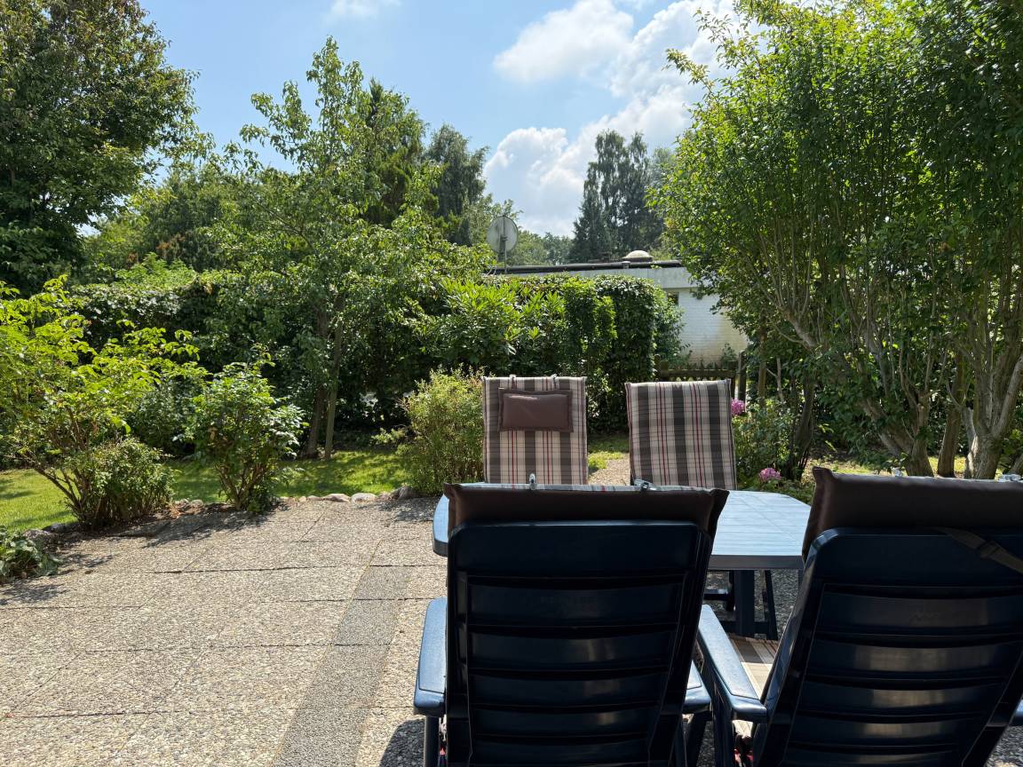 Das zweckmäßige Ferienhaus bietet einen wunderschönen eingewachsenen Garten mit altem Baumbestand an Obstbäumen und ist ein idealer Rückzugsort in Ostseenähe. Es eignet sich bestens für Paare oder Familien mit Kinder bis 4 Personen. Es erwartet Sie ein großzügiges Wohn- Esszimmer, eine voll ausgestattete Küche, ein Duschbad und eine große Terrasse in Südausrichtung mit Gartenmöbeln und Markise sowie ein weitläufiger Garten. Das separate Schlafzimmer verfügt über ein Doppelbett, Kleiderschrank und Vorhänge zur Abdunkelung. Im Wohnbereich ist zusätzlich ein Bettsofa (ausklappbar auf eine Ebene 180x200, 2 Einzelmatratzen ) für 2 Personen untergebracht, die Fenster sind ebenfalls mit Verdunklungvorhängen versehen. Ein Kinderreisebett und ein Hochstuhl sind ebenfalls vorhanden. WLAN steht kostenlos zur Verfügung, ein Parkplatz befindet sich auf dem Grundstück. Es stehen 4 Fahrräder (2x26 und 2x28) zur kostenlosen Nutzung zur Verfügung, sind jedoch nicht Bestandteil des Mietvertrages.