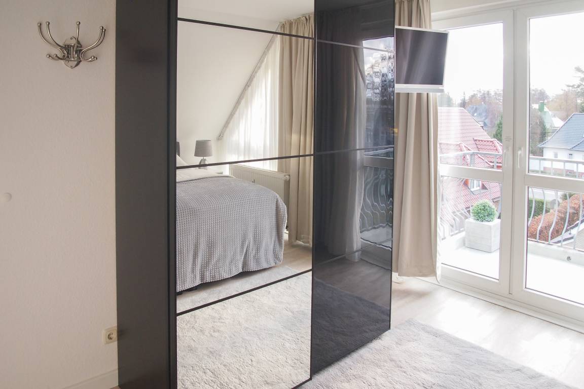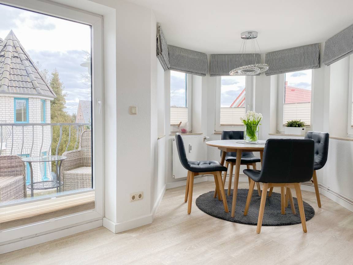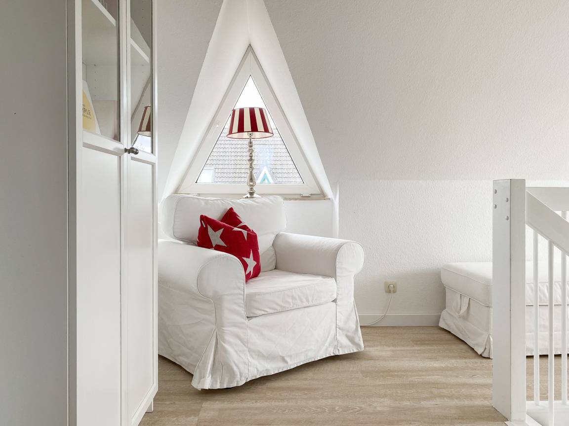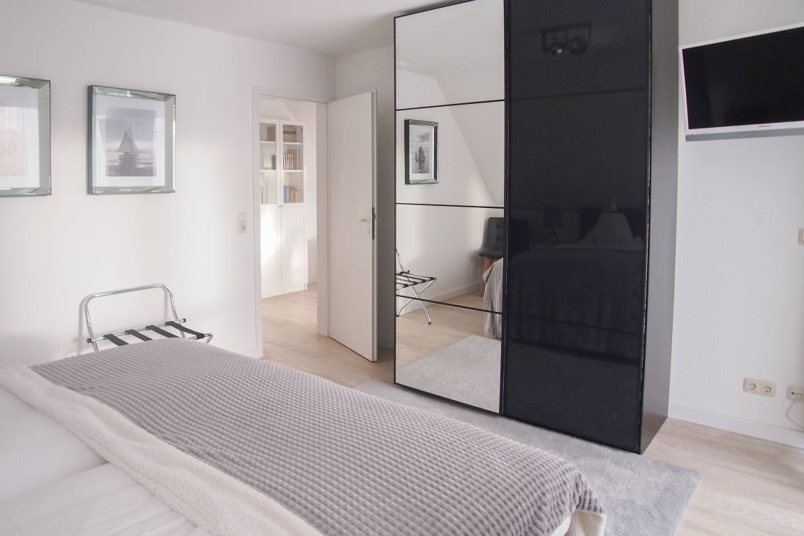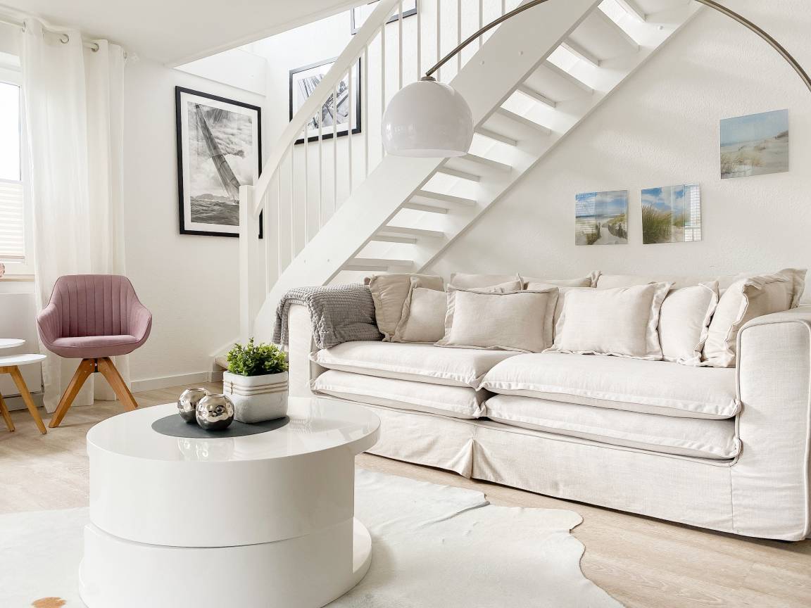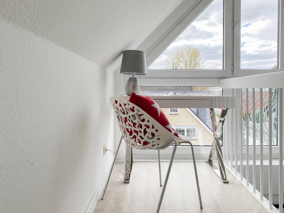Die Ferienwohnung präsentiert sich als wunderschönes, lichtdurchflutetes Loft über 2 Ebenen in Südausrichtung. Die Wohnung verfügt über zwei Balkone und befindet sich in der obersten Etage (2. OG) des Feriendomizils Strandburg. Die hochwertige, äußerst geschmackvolle Einrichtung vermittelt ein herrliches Wohngefühl. Auf der unteren Ebene befindet sich der gemütliche Wohnbereich mit Sonnenbalkon, TV, Musikanlage und WLAN, der anschließende Essbereich und die offene, bestens ausgestattete Wohnküche sowie ein Gäste WC und ein Abstellraum mit kombiniertem Waschtrockner. Auf der oberen Ebene gibt es zwei großzügige Schlafzimmer mit Boxspringbetten, eines mit Balkon und zusätzlichem TV, ein hochwertiges Duschbad und eine gemütliche Leseecke. Die Schlafräume lassen sich mittels Plissees und Vorhängen verdunkeln.